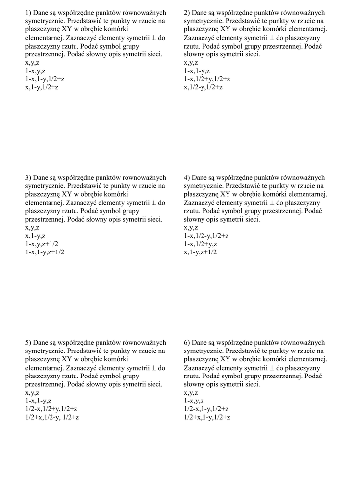 1) Dane są współrzędne punktów równoważnych symetrycznie. Przedstawić te punkty w rzucie na płaszczyznę XY w obrębie komórki elementarnej. Zaznaczyć elementy symetrii ⊥ do płaszczyzny rzutu. Podać symbol grupy przestrzennej. Podać słowny opis symetrii sieci. x,y,z 1-x,y,z 1-x,1-y,1/2+z x,1-y,1/2+z 2) Dane są współrzędne punktów równoważnych symetrycznie. Przedstawić te punkty w rzucie na płaszczyznę XY w obrębie komórki elementarnej. Zaznaczyć elementy symetrii ⊥ do płaszczyzny rzutu. Podać symbol grupy przestrzennej. Podać słowny opis symetrii sieci. x,y,z 1-x,1-y,z 1-x,1/2+y,1/2+z x,1/2-y,1/2+z 3) Dane są współrzędne punktów równoważnych symetrycznie. Przedstawić te punkty w rzucie na płaszczyznę XY w obrębie komórki elementarnej. Zaznaczyć elementy symetrii ⊥ do płaszczyzny rzutu. Podać symbol grupy przestrzennej. Podać słowny opis symetrii sieci. x,y,z x,1-y,z 1-x,y,z+1/2 1-x,1-y,z+1/2 4) Dane są współrzędne punktów równoważnych symetrycznie. Przedstawić te punkty w rzucie na płaszczyznę XY w obrębie komórki elementarnej. Zaznaczyć elementy symetrii ⊥ do płaszczyzny rzutu. Podać symbol grupy przestrzennej. Podać słowny opis symetrii sieci. x,y,z 1-x,1/2-y,1/2+z 1-x,1/2+y,z x,1-y,z+1/2 5) Dane są współrzędne punktów równoważnych symetrycznie. Przedstawić te punkty w rzucie na płaszczyznę XY w obrębie komórki elementarnej. Zaznaczyć elementy symetrii ⊥ do płaszczyzny rzutu. Podać symbol grupy przestrzennej. Podać słowny opis symetrii sieci. x,y,z 1-x,1-y,z 1/2-x,1/2+y,1/2+z 1/2+x,1/2-y, 1/2+z 6) Dane są współrzędne punktów równoważnych symetrycznie. Przedstawić te punkty w rzucie na płaszczyznę XY w obrębie komórki elementarnej. Zaznaczyć elementy symetrii ⊥ do płaszczyzny rzutu. Podać symbol grupy przestrzennej. Podać słowny opis symetrii sieci. x,y,z 1-x,y,z 1/2-x,1-y,1/2+z 1/2+x,1-y,1/2+z 7) Dane są współrzędne punktów równoważnych symetrycznie. Przedstawić te punkty w rzucie na płaszczyznę XY w obrębie komórki elementarnej. Zaznaczyć elementy symetrii ⊥ do płaszczyzny rzutu. Podać symbol grupy przestrzennej. Podać słowny opis symetrii sieci. x,y,z 1-x,y,z+1/2 1/2+x,1-y,z 1/2-x,1-y,z+1/2 8) Dane są współrzędne punktów równoważnych symetrycznie. Przedstawić te punkty w rzucie na płaszczyznę XY w obrębie komórki elementarnej. Zaznaczyć elementy symetrii ⊥ do płaszczyzny rzutu. Podać symbol grupy przestrzennej. Podać słowny opis symetrii sieci. x,y,z 1-x,1-y,z 1/2-x,1/2+y,z 1/2+x,1/2-y,z 9) Dane są współrzędne punktów równoważnych symetrycznie. Przedstawić te punkty w rzucie na płaszczyznę XY w obrębie komórki elementarnej. Zaznaczyć elementy symetrii ⊥ do płaszczyzny rzutu. Podać symbol grupy przestrzennej. Podać słowny opis symetrii sieci. 10) Dane są współrzędne punktów równoważnych symetrycznie. Przedstawić te punkty w rzucie na płaszczyznę XY w obrębie komórki elementarnej. Zaznaczyć elementy symetrii ⊥ do płaszczyzny rzutu. Podać symbol grupy przestrzennej. Podać słowny opis symetrii sieci. x,y,z 1-x,1-y,1/2+z 1/2-x,1/2+y,1/2+z 1/2+x,1/2-y,z x,y,z 1-x,1-y,z 1-x,y,1/2+z x,1-y,1/2+z 9) Dane są współrzędne punktów równoważnych symetrycznie. Przedstawić te punkty w rzucie na płaszczyznę XY w obrębie komórki elementarnej. Zaznaczyć elementy symetrii ⊥ do płaszczyzny rzutu. Podać symbol grupy przestrzennej. Podać słowny opis symetrii sieci. x,y,z 1-x,1-y,z 1/2-x,y,z 1/2+x,-y,z 10) Dane są współrzędne punktów równoważnych symetrycznie. Przedstawić te punkty w rzucie na płaszczyznę XY w obrębie komórki elementarnej. Zaznaczyć elementy symetrii ⊥ do płaszczyzny rzutu. Podać symbol grupy przestrzennej. Podać słowny opis symetrii sieci. x,y,z x,1/2-y,z+1/2 1-x,1/2+y,z 1-x,-y,z+1/2 11) Dane są współrzędne punktów równoważnych symetrycznie. Przedstawić te punkty w rzucie na płaszczyznę XY w obrębie komórki elementarnej. Zaznaczyć elementy symetrii ⊥ do płaszczyzny rzutu. Podać symbol grupy przestrzennej. Podać słowny opis symetrii sieci. x,y,z 1-x,1/2-y,z 1-x,1/2+y,z+1/2 x,1-y,z+1/2 12) Dane są współrzędne punktów równoważnych symetrycznie. Przedstawić te punkty w rzucie na płaszczyznę XY w obrębie komórki elementarnej. Zaznaczyć elementy symetrii ⊥ do płaszczyzny rzutu. Podać symbol grupy przestrzennej. Podać słowny opis symetrii sieci. x,y,z 1/2-x,1/2-y,1/2+z 1-x,y+1/2,z+1/2 1/2+x,1-y,z 13) Dane są współrzędne punktów równoważnych symetrycznie. Przedstawić te punkty w rzucie na płaszczyznę XY w obrębie komórki elementarnej. Zaznaczyć elementy symetrii ⊥ do płaszczyzny rzutu. Podać symbol grupy przestrzennej. Podać słowny opis symetrii sieci. x,y,z 1-x,1-y,z 1-x,1/2+y,1/2+z x,1/2-y,1/2+z 14) Dane są współrzędne punktów równoważnych symetrycznie. Przedstawić te punkty w rzucie na płaszczyznę XY w obrębie komórki elementarnej. Zaznaczyć elementy symetrii ⊥ do płaszczyzny rzutu. Podać symbol grupy przestrzennej. Podać słowny opis symetrii sieci. x,y,z 1-x,1-y,1/2+z 1/2-x,y,1/2+z 1/2+x,1-y,z 13) Dane są współrzędne punktów równoważnych symetrycznie. Przedstawić te punkty w rzucie na płaszczyznę XY w obrębie komórki elementarnej. Zaznaczyć elementy symetrii ⊥ do płaszczyzny rzutu. Podać symbol grupy przestrzennej. Podać słowny opis symetrii sieci. x,y,z 1-x,1-y,z 1-x,y,z x,1-y,z 1/2+x,1/2+y,z 1/2-x,1/2-y,z 1/2-x,1/2+y,z 1/2+x,1/2-y,z 14) Dane są współrzędne punktów równoważnych symetrycznie. Przedstawić te punkty w rzucie na płaszczyznę XY w obrębie komórki elementarnej. Zaznaczyć elementy symetrii ⊥ do płaszczyzny rzutu. Podać symbol grupy przestrzennej. Podać słowny opis symetrii sieci. x,y,z 1-x,1-y,z x,1-y,z 1-x,y,z 13) Dane są współrzędne punktów równoważnych symetrycznie. Przedstawić te punkty w rzucie na płaszczyznę XY w obrębie komórki eleme