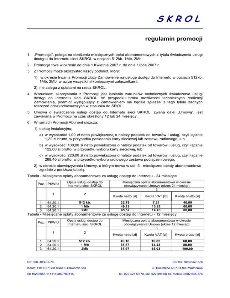 SKROL regulamin promocji 1. „Promocja”, polega na obniŜeniu miesięcznych opłat abonamentowych z tytułu świadczenia usługi dostępu do Internetu sieci SKROL w opcjach 512kb, 1Mb, 2Mb. 2. Promocja trwa w okresie od dnia 1 Kwietnia 2007 r. do dnia 1lipca 2007 r. 3. Z Promocji moŜe skorzystać kaŜdy podmiot, który: 1) w okresie trwania Promocji złoŜy Zamówienie na usługę dostęp do Internetu w opcjach 512kb, 1Mb, 2Mb wraz ze wszystkimi koniecznymi załącznikami, 2) nie zalega z opłatami na rzecz SKROL. 4. Warunkiem skorzystania z Promocji jest istnienie warunków technicznych świadczenia usługi dostęp do Internetu sieci SKROL. W przypadku braku moŜliwości technicznych realizacji Zamówienia, podmiot występujący z Zamówieniem nie będzie zgłaszał z tego tytułu Ŝadnych roszczeń odszkodowawczych w stosunku do SROL. 5. Umowa o świadczenie usługi dostęp do Internetu sieci SKROL, zwana dalej „Umową”, jest zawierana w Promocji na czas określony 12 lub 24 miesięcy. 6. W ramach Promocji Abonent uiszcza: 1) opłatę instalacyjną: a) w wysokości 1,00 zł netto powiększoną o naleŜy podatek od towarów i usług, czyli łącznie 1,22 zł brutto, w przypadku posiadania karty sieciowej lub zestawu radiowego, lub b) w wysokości 100,00 zł netto powiększoną o naleŜy podatek od towarów i usług, czyli łącznie 122,00 zł brutto, w przypadku wyboru karty sieciowej, lub c) w wysokości 220,00 zł netto powiększoną o naleŜy podatek od towarów i usług, czyli łącznie 268,40 zł brutto, w przypadku wyboru radiowego zestawu podłączeniowego, 2) w okresie obowiązywania Umowy, o którym mowa w ust. 5 - miesięczne opłaty abonamentowe zgodnie z poniŜszą tabelą: Tabela - Miesięczne opłaty abonamentowe za usługę dostęp do Internetu - 24 miesiące Poz. PKWiU 1. 2. 3. Opcja usługi dostęp do Internetu sieci SKROL 1 2 64.20.1 64.20.1 64.20.1 512 kb. 1 Mb 2Mb Miesięczna opłata abonamentowa w okresie obowiązywania Umowy (okres 24 miesiąc) 3 Kwota netto [zł] Kwota VAT [zł] Kwota brutto [zł] 32,79 49,18 65,57 7,21 10,82 14,43 40,00 60,00 80,00 Tabela - Miesięczne opłaty abonamentowe za usługę dostęp do Internetu - 12 miesięcy Poz. PKWiU 1. 2. 3. Opcja usługi dostęp do Internetu sieci SKROL 1 2 64.20.1 64.20.1 64.20.1 512 kb. 1 Mb 2Mb NIP 534-103-32-79 Konto: PKO BP COI SKROL Sławomir Koll 50 10205558 1111110860700115 Miesięczna opłata abonamentowa w okresie obowiązywania Umowy (okres 12 miesiąc) 3 Kwota netto [zł] Kwota VAT [zł] Kwota brutto [zł] 49,18 65,57 81,97 10,82 14,43 18,03 60,00 80,00 100,00 SKROL Sławomir Koll ul. Sokratesa 6/27 01-909 Warszawa tel. 022 423 59 70, fax. 022 896 08 48, mobile 0 602 645 876 SKROL 7. W czasie trwania umowy Abonent ma prawo do jednego miesiąca bezpłatnego abonamentu zwanego dalej „darmowy miesiąc”. Darmowy miesiąc liczony jest od pierwszego do ostatniego dnia danego miesiąca. Abonent na obowiązek poinformować operatora sieci o wyborze terminu darmowego miesiąca nie później niŜ do końca miesiąca poprzedzającego darmowy miesiąc 8. W związku z zawarciem Umowy w ramach Promocji, SKROL. przyznaje Abonentowi ulgę: 1) w opłacie instalacyjnej - w wysokości 300,00 zł netto (366,00 zł brutto), 2) w miesięcznej opłacie abonamentowej w wysokości wskazanej w poniŜszej tabeli, ulga pomniejsza miesięczne opłaty abonamentowe. Poz. PKWiU 1. 2. 3. Opcja usługi dostęp do Internetu sieci SKROL 1 2 64.20.1 64.20.1 64.20.1 512 kb. 1 Mb 2Mb Miesięczna ulga w opłatach abonamentowych w okresie obowiązywania Umowy 3 Kwota netto [zł] Kwota VAT [zł] Kwota brutto [zł] 60,00 80,00 100,00 13,20 17,60 22,00 73,20 97,60 122,00 9. W przypadku jednostronnego rozwiązania Umowy przez Abonenta lub przez SKROL. z winy Abonenta, przed upływem terminu, na jaki Umowa była zawarta, SKROL. ma prawo Ŝądać od Abonenta uiszczenia opłaty stanowiącej równowartość przyznanych Abonentowi ulg w wysokości określonej w ust. 8, za okres od dnia uruchomienia usługi dostęp do Internetu sieci SKROL do dnia rozwiązania Umowy. 10. JeŜeli Abonent, na 30 dni przed upływem okresu, na jaki Umowa została zawarta, nie zawiadomi SKROL., iŜ nie zamierza nadal korzystać z usługi dostęp do Internetu sieci SKROL, wówczas przyjmuje się, iŜ Umowa zostaje przedłuŜona na czas nieokreślony, a Abonent uiszcza miesięczne opłaty abonamentowe zgodnie z aktualnie obowiązującym Cennikiem usługi dostęp do Internetu sieci SKROL. 11. W okresie obowiązywania Umowy zawartej na czas określony 12 lub 24 miesięcy Abonent nie moŜe zmienić opcji usługi dostęp do Internetu sieci SKROL na niŜszą niŜ ta, na którą zawarł Umowę. 12. W okresie obowiązywania Umowy zawartej na czas określony 12 lub 24 miesiące Abonent moŜe zmieniać opcje usługi dostęp do Internetu sieci SKROL na wyŜszą niŜ ta, na którą zawarł Umowę. 13. Po zmianie opcji na wyŜszą w okresie obowiązywania Umowy zawartej na czas określony 12 lub 24 miesiące Abonent będzie ponosił opłaty abonamentowe dla danej opcji zgodnie z ust. 6 pkt 2 w Tabeli – miesięczne opłaty abonamentowe za usługę dostęp do Internetu sieci SKROL, w kolumnie 3, w zaleŜności od okresu świadczenia usługi dostęp do Internetu sieci SKROL. 14. Do świadczenia usługi dostęp do Internetu sieci SKROL w ramach Promocji, zastosowanie mają postanowienia zawarte w Cenniku usługi dostęp do Internetu sieci SKROL. oraz w Regulaminie korzystania z usługi dostęp do Internetu sieci SKROL świadczonej przez SKROL, o ile niniejszy Regulamin nie stanowi inaczej. NIP 534-103-32-79 Konto: PKO BP COI SKROL Sławomir Koll 50 10205558 1111110860700115 SKROL Sławomir Koll ul. Sokratesa 6/27 01-909 Warszawa tel. 022 423 59 70, fax. 022 896 08 48, mobile 0 602 645 876