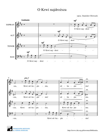 O Krwi najdroższa oprac. Stanisław Głowacki SOPRAN Andante mf O Krwi naj - droż ALT TENOR BAS sza, - sza, - sza, - sza, - piu f Krwi od - ku - pie - nia, Krwi od - ku - pie - - nia, - - - od - - - - ku - pie - nia! pie - nia. - nia. ku - Krwi od - ku - pie Krwi od - ku - pie - - od - - - - nia! - - Krwi od - ku - pie - O Krwi naj - droż 4 droż O Krwi naj - droż mf O Krwi naj- mf - mf - - - nia! http://www.idn.org.pl/towmuz/biblioteka mormorando pp 2 8 A a a a pp A a a a mf O Krwi naj-droż - sza, o Krwi od-ku -pie - nia, na - po - ju ży - cia z nie -ba dla nas da - ny, pp A a a O zdro -ju łas - ki, o ce - no zba-wie - nia, Ty le - czysz ra O zdro -ju łas - ki, o ce - no zba-wie - nia, Ty grze -cho - we le - czysz ra o zdro-ju łas - ki, o ce-no zba-wie- nia, Ty grze-cho-we le o zdro - ju łas - ki, o ce - no zba-wie - nia, Ty a mf 12 - czysz le - czysz - - ny. - ra ra - - ny. ny. ny. http://www.idn.org.pl/towmuz/biblioteka Ø CODA 16 O Krwi naj- droż mf mf O Krwi naj - droż pie od - nia, pie pie - nia, - - nia, - - ku - pie ku - - pie - - nia, Krwi od - ku- pie Krwi od - ku - pie - - - nia, - nia, - nia, piu f Krwi od-ku- sza, - - od - - 20 - - - O Krwi naj - droż mf sza, O Krwi naj - droż - 3 - Krwi od-ku- sza, Krwi od-ku- sza, rit. Krwi od - ku - pie - Krwi od - ku - pie - Krwi od - ku - pie - Krwi od - ku - pie - nia. nia. nia! nia! http://www.idn.org.pl/towmuz/biblioteka 4 2. Tyś w Jezusowym kielichu zamknięta, abyś nas wszystkich życiem napawała, abyś dla świata, Krwi Boska prześwięta, miłosierdzie wybłagała! 3. O Krwi najdroższa, przez serce przeczyste, gdzie Twoje źródło miałaś na tej ziemi, cześć Tobie niesiem, dzięki wiekuiste, z aniołami, ze świętymi. http://www.idn.org.pl/towmuz/biblioteka