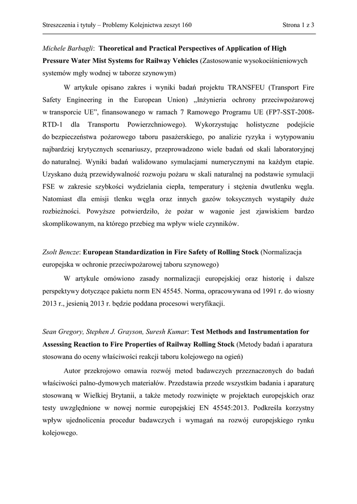 Streszczenia i tytuły – Problemy Kolejnictwa zeszyt 160 Strona 1 z 3 Michele Barbagli: Theoretical and Practical Perspectives of Application of High Pressure Water Mist Systems for Railway Vehicles (Zastosowanie wysokociśnieniowych systemów mgły wodnej w taborze szynowym) W artykule opisano zakres i wyniki badań projektu TRANSFEU (Transport Fire Safety Engineering in the European Union) „Inżynieria ochrony przeciwpożarowej w transporcie UE”, finansowanego w ramach 7 Ramowego Programu UE (FP7-SST-2008RTD-1 dla Transportu Powierzchniowego). Wykorzystując holistyczne podejście do bezpieczeństwa pożarowego taboru pasażerskiego, po analizie ryzyka i wytypowaniu najbardziej krytycznych scenariuszy, przeprowadzono wiele badań od skali laboratoryjnej do naturalnej. Wyniki badań walidowano symulacjami numerycznymi na każdym etapie. Uzyskano dużą przewidywalność rozwoju pożaru w skali naturalnej na podstawie symulacji FSE w zakresie szybkości wydzielania ciepła, temperatury i stężenia dwutlenku węgla. Natomiast dla emisji tlenku węgla oraz innych gazów toksycznych wystąpiły duże rozbieżności. Powyższe potwierdziło, że pożar w wagonie jest zjawiskiem bardzo skomplikowanym, na którego przebieg ma wpływ wiele czynników. Zsolt Bencze: European Standardization in Fire Safety of Rolling Stock (Normalizacja europejska w ochronie przeciwpożarowej taboru szynowego) W artykule omówiono zasady normalizacji europejskiej oraz historię i dalsze perspektywy dotyczące pakietu norm EN 45545. Norma, opracowywana od 1991 r. do wiosny 2013 r., jesienią 2013 r. będzie poddana procesowi weryfikacji. Sean Gregory, Stephen J. Grayson, Suresh Kumar: Test Methods and Instrumentation for Assessing Reaction to Fire Properties of Railway Rolling Stock (Metody badań i aparatura stosowana do oceny właściwości reakcji taboru kolejowego na ogień) Autor przekrojowo omawia rozwój metod badawczych przeznaczonych do badań właściwości palno-dymowych materiałów. Przedstawia przede wszystkim badania i aparaturę stosowaną w Wielkiej Brytanii, a także metody rozwinięte w projektach europejskich oraz testy uwzględnione w nowej normie europejskiej EN 45545:2013. Podkreśla korzystny wpływ ujednolicenia procedur badawczych i wymagań na rozwój europejskiego rynku kolejowego. Streszczenia i tytuły – Problemy Kolejnictwa zeszyt 160 Strona 2 z 3 Eric Guillaume, Anycée Camillo, Alain Sainrat: Application of Fire Safety Engineering to Rolling Stock (Wkład i ograniczenia w zakresie inżynierii bezpieczeństwa pożarowego do oceny poziomu bezpieczeństwa pożarowego w pociągach europejskich) W artykule omówiono zakres i wyniki finansowanego w ramach 7 Ramowego Programu UE (FP7-SST-2008-RTD-1 dla Transportu Powierzchniowego) projektu TRANSFEU (Transport Fire Safety Engineering in the European Union) „Inżynieria ochrony przeciw-pożarowej w transporcie UE”. W projekcie wykorzystano holistyczne podejście do bezpieczeństwa pożarowego taboru pasażerskiego. Po analizie ryzyka i wytypowaniu najbardziej krytycznych scenariuszy, przeprowadzono wiele badań, od skali laboratoryjnej do naturalnej, których wyniki na każdym etapie walidowano symulacjami numerycznymi. Uzyskano dużą przewidywalność rozwoju pożaru w skali naturalnej na podstawie symulacji FSE w zakresie szybkości wydzielania ciepła, temperatury i stężenia dwutlenku węgla. Natomiast dla emisji tlenku węgla oraz innych gazów toksycznych wystąpiły duże rozbieżności. Powyższe potwierdziło, że pożar w wagonie jest zjawiskiem bardzo skomplikowanym, na którego przebieg ma wpływ wiele czynników. Michael Klinger: Modern Trends of Fire Protection in Rolling Stock 2013 (Systemy wykrywania pożaru do zastosowań w taborze szynowym 2013) Autor na wstępie podkreśla, że kluczową rolę w ochronie życia ludzkiego oraz zabezpieczeniu przed stratami materialnymi w przypadku ewentualnego pożaru odgrywa sprawne i wczesne jego wykrywanie. Następnie omawia zjawiska fizyczne wykorzystane w różnych technikach detekcji stosowanych w pojazdach szynowych, przedstawiając również konkretne praktyczne rozwiązania. W artykule Autor uwzględnia również wpływ właściwego rozmieszczenia czujek na efektywność działania instalacji, a także prezentuje wyniki badań ich skuteczności. Krzysztof Pikulski: Low Pressure Water Mist Fire Protection System (Niskociśnieniowy system mgły wodnej do ochrony przeciwpożarowej) W artykule opisano poszukiwania nowych i jednocześnie tanich środków gaśniczych. Autor udowadnia, że najpowszechniejszym, najtańszym i obojętnym dla środowiska naturalnego, a równocześnie skutecznym środkiem gaśniczym jest woda, której stosowanie w postaci mgły wodnej zdecydowanie ogranicza powstawanie strat popożarowych. Streszczenia i tytuły – Problemy Kolejnictwa zeszyt 160 Strona 3 z 3 W artykule omówiono polską technologię generowania mgły niskociśnieniowej oraz możliwe obszary zastosowania mgły wodnej w systemach ochrony pożarowej. Jolanta Maria Radziszewska-Wolińska: Development of Requirements for Fire Protection of Rol-ling Stock in Poland and ITS Comparison with EN 45545 (Rozwój wymagań w zakresie ochrony przeciwpożarowej taboru szynowego w Polsce i ich porównanie z EN 45545) Przedstawiono rozwój prac w zakresie bezpieczeństwa pożarowego taboru szynowego w Polsce oraz kierunki działań w tym obszarze podjęte w Europie. Scharakteryzowano zakres nowej normy EN 45545 oraz porównano podejście jej Części 2, dotyczącej wymagań dla materiałów i elementów w zakresie właściwości palnych, z dotychczasowymi wymaganiami polskimi według PN-K-02511. Wykazano bardziej szczegółowe podejście europejskie. Zawiera ono większe zróżnicowanie zakresu badań i wymagań dla poszczególnych elementów pojazdów. Przedstawiono wyniki wstępnych badań porównawczych dla kilkunastu materiałów przetestowanych według PN, które poddano badaniom według 