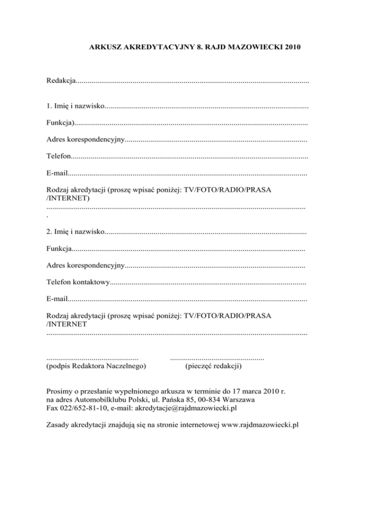 ARKUSZ AKREDYTACYJNY 8. RAJD MAZOWIECKI 2010 Redakcja
