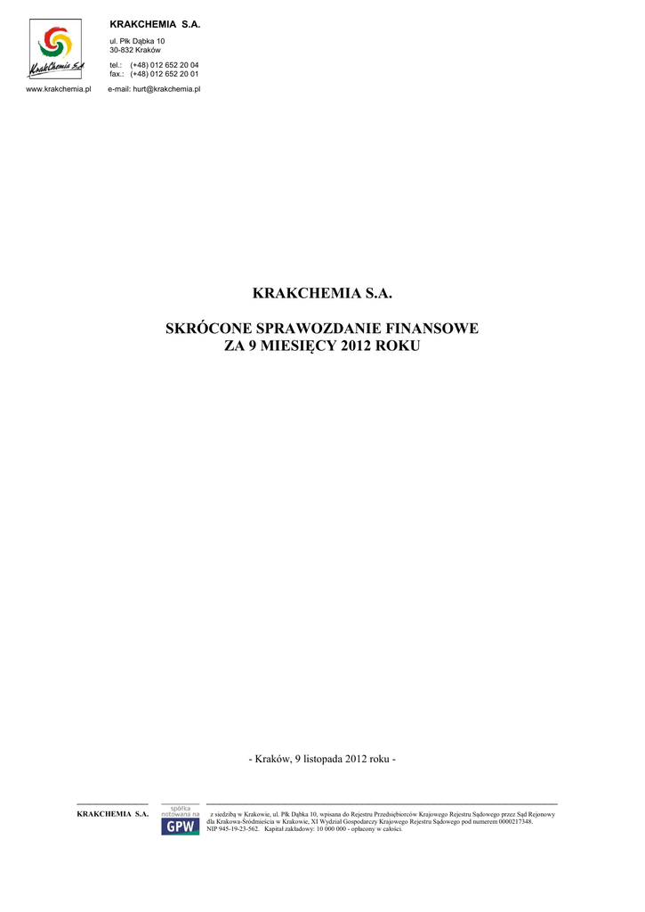 KRAKCHEMIA S.A. ul. Płk Dąbka 10 30-832 Kraków tel.: (+48) 012 652 20 04 fax.: (+48) 012 652 20 01 www.krakchemia.pl e-mail: [email protected] KRAKCHEMIA S.A. SKRÓCONE SPRAWOZDANIE FINANSOWE ZA 9 MIESIĘCY 2012 ROKU - Kraków, 9 listopada 2012 roku - ___________ KRAKCHEMIA S.A. ________________________________________________________ z siedzibą w Krakowie, ul. Płk Dąbka 10, wpisana do Rejestru Przedsiębiorców Krajowego Rejestru Sądowego przez Sąd Rejonowy dla Krakowa-Śródmieścia w Krakowie, XI Wydział Gospodarczy Krajowego Rejestru Sądowego pod numerem 0000217348. NIP 945-19-23-562. Kapitał zakładowy: 10 000 000 - opłacony w całości. KRAKCHEMIA S.A. –SKRÓCONE SPRAWOZDANIE FINANSOWE ZA 9 MIESIĘCY 2012 ROKU (wszystkie kwoty wyrażone są w tys. PLN o ile nie podano inaczej) INDEKS DO SPRAWOZDANIA FINANSOWEGO SPRAWOZDANIE Z WYNIKU I POZOSTAŁE CAŁKOWITE DOCHODY .......................................... - 3 SPRAWOZDANIE Z SYTUACJI FINANSOWEJ ....................................................................................... - 4 SPRAWOZDANIE ZE ZMIAN W KAPITALE WŁASNYM ...................................................................... - 5 SPRAWOZDANIE Z PRZEPŁYWÓW PIENIĘŻNYCH ............................................................................ - 6 I. INFORMACJE OGÓLNE ........................................................................................................................... - 7 2. ZASADY RACHUNKOWOŚCI PRZYJĘTE PRZY SPORZĄDZANIU SPRAWOZDANIA FINANSOWEGO ZA III KWARTAŁY 2012 ROKU .................................................................................... - 8 3. PRZYCHODY ZE SPRZEDAŻY ............................................................................................................... - 9 4. KOSZTY DZIAŁALNOŚCI ........................................................................................................................ - 9 5. POZOSTAŁE PRZYCHODY I KOSZTY OPERACYJNE NETTO ....................................................... - 9 6. PRZYCHODY / KOSZTY Z INWESTYCJI ........................................................................................... - 10 7. KOSZTY FINANSOWE - NETTO ........................................................................................................... - 10 8. ZYSK NA AKCJE ...................................................................................................................................... - 10 9. INFORMACJE DOTYCZĄCE SEGMENTÓW DZIAŁALNOŚCI ..................................................... - 11 10. RZECZOWE AKTYWA TRWAŁE ........................................................................................................ - 12 11. NIERUCHOMOŚCI INWESTYCYJNE ................................................................................................ - 14 12. WARTOŚCI NIEMATERIALNE I INWESTYCJE W JEDNOSTACH ZALEŻNYCH ................... - 14 13. AKTYWA OBROTOWE ......................................................................................................................... - 15 13.1 ZAPASY .................................................................................................................................................. - 15 14. AKTYWA FINANSOWE ......................................................................................................................... - 16 14.1 AKTYWA FINANSOWE DOSTĘPNE DO SPRZEDAŻY ................................................................. - 16 14.2 NALEŻNOŚCI HANDLOWE ORAZ POZOSTAŁE NALEŻNOŚCI .............................................. - 17 14.3 POZOSTAŁE AKTYWA FINANSOWE W WARTOŚCI GODZIWEJ ROZLICZANE PRZEZ WYNIK FINANSOWY .................................................................................................................................. - 17 14.4 ŚRODKI PIENIĘŻNE I ICH EKWIWALENTY ............................................................................... - 18 15. KAPITAŁ WŁASNY ................................................................................................................................ - 18 15.1 KAPITAŁ ZAKŁADOWY .................................................................................................................... - 18 15.2 KAPITAŁ TWORZONY OBLIGATORYJNIE NA POKRYCIE STRAT ........................................ - 19 15.3 KAPITAŁ Z NADWYŻKI ZE SPRZEDAŻY AKCJI (AGIO) .......................................................... - 19 15.4 ZYSK ZATRZYMANY ......................................................................................................................... - 19 15.5 ZMIANY W KAPITALE WŁASNYM Z INNYCH CAŁKOWITYCH DOCHODÓW .................. - 20 16. ZOBOWIĄZANIA FINANSOWE .......................................................................................................... - 20 16.1 KREDYTY I POŻYCZKI ..................................................................................................................... - 20 16.2 ZOBOWIĄZANIA HANDLOWE ORAZ POZOSTAŁE ZOBOWIĄZANIA ................................. - 21 17. PODATEK ODROCZONY ..................................................................................................................... - 21 18. TRANSAKCJE Z PODMIOTAMI POWIĄZANYMI .......................................................................... - 23 19. ZOBOWIĄZANIA WARUNKOWE ....................................................................................................... - 24 20. WPŁYWY PIENIĘŻNE NETTO Z DZIAŁALNOŚCI OPERACYJNEJ .......................................... - 25 - Noty przedstawione na stronach 7-25 stanowią integralną cześć niniejszego sprawozdania finansowego -2- KRAKCHEMIA S.A. –SKRÓCONE SPRAWOZDANIE FINANSOWE ZA 9 MIESIĘCY 2012 ROKU (wszystkie kwoty wyrażone są w tys. PLN o ile nie podano inaczej) SPRAWOZDANIE Z WYNIKU I POZOSTAŁE CAŁKOWITE DOCHODY Nota Przychody ze sprzedaży 3 Koszt sprzeda