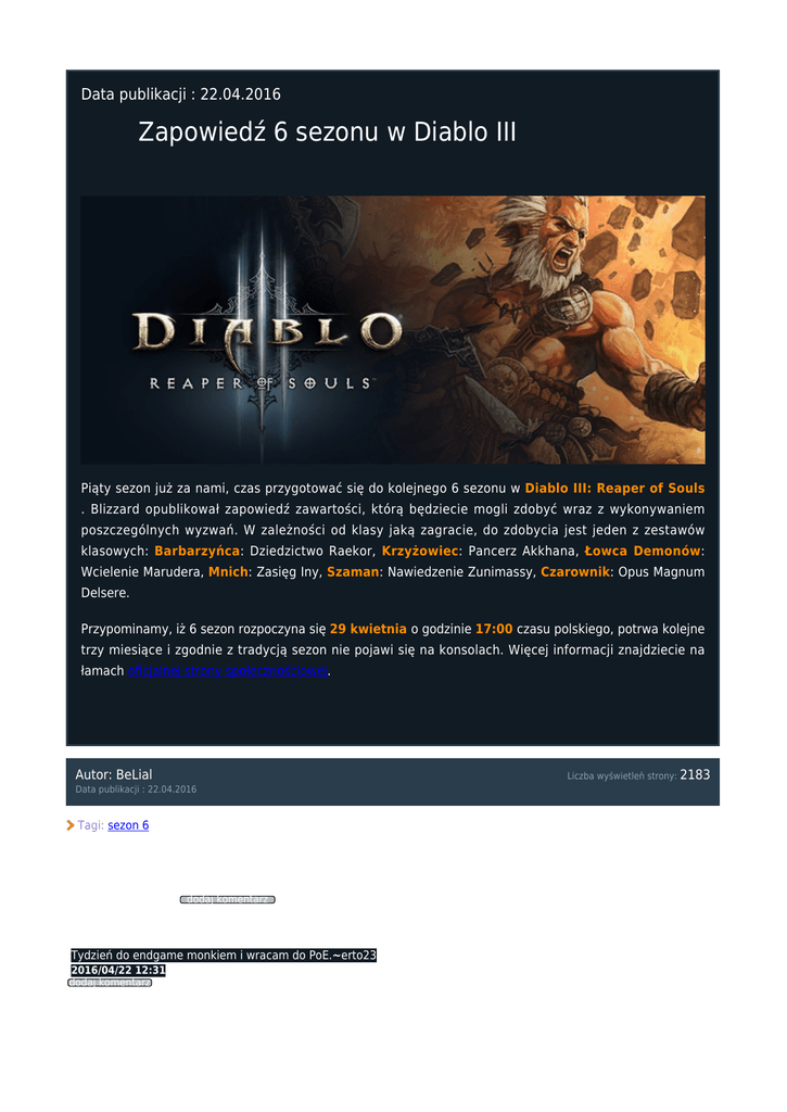 Data publikacji : 22.04.2016 Zapowiedź 6 sezonu w Diablo III Piąty sezon już za nami, czas przygotować się do kolejnego 6 sezonu w Diablo III: Reaper of Souls . Blizzard opublikował zapowiedź zawartości, którą będziecie mogli zdobyć wraz z wykonywaniem poszczególnych wyzwań. W zależności od klasy jaką zagracie, do zdobycia jest jeden z zestawów klasowych: Barbarzyńca: Dziedzictwo Raekor, Krzyżowiec: Pancerz Akkhana, Łowca Demonów: Wcielenie Marudera, Mnich: Zasięg Iny, Szaman: Nawiedzenie Zunimassy, Czarownik: Opus Magnum Delsere. Przypominamy, iż 6 sezon rozpoczyna się 29 kwietnia o godzinie 17:00 czasu polskiego, potrwa kolejne trzy miesiące i zgodnie z tradycją sezon nie pojawi się na konsolach. Więcej informacji znajdziecie na łamach oficjalnej strony społecznościowej. Autor: BeLial Liczba wyświetleń strony: 2183 Data publikacji : 22.04.2016 Tagi: sezon 6 Komentarz (1) dodaj komentarz Tydzień do endgame monkiem i wracam do PoE.~erto23 2016/04/22 12:31 dodaj komentarz Pozostałe nowości DreamHack Open: Valencia 2016 - Nerchio w półfinale - live! DreamHack Valencia to jedno z największych e-sportowych wydarzeń w Europie - dlatego nie mogło zabraknąć na nim StarCrafta II! W czasie rozgrywek 96 graczy będzie konkurować o 50 000 USD oraz 5 000 punktów WCS.Data publikacji: 16.07.20161 Aktualizacja 3.4 – Duże zmiany w rankingu StarCrafta II Na oficjalnym blogu Blizzarda pojawił się nowy wpis dotyczący tym razem zmian w rankingach: Ranking StarCrafta II jest areną dla niezwykle zaciętej rywalizacji. Do walki rusza wielu uczestników, ale tylko nieliczni awansują do ścisłej czołówki.Data publikacji: 03.07.20160 Rozpoczęcie trzeciego sezonu rankingowego 2016 Trzeci sezon tegorocznych rozgrywek ligowych w StarCrafta II uważamy za otwarty! Zresetowano pulę punktów premiowych oraz rankingi i przyznano nagrody za sezon drugi roku 2016.Data publikacji: 26.06.20160 Filmowy „Warcraft” już wkrótce w księgarniach! Powieść „Warcraft”, której wydanie zbiega się z polską premierą filmu „Warcraft. Początek” w reżyserii Duncana Jonesa, do księgarń trafi już 15 czerwca. Na kartach książki czytelnicy wkroczą w nowy wymiar emocji towarzyszących bohaterom fikcyjnych światów Azeroth i Draenor. Za sprawą Christie Golden, pisarki od lat cenionej przez fanów świata Warcraft, konflikt ludzi i orków nabierze jeszcze większej intensywności.Data publikacji: 13.06.20160 Blokada obecnego sezonu i darmowa zmiana nazwy postaci Jak czytamy na oficjalnym blogu Blizzarda: Obecny sezon rankingowy zbliża się ku końcowi i wkrótce zamknięte zostaną wszystkie ligi i dywizje. Kilka dni przed rozpoczęciem nowego sezonu, darmowa zmiana nazwy postaci w StarCraft II zostanie ponownie dodana do wszystkich kont, dla których funkcja ta nie jest obecnie dostępna.Data publikacji: 12.06.20160 Wszystkie nowości