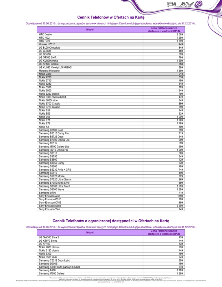 Cennik Telefonów w Ofertach na Kartę Obowiązuje od 10.06.2010 r. do wyczerpania zapasów zestawów objętych niniejszym Cennikiem lub jego odwołania, jednakże nie dłużej niż do 31.12.2010 r. Model HTC Desire HTC HD2 HTC Hero Huawei U7510 LG BL20 Chocolate LG GD330 LG GD510 LG GT540 Swift LG KM900 Arena LG KP500 Cookie LG KU990 Viewty/ LG KU990i Motorola Milestone Nokia 2330 Nokia 2700 Nokia 2710 Nokia 5230 Nokia 5530 Nokia 5800 Nokia 6220 classic Nokia 6303 / Nokia 6303i Nokia 6600i slide Nokia 6700 Classic Nokia 6720 Classic Nokia E52 Nokia E63 Nokia E66 Nokia E71 Nokia E72 Nokia X3 Samsung B2100 Solid Samsung B5310 Corby Pro Samsung B5722 Duos Samsung B7300 Omnia Lite Samsung C6112 Samsung I5700 Galaxy Lite Samsung i8910 Omnia HD Samsung S3310 Samsung S3550 Samsung S3600 Samsung S3650 Corby Samsung S5200 Samsung S5230 Avila + GPS Samsung S5510 Samsung S5620 Monte Samsung S7220 Ultra Classic Samsung S7350i Ultra Style Samsung S8300 Ultra Touch Samsung S8500 Wave Samsung U700 Sony Ericsson Aino Sony Ericsson C510 Sony Ericsson C702 Sony Ericsson Satio Sony Ericsson Yari Cena Telefonu wraz ze starterem o wartości 30PLN 2 099 1 999 1 899 449 849 469 599 799 1 699 659 699 1 899 219 339 499 549 799 949 799 479 849 899 899 949 929 1 299 1 269 1 199 499 399 719 649 999 599 999 1 999 369 349 429 539 499 749 499 629 869 899 1 699 1 599 719 1899 799 899 2 399 749 Cennik Telefonów o ograniczonej dostępności w Ofertach na Kartę Obowiązuje od 10.06.2010 r. do wyczerpania zapasów zestawów objętych niniejszym Cennikiem lub jego odwołania, jednakże nie dłużej niż do 31.12.2010 r. Cena Telefonu wraz ze Model starterem o wartości 30PLN LG GW300 Etna 2 459 LG KE970 Shine 449 LG KP100 139 Nokia 2600 classic 259 Nokia 3120 classic 449 Nokia 6300 499 Nokia 6500 slide 949 Samsung C5212 Duos Light 699 Samsung D900E 499 Samsung F330+karta pamięci 512MB 649 Samsung F480 1 109 Samsung I7500 Galaxy 1 299 P4 sp. z o.o. z siedzibą i adresem w Warszawie, ul. Taśmowa 7, 02-677 Warszawa wpisana do rejestru przedsiębiorców Krajowego Rejestru Sądowego pod numerem KRS 0000217207, prowadzonego przez Sąd Rejonowy dla miasta stołecznego Warszawy, XIII Wydział Gospodarczy Krajowego Rejestru Sądowego, NIP 951-21-20-077, REGON 015808609, której kapitał zakładowy wynosi: 48 456 500,00 złotych. Niniejszy dokument zawiera informacje stanowiące tajemnicę przedsiębiorstwa Grupy P4, których rozpowszechnianie w jakiejkolwiek formie bez pisemnej zgody właściciela jest zabronione do momentu ich oficjalnej publikacji. Osoba która weszła w posiadanie tego dokumentu przez przypadek lub pomyłkę proszona jest o niezwłoczne powiadomienie P4 sp. z o.o. tel. 0 790 500 500 Samsung S5230 Avila Sony Ericsson C902 Sony Ericsson F305 Sony Ericsson W910i Sony Ericsson W995 699 1 099 399 1 129 1 699 Opłata za Telefony podana jest w złotych i zawiera podatek VAT. *Karty pamięci są dostępne w wybranych zestawach Telefonów do wyczerpania stanów magazynowych kart pamięci. Blokada SIM LOCK: 1. W przypadku gdy oferowany w ramach Oferty Play Telefon będzie posiadał blokadę SIM Lock, Abonent może żądać usunięcia tej blokady w każdym czasie w Punktach Sprzedaży P4. Blokada SIM Lock usuwana jest bezpłatnie w ramach istniejących możliwości technicznych. 2. W przypadku usunięcia blokady SIM Lock poza Punktem Sprzedaży P4 w sposób nie uzgodniony z P4 Abonent może stracić prawo do bezpłatnej obsługi serwisowej Modemu w ramach gwarancji, rękojmi lub uprawnień z tytułu niezgodności z umową, jeżeli wada / niezgodność z umową powstała na skutek usunięcia blokady SIM Lock. Promocyjne ceny Telefonów: 3. Przy zakupie startera o wartości 30PLN w ramach Ofert na Kartę, Abonent ma możliwość zakupu Telefonu na warunkach cenowych określonych w niniejszym Cenniku Telefonów. 4. P4 zastrzega, iż dostępność poszczególnych modeli Telefonów uzależniona jest od aktualnych stanów magazynowych Punktów Sprzedaży P4. PRAWO DO BŁĘDÓW W DRUKU ZASTRZEŻONE P4 sp. z o.o. z siedzibą i adresem w Warszawie, ul. Taśmowa 7, 02-677 Warszawa wpisana do rejestru przedsiębiorców Krajowego Rejestru Sądowego pod numerem KRS 0000217207, prowadzonego przez Sąd Rejonowy dla miasta stołecznego Warszawy, XIII Wydział Gospodarczy Krajowego Rejestru Sądowego, NIP 951-21-20-077, REGON 015808609, której kapitał zakładowy wynosi: 48 456 500,00 złotych. Niniejszy dokument zawiera informacje stanowiące tajemnicę przedsiębiorstwa Grupy P4, których rozpowszechnianie w jakiejkolwiek formie bez pisemnej zgody właściciela jest zabronione do momentu ich oficjalnej publikacji. Osoba która weszła w posiadanie tego dokumentu przez przypadek lub pomyłkę proszona jest o niezwłoczne powiadomienie P4 sp. z o.o. tel. 0 790 500 500
