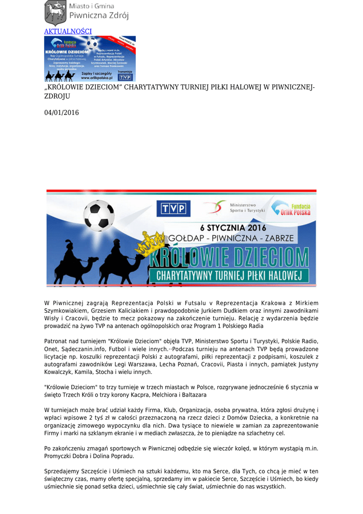 AKTUALNOŚCI „KRÓLOWIE DZIECIOM” CHARYTATYWNY TURNIEJ PIŁKI HALOWEJ W PIWNICZNEJZDROJU 04/01/2016 W Piwnicznej zagrają Reprezentacja Polski w Futsalu v Reprezentacja Krakowa z Mirkiem Szymkowiakiem, Grzesiem Kaliciakiem i prawdopodobnie Jurkiem Dudkiem oraz innymi zawodnikami Wisły i Cracovii, będzie to mecz pokazowy na zakończenie turnieju. Relację z wydarzenia będzie prowadzić na żywo TVP na antenach ogólnopolskich oraz Program 1 Polskiego Radia Patronat nad turniejem "Królowie Dzieciom" objęła TVP, Ministerstwo Sportu i Turystyki, Polskie Radio, Onet, Sądeczanin.info, Futbol i wiele innych.··Podczas turnieju na antenach TVP będą prowadzone licytacje np. koszulki reprezentacji Polski z autografami, piłki reprezentacji z podpisami, koszulek z autografami zawodników Legi Warszawa, Lecha Poznań, Cracovii, Piasta i innych, pamiątek Justyny Kowalczyk, Kamila, Stocha i wielu innych. "Królowie Dzieciom" to trzy turnieje w trzech miastach w Polsce, rozgrywane jednocześnie 6 stycznia w święto Trzech Króli o trzy korony Kacpra, Melchiora i Baltazara W turniejach może brać udział każdy Firma, Klub, Organizacja, osoba prywatna, która zgłosi drużynę i wpłaci wpisowe 2 tyś zł w całości przeznaczoną na rzecz dzieci z Domów Dziecka, a konkretnie na organizację zimowego wypoczynku dla nich. Dwa tysiące to niewiele w zamian za zaprezentowanie Firmy i marki na szklanym ekranie i w mediach zwłaszcza, że to pieniądze na szlachetny cel. Po zakończeniu zmagań sportowych w Piwnicznej odbędzie się wieczór kolęd, w którym wystąpią m.in. Promyczki Dobra i Dolina Popradu. Sprzedajemy Szczęście i Uśmiech na sztuki każdemu, kto ma Serce, dla Tych, co chcą je mieć w ten świąteczny czas, mamy ofertę specjalną, sprzedamy im w pakiecie Serce, Szczęście i Uśmiech, bo kiedy uśmiechnie się ponad setka dzieci, uśmiechnie się cały świat, uśmiechnie do nas wszystkich. Wszelkie szczegóły dotyczące turnieju, zapisy i regulamin: www.orlikpolska.pl O Turniejach "Królowie Dzieciom" to trzy turnieje charytatywne na rzecz zimowego wypoczynku dzieci z Domów Dziecka, w trzech miastach Polski - Piwniczna, Zabrze, Gołdap, rozgrywane jednocześnie tego samego dnia w święto trzech Króli, 6 stycznia 2016 r., o trzy korony Kacpra, Melchiora i Baltazara. W każdym mieście w turnieju może wystąpić 16 drużyn, jedynym warunkiem udziału jest wpłata 2 tys. zł wpisowego. Wszystkie turnieje "Królowie Dzieciom " będą relacjonowane na żywo przez TVP i Polskie Radio Program 1, telewizja planuje 6 wejść antenowych po 18 minut każde. Sprzedajemy szczęście i uśmiech na sztuki, każdemu, kto ma serce, dla tych, co chcieliby je mieć choćby w ten świąteczny czas, mamy ofertę specjalną, sprzedamy im serce i szczęście w pakiecie! Podczas turniejów na antenie TVP prowadzić również będziemy licytacje na ten cel przedmiotów podarowanych przez min Mirosława Szymkowiaka, Justynę Kowalczyk, Kamila Stocha, Kluby Legi Warszawa, Lecha Poznań, Cracovii i wielu innych. Naszymi Ambasadorami są Mirosław Szymkowiak, który tak wypowiedział się o inicjatywie: „Trzeba by być bez serca żeby nie wspomóc takiej akcji jak ta Fundacji Orlik Polska, na rzecz dzieci, rywalizacja sportowa w dodatku w szczytnym celu, do zobaczenia 6 stycznia na "Królowie Dzieciom”, zapraszam serdecznie!” oraz Grzegorz Kaliciak, który stwierdził " Bez dwóch zdań, takich pomysłów powinno być więcej. Dlaczego zostałem ambasadorem akcji... jeżeli w jakimś stopniu moja skromna osoba może pomóc w tak szczytnym celu to nie wypadało odmówić. Sport uczy i wychowuje także jestem do dyspozycji. Super akcja!!!”··W ciepłych słowach o inicjatywie wypowiada się również kapitan Reprezentacji Polski w futsalu + 35 Tomasz Porwet " Gdy Adam Mróz zaproponował mi udział w turnieju "Królowie dzieciom" odpowiedziałem natychmiast "przyjeżdżamy" do Piwnicznej. Pomimo natłoku meczy w styczniu, takim przekonywującym ludziom jak Adam się nie odmawia. Reprezentacja Polski "35" w futsalu to drużyna, która wspiera działalność charytatywną, po meczu w Piwnicznej już 10 stycznia "pomagamy" w Przemyślu. Wychodzimy z założenia, że każdy rodzaj pomocy i wsparcia ma sens." Swój udział w turniejach zapowiedzieli min Mirosław Szymkowiak, Grzegorz Kaliciak - którzy wspólnie tworzą Reprezentacje Krakowa ( obiecana obecność w niej Jurka Dutka), która w meczu pokazowym zagra z Reprezentacja Polski w Futsalu, oraz zawodnicy klubów ekstraklasy polskiej. Imprezy nie są biletowane, zapraszamy wszystkich i każdego z osobna, na wszystkich czeka moc atrakcji nie tylko sportowych z koncertami kolęd wystąpią min Promyczki Dobra, Dolina Popradu, Arkadiusz Szulc i wiele innych znanych i mniej znanych wykonawców estradowych i ludowych. Podczas każdego turnieju spodziewany jest Orszak konny Trzech Króli, którzy swoje korony przekażą zwycięzcom poszczególnych zawodów. Każda z imprez zakończy wspólne kolędowanie i łamanie się opłatkiem.··Wydarzenie Królowie Dzieciom zostało objęte patronatem min Ministerstwa Sportu i Turystyki, Telewizji Polskiej i Polskiego Radia. ZAPRASZAMY DO PIWNICZNEJ