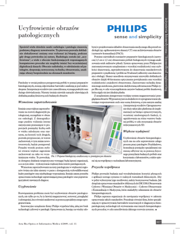 Spośród wielu dziedzin nauki radiologia i patologia stanowią podstawę diagnozy nowotworów. Ta pierwsza pozwala dokładnie zlokalizować zmianę oraz wykonać jej biopsję, podczas gdy druga potwierdza jej naturę. Radiologia została już „ucyfrowiona”, a wiele z obecnie funkcjonujących wspomaganych komputerowo procedur nie mogłoby istnieć bez wcześniejszej digitalizacji danych. Obecnie radiolodzy, w odróżnieniu od patologów, dysponują nowoczesną techniką obrazowania, analizując obrazy bezpośrednio na ekranach monitorów. Patolodzy w swojej praktyce przygotowują próbki w postaci preparatów histologicznych, stosują odpowiednie barwniki i analizują je pod mikroskopem. Interpretacja wyników jest czasochłonna, wymaga praktyki oraz dużego doświadczenia. Niestety istnieje niewiele narzędzi ułatwiających dokładną analizę ilościową cech badanych obrazów. Wzmożone zapotrzebowanie bytej w projektowaniu układów obrazowania medycznego dla potrzeb radiologii (np. ogólnoustrojowe skanery CT) oraz archiwizowania obrazów i systemów komunikacji (PACS). Pomimo niewielkich rozmiarów preparatów histologicznych (zazwyczaj 1,5 cm x 1,5 cm) obrazowanie próbek biologicznych wymaga analizowania setek milionów pikseli. System opracowany przez Philipsa jest zautomatyzowanym urządzeniem o wysokiej rozdzielczości oraz szybkości skanowania, zaprojektowanym do skanowania standardowych preparatów z prędkością 1 próbki na 50 sekund (całkowity czas skanowania i obsługi). Skaner umożliwia otrzymywanie niezwykle dokładnych obrazów dzięki 40-krotnemu optycznemu powiększeniu oraz wysokiej rozdzielczości czujnikowi obrazowemu. Zastosowano technikę dynamicznego autofocusu, pierwotnie dedykowaną odtwarzaczom Philips typu Blu-ray, w celu wyszczególnienia zarysów badanej próbki tkankowej, która nigdy nie jest idealnie płaska. Z urządzeniem zintegrowano wydajny system magazynowania i przeglądaniaobrazów.Wyposażonyjestondodatkowowoprogramowanieułatwiające rozpoznawanie cech oraz ocenę ilościową, a tym samym analizę i interpretację wyników. Oprogramowanie służy także jako platforma do implementacji na bieżąco opracowywanych, wcześniej niedostępnych funkcji, tj. ogniskowania na różne warstwy badanej próbki, w celu otrzymania obrazów trójwymiarowych 3D. Istnieje coraz większe zapotrzebowanie na rozwój diagnostyki patologicznej, szczególnie w obszarze onkologii. Z demograficznego punktu widzenia istotne statystycznie przesunięcie w proporcjach pomiędzy liczbą osób Większa wydajność w wieku młodszym oraz starszym, na korzyść tych drugich, Ucyfrowienie obrazów histopatologiczpozwala przypuszczać, że wzrost nych ma na celu usprawnienie całego zachorowań, w tym zmian nowoprocesu pracy patologów. Przykładowo, tworowych, będzie postępował. konsultacje pomiędzy specjalistami nie Ponadto wysoki poziom otyłomuszą odbywać się za pomocą fizyczści stwarza większe zagrożenie nego przesyłania badanych próbek oraz zachorowań na raka we wczeFot. 1 Preparat histologiczny analizowany w prototypowym skanerze korzystania z laboratoriów, a także opieśniejszym wieku. To powoduje, że dostępne działania terapeutyczne wymagać będą lepszej organizacji, rać się na współpracy z technikami laboratoryjnymi. a co za tym idzie – wykonywania większej ilości testów patologicznych. Wzmożone zapotrzebowanie na testy patologiczne w większości regio- Przyszła współpraca nów świata nie idzie niestety w parze z dostępnością wykwalifikowanej kadry patologów oraz niezbędnego wyposażenia. Istnieje zatem potrzeba Philips prowadzi badania nad wyodrębnieniem korzyści płynących opracowania technologii usprawniającej pracę patologów oraz poprawia- z aplikacji nowego systemu w realnych warunkach klinicznych. Aby w pełni wykorzystać jego możliwości, należy kontynuować badania. Jak jącej jakość stawianych diagnoz. dotąd nie opracowano standardów zbliżonych do DICOM (Obrazowanie Ucyfrowienie Cyfrowe i Wymiana Obrazów w Medycynie) – Cyfrowe Obrazowanie i Komunikacja w Medycynie, które znalazłyby odniesienie do obrazów Rozwiązaniem problemu może być ucyfrowienie obrazów patologicz- histopatologicznych. nych, nie tylko po to, by je łatwiej magazynować, sortować, przeglądać Philips zaprasza organizacje do nawiązania współpracy w zakresie i udostępniać, lecz również analizować za pomocą specjalistycznego opro- opracowania takich standardów. Poszukuje również firm, które specjaligramowania. zują się w opracowywaniu barwników stosowanych w diagnostyce histoInnowacyjne urządzenie firmy Philips wypełnia lukę, jaką jest brak patologicznej, technologii ich wytwarzania oraz innych histopatologicztechnologii cyfrowej w patologii. Opracowano je, bazując na wiedzy zdo- nych procedur, w celu umożliwienia dalszego rozwoju systemu. ■ Acta Bio-Optica et Informatica Medica 4/2009, vol. 15 387 inżynieria biomedyczna / biomedical engineering Ucyfrowienie obrazów patologicznych