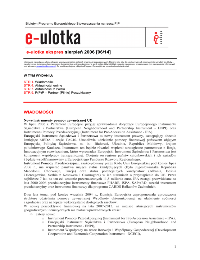Biuletyn Programu Europejskiego Stowarzyszenia na rzecz FIP e-ulotka ekspres sierpień 2006 [06/14] Informacja zawarta w e-ulotce ekspres skierowana jest do polskich organizacji pozarządowych. Staramy się, aby do przekazywanych informacji nie wkradały się błędy – merytoryczne, techniczne lub związane z tłumaczeniem unijnego Ŝargonu na język polski. Gdy taki błąd zostanie zauwaŜony, prosimy nas o tym niezwłocznie informować pod adresem [email protected]. Za skutki wynikające z błędów Program Europejski nie ponosi odpowiedzialności. W TYM WYDANIU: STR 1. Wiadomości STR 4. Aktualności unijne STR 7. Aktualności z Polski STR 9. P(P)P – Partner (Pilnie) Poszukiwany WIADOMOŚCI Nowe instrumenty pomocy zewnętrznej UE W lipcu 2006 r. Parlament Europejski przyjął sprawozdania dotyczące Europejskiego Instrumentu Sąsiedztwa i Partnerstwa (European Neighbourhood and Partnership Instrument - ENPI) oraz Instrumentu Pomocy Przedakcesyjnej (Instrument for Pre-Accession Assistance - IPA). Europejski Instrument Sąsiedztwa i Partnerstwa to nowy instrument prawny, zastępujący obecnie istniejące MEDA i część TACIS. UmoŜliwia udzielanie pomocy finansowej państwom objętym Europejską Polityką Sąsiedztwa, m. in.: Białorusi, Ukrainie, Republice Mołdowy, krajom południowego Kaukazu. Instrument ten będzie równieŜ wspierał strategiczne partnerstwo z Rosją. Innowacyjnym rozwiązaniem, które wprowadza Europejski Instrument Sąsiedztwa i Partnerstwa jest komponent współpracy transgranicznej. Obejmie on regiony państw członkowskich i ich sąsiadów i będzie współfinansowany z Europejskiego Funduszu Rozwoju Regionalnego. Instrument Pomocy Przedakcesyjnej, zaakceptowany przez Radę Unii Europejskiej pod koniec lipca 2006 r., ma wspierać państwa mające status kandydujących (Była Jugosłowiańska Republika Macedonii, Chorwacja, Turcja) oraz status potencjalnych kandydatów (Albania, Bośnia i Hercegowina, Serbia z Kosowem i Czarnogóra) w ich staraniach o przystąpienie do UE. Przez najbliŜsze 7 lat, na ten cel zostanie przeznaczonych 11,5 miliarda euro. IPA zastąpi przewidziane na lata 2000-2006 przedakcesyjne instrumenty finansowe PHARE, ISPA, SAPARD, turecki instrument przedakcesyjny oraz instrument finansowy dla programu CARDS Bałkanów Zachodnich. Dwa lata temu, pod koniec września 2004 r., Komisja Europejska zaproponowała uproszczoną strukturę udzielania pomocy zewnętrznej Wspólnoty ukierunkowanej na ułatwienie spójności i zgodności oraz na lepsze wykorzystanie dostępnych zasobów. W nowej perspektywie finansowej na lata 2007-2013, na miejsce istniejących instrumentów geograficznych i tematycznych ma zostać wprowadzonych sześć: • cztery nowe: o Instrument Pomocy Przedakcesyjnej (Instrument for Pre-Accession Assistance - IPA), o Europejski Instrument Sąsiedztwa i Partnerstwa (European Neighbourhood and Partnership Instrument - ENPI), o Instrument Współpracy na rzecz Rozwoju i Współpracy Gospodarczej (Development Cooperation and Economic Cooperation Instrument - DCECI), 1 o Instrument na rzecz Stabilności (instrument for Stability); dwa dotychczas istniejące: o Instrument Pomocy Makrofinansowej (Instrument for Macro Financial Assistance), o Instrument Pomocy Humanitarnej (Instrument for Humanitarian Aid). Trzy z nich mają być instrumentami horyzontalnymi: Instrument Pomocy Humanitarnej, Instrument na rzecz Stabilności oraz Instrument Pomocy Makrofinansowej, natomiast kolejne trzy mają określony zasięg geograficzny w celu wdraŜania określonej polityki: Instrument Pomocy Przedakcesyjnej, Europejski Instrument Sąsiedztwa i Partnerstwa, Instrument Współpracy na rzecz Rozwoju i Współpracy Gospodarczej. Więcej informacji na temat Europejskiego Instrumentu Sąsiedztwa i Partnerstwa moŜna znaleźć na stronie: http://ec.europa.eu/world/enp/faq_en.htm#4.1. Więcej o Instrumencie Pomocy Przedakcesyjnej znajduje się na stronie: http://ec.europa.eu/enlargement/financial_assistance/ipa/index_en.htm • 2008 - Europejski Rok Dialogu Międzykulturowego Parlament Europejski przyjął przed wakacjami propozycję Komisji Europejskiej, aby ustanowić rok 2008 Europejskim Rokiem Dialogu Międzykulturowego. Przypomnijmy, Ŝe rok 2006 został ogłoszony przez Komisję Europejskim Rokiem Mobilności Pracowników (czytaj w e-ulotce ekspres nr 06/02), a 2007 - Europejskim Roku Równych Szans (patrz: e-ulotka ekspres nr 06/10). Celem najnowszej inicjatywy Komisji ma być przyczynianie się do dialogu między wszystkimi kulturami i mieszkańcami Unii Europejskiej. BudŜet w wysokości 10 mln euro będzie przeznaczony na kampanie informacyjne i promocyjne (45 % łącznego budŜetu), uroczystości i działania na szczeblu europejskim mające promować dialog międzykulturowy (24 %), uroczystości i działania na szczeblu krajowym, o ile przynoszą wartość dodaną na szczeblu europejskim (25 %) oraz analizy i badania na szczeblu europejskim lub krajowym (6 %). Eurodeputowani zgodzili się, Ŝe inicjatywa Komisji zawiera wiele ciekawych pomysłów, ale uznali jednocześnie, Ŝe wymagają one uproszczenia i doprecyzowania. Proponowane przez nich poprawki mają zapewnić ciągłość działań i spójność z pozostałymi latami tematycznymi, zwłaszcza z Rokiem Równych Szans dla Wszystkich oraz podkreślenie znaczenia kultury i róŜnorodności kulturowej. Parlament proponuje utworzenie nagrody w dziedzinie dialogu międzykulturowego, która byłaby przyznawana za projekt skierowany do młodych ludzi i oparty na programach wspólnotowych: Socrates, MłodzieŜ czy Kultura. Jednym z pomysłów jest takŜe jest zakończenie Europejskiego Roku Dialogu Międzykulturowego specjalnym forum w Parlamencie Europejskim, które zgromadziłoby przedstawicieli społeczeństwa obywatelskiego oraz środowisk politycznych i religijnych. Do przygotowania i przeprowadzenia działań w ramach obchodów Europejskiego Roku Dialogu Międzykulturowego eurodeputowan