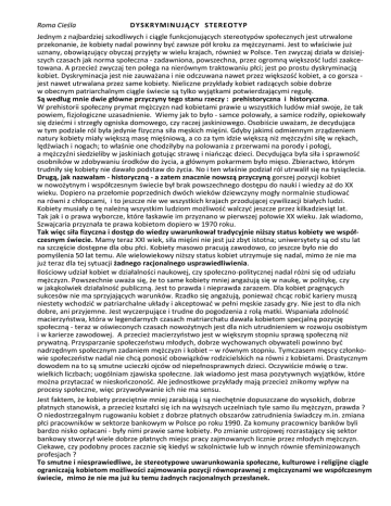 Roma Cieśla DYSKRYMINUJĄCY STEREOTYP Jednym z najbardziej szkodliwych i ciągle funkcjonujących stereotypów społecznych jest utrwalone przekonanie, że kobiety nadal powinny być zawsze pół kroku za mężczyznami. Jest to właściwie już uznany, obowiązujący obyczaj przyjęty w wielu krajach, również w Polsce. Ten zwyczaj działa w dzisiejszych czasach jak norma społeczna - zadawniona, powszechna, przez ogromną większość ludzi zaakcetowana. A przecież zwyczaj ten polega na nierównym traktowaniu płci; jest po prostu dyskryminacją kobiet. Dyskryminacja jest nie zauważana i nie odczuwana nawet przez większość kobiet, a co gorsza jest nawet utrwalana przez same kobiety. Nieliczne przykłady kobiet radzących sobie dobrze w obecnym patriarchalnym ciągle świecie są tylko wyjątkami potwierdzającymi regułę. Są według mnie dwie główne przyczyny tego stanu rzeczy : prehistoryczna i historyczna. W prehistorii społeczny prymat mężczyzn nad kobietami prawie u wszystkich ludów miał swoje, że tak powiem, fizjologiczne uzasadnienie. Wiemy jak to było - samce polowały, a samice rodziły, opiekowały się dziećmi i strzegły ogniska domowego, czy raczej jaskiniowego. Osobiście uważam, że decydująca w tym podziale ról była jedynie fizyczna siła męskich mięśni. Gdyby jakimś odmiennym zrządzeniem natury kobiety miały większą masę mięśniową, a co za tym idzie większą niż mężczyźni siłę w rękach, lędźwiach i nogach; to właśnie one chodziłyby na polowania z przerwami na porody i połogi, a mężczyźni siedzieliby w jaskiniach gotując strawę i niańcząc dzieci. Decydująca była siła i sprawność osobników w zdobywaniu środków do życia, a głównym pokarmem było mięso. Zbieractwo, którym trudniły się kobiety nie dawało podstaw do życia. No i ten właśnie podział ról utrwalił się na tysiąclecia. Drugą, jak nazwałam - historyczną - a zatem znacznie nowszą przyczyną gorszej pozycji kobiet w nowożytnym i współczesnym świecie był brak powszechnego dostępu do nauki i wiedzy aż do XX wieku. Dopiero na przełomie poprzednich dwóch wieków dziewczyny mogły normalnie studiować na równi z chłopcami, i to jeszcze nie we wszystkich krajach przodującej cywilizacji białych ludzi. Kobiety musiały o tę należną wszystkim ludziom możliwość walczyć jeszcze przez kilkadziesiąt lat. Tak jak i o prawa wyborcze, które łaskawie im przyznano w pierwszej połowie XX wieku. Jak wiadomo, Szwajcaria przyznała te prawa kobietom dopiero w 1970 roku. Tak więc siła fizyczna i dostęp do wiedzy uwarunkował tradycyjnie niższy status kobiety we współczesnym świecie. Mamy teraz XXI wiek, siła mięśni nie jest już zbyt istotna; uniwersytety są od stu lat na szczęście dostępne dla obu płci. Kobiety masowo pracują zawodowo, co jeszcze było nie do pomyślenia 50 lat temu. Ale wielowiekowy niższy status kobiet utrzymuje się nadal, mimo że nie ma już teraz dla tej sytuacji żadnego racjonalnego usprawiedliwienia. Ilościowy udział kobiet w działalności naukowej, czy społeczno-politycznej nadal różni się od udziału mężczyzn. Powszechnie uważa się, że to same kobiety mniej angażują się w naukę, w politykę, czy w jakąkolwiek działalność publiczną. Jest to prawda i nieprawda zarazem. Dla kobiet pragnących sukcesów nie ma sprzyjających warunków. Rzadko się angażują, ponieważ chcąc robić kariery muszą niestety wchodzić w patriarchalne układy i akceptować w pełni męskie zasady gry. Nie jest to dla nich dobre, ani przyjemne. Jest wyczerpujące i trudne do pogodzenia z rolą matki. Wspaniała zdolność macierzyństwa, która w legendarnych czasach matriarchatu dawała kobietom specjalną pozycję społeczną - teraz w oświeconych czasach nowożytnych jest dla nich utrudnieniem w rozwoju osobistym i w karierze zawodowej. A przecież macierzyństwo jest w większym stopniu sprawą społeczną niż prywatną. Przysparzanie społeczeństwu młodych, dobrze wychowanych obywateli powinno być nadrzędnym społecznym zadaniem mężczyzn i kobiet – w równym stopniu. Tymczasem męscy członkowie społeczeństw nadal nie chcą ponosić obowiązków rodzicielskich na równi z kobietami. Drastycznym dowodem na to są smutne ucieczki ojców od niepełnosprawnych dzieci. Oczywiście mówię o tzw. wielkich liczbach; uogólniam zjawiska społeczne. Jak wiadomo jest masa pozytywnych wyjątków, które można przytaczać w nieskończoność. Ale jednostkowe przykłady mają przecież znikomy wpływ na procesy społeczne, więc przywoływanie ich nie ma sensu. Jest faktem, że kobiety przeciętnie mniej zarabiają i są niechętnie dopuszczane do wysokich, dobrze płatnych stanowisk, a przecież kształci się ich na wyższych uczelniach tyle samo ilu mężczyzn, prawda ? O niedostrzegalnym rugowaniu kobiet z dobrze płatnych obszarów zatrudnienia świadczy m.in. zmiana płci pracowników w sektorze bankowym w Polsce po roku 1990. Za komuny pracownicy banków byli bardzo nisko opłacani - były nimi prawie same kobiety. Po zmianie ustrojowej rozrastający się sektor bankowy stworzył wiele dobrze płatnych miejsc pracy zajmowanych licznie przez młodych mężczyzn. Ciekawe, czy podobny proces zacznie się kiedyś w szkolnictwie lub w innych równie sfeminizowanych profesjach ? To smutne i niesprawiedliwe, że stereotypowe uwarunkowania społeczne, kulturowe i religijne ciągle ograniczają kobietom możliwości zajmowania pozycji równoprawnej z mężczyznami we współczesnym świecie, mimo że nie ma już ku temu żadnych racjonalnych przesłanek.