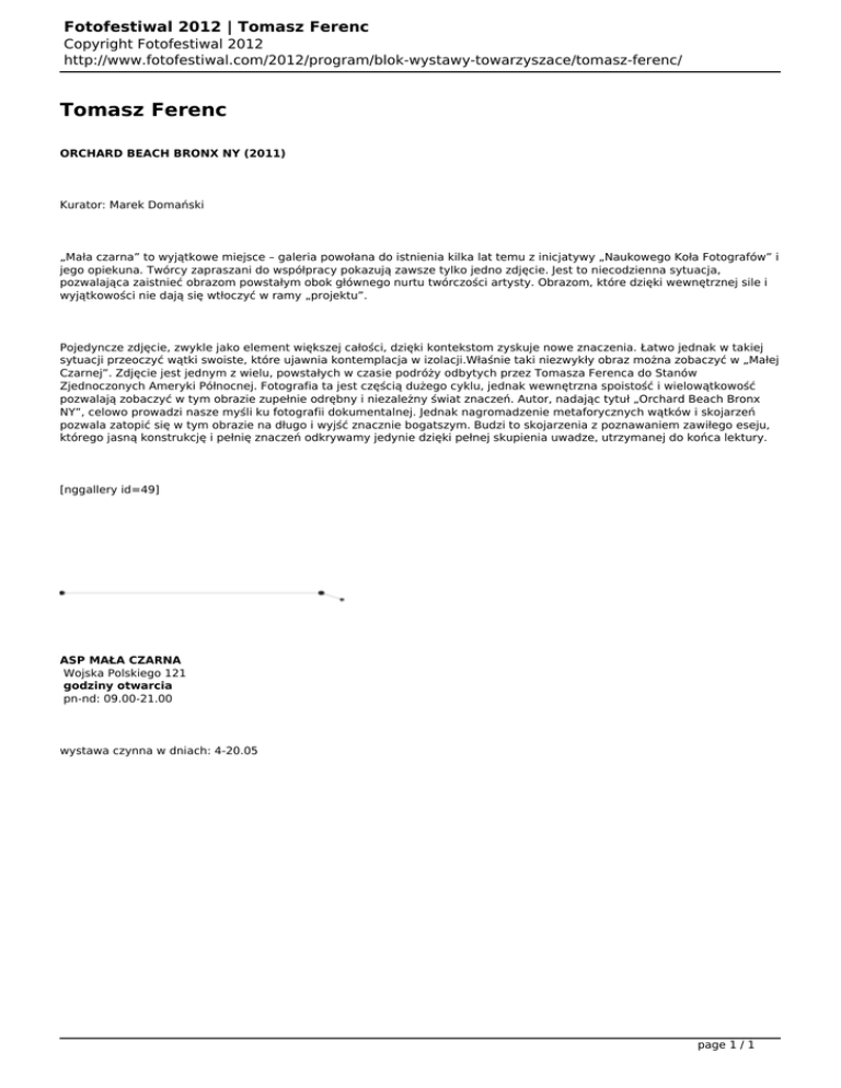 Fotofestiwal 2012 | Tomasz Ferenc Copyright Fotofestiwal 2012 http://www.fotofestiwal.com/2012/program/blok-wystawy-towarzyszace/tomasz-ferenc/ Tomasz Ferenc ORCHARD BEACH BRONX NY (2011) Kurator: Marek Domański „Mała czarna” to wyjątkowe miejsce – galeria powołana do istnienia kilka lat temu z inicjatywy „Naukowego Koła Fotografów” i jego opiekuna. Twórcy zapraszani do współpracy pokazują zawsze tylko jedno zdjęcie. Jest to niecodzienna sytuacja, pozwalająca zaistnieć obrazom powstałym obok głównego nurtu twórczości artysty. Obrazom, które dzięki wewnętrznej sile i wyjątkowości nie dają się wtłoczyć w ramy „projektu”. Pojedyncze zdjęcie, zwykle jako element większej całości, dzięki kontekstom zyskuje nowe znaczenia. Łatwo jednak w takiej sytuacji przeoczyć wątki swoiste, które ujawnia kontemplacja w izolacji.Właśnie taki niezwykły obraz można zobaczyć w „Małej Czarnej”. Zdjęcie jest jednym z wielu, powstałych w czasie podróży odbytych przez Tomasza Ferenca do Stanów Zjednoczonych Ameryki Północnej. Fotografia ta jest częścią dużego cyklu, jednak wewnętrzna spoistość i wielowątkowość pozwalają zobaczyć w tym obrazie zupełnie odrębny i niezależny świat znaczeń. Autor, nadając tytuł „Orchard Beach Bronx NY”, celowo prowadzi nasze myśli ku fotografii dokumentalnej. Jednak nagromadzenie metaforycznych wątków i skojarzeń pozwala zatopić się w tym obrazie na długo i wyjść znacznie bogatszym. Budzi to skojarzenia z poznawaniem zawiłego eseju, którego jasną konstrukcję i pełnię znaczeń odkrywamy jedynie dzięki pełnej skupienia uwadze, utrzymanej do końca lektury. [nggallery id=49] ASP MAŁA CZARNA Wojska Polskiego 121 godziny otwarcia pn-nd: 09.00-21.00 wystawa czynna w dniach: 4-20.05 page 1 / 1