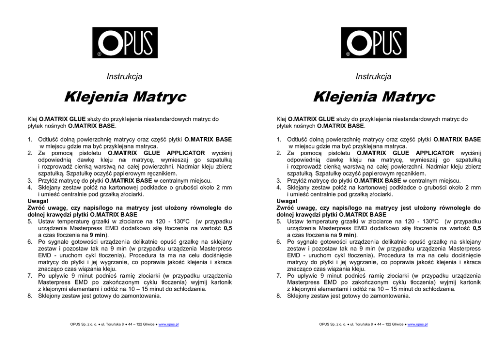 Instrukcja Instrukcja Klejenia Matryc Klejenia Matryc Klej O.MATRIX GLUE służy do przyklejenia niestandardowych matryc do płytek nośnych O.MATRIX BASE. Klej O.MATRIX GLUE służy do przyklejenia niestandardowych matryc do płytek nośnych O.MATRIX BASE. 1. Odtłuść dolną powierzchnię matrycy oraz część płytki O.MATRIX BASE w miejscu gdzie ma być przyklejana matryca. 2. Za pomocą pistoletu O.MATRIX GLUE APPLICATOR wyciśnij odpowiednią dawkę kleju na matrycę, wymieszaj go szpatułką i rozprowadź cienką warstwą na całej powierzchni. Nadmiar kleju zbierz szpatułką. Szpatułkę oczyść papierowym ręcznikiem. 3. Przyłóż matrycę do płytki O.MATRIX BASE w centralnym miejscu. 4. Sklejany zestaw połóż na kartonowej podkładce o grubości około 2 mm i umieść centralnie pod grzałką złociarki. Uwaga! Zwróć uwagę, czy napis/logo na matrycy jest ułożony równolegle do dolnej krawędzi płytki O.MATRIX BASE 5. Ustaw temperaturę grzałki w złociarce na 120 - 130ºC (w przypadku urządzenia Masterpress EMD dodatkowo siłę tłoczenia na wartość 0,5 a czas tłoczenia na 9 min). 6. Po sygnale gotowości urządzenia delikatnie opuść grzałkę na sklejany zestaw i pozostaw tak na 9 min (w przypadku urządzenia Masterpress EMD - uruchom cykl tłoczenia). Procedura ta ma na celu dociśnięcie matrycy do płytki i jej wygrzanie, co poprawia jakość klejenia i skraca znacząco czas wiązania kleju. 7. Po upływie 9 minut podnieś ramię złociarki (w przypadku urządzenia Masterpress EMD po zakończonym cyklu tłoczenia) wyjmij kartonik z klejonymi elementami i odłóż na 10 – 15 minut do schłodzenia. 8. Sklejony zestaw jest gotowy do zamontowania. 1. Odtłuść dolną powierzchnię matrycy oraz część płytki O.MATRIX BASE w miejscu gdzie ma być przyklejana matryca. 2. Za pomocą pistoletu O.MATRIX GLUE APPLICATOR wyciśnij odpowiednią dawkę kleju na matrycę, wymieszaj go szpatułką i rozprowadź cienką warstwą na całej powierzchni. Nadmiar kleju zbierz szpatułką. Szpatułkę oczyść papierowym ręcznikiem. 3. Przyłóż matrycę do płytki O.MATRIX BASE w centralnym miejscu. 4. Sklejany zestaw połóż na kartonowej podkładce o grubości około 2 mm i umieść centralnie pod grzałką złociarki. Uwaga! Zwróć uwagę, czy napis/logo na matrycy jest ułożony równolegle do dolnej krawędzi płytki O.MATRIX BASE 5. Ustaw temperaturę grzałki w złociarce na 120 - 130ºC (w przypadku urządzenia Masterpress EMD dodatkowo siłę tłoczenia na wartość 0,5 a czas tłoczenia na 9 min). 6. Po sygnale gotowości urządzenia delikatnie opuść grzałkę na sklejany zestaw i pozostaw tak na 9 min (w przypadku urządzenia Masterpress EMD - uruchom cykl tłoczenia). Procedura ta ma na celu dociśnięcie matrycy do płytki i jej wygrzanie, co poprawia jakość klejenia i skraca znacząco czas wiązania kleju. 7. Po upływie 9 minut podnieś ramię złociarki (w przypadku urządzenia Masterpress EMD po zakończonym cyklu tłoczenia) wyjmij kartonik z klejonymi elementami i odłóż na 10 – 15 minut do schłodzenia. 8. Sklejony zestaw jest gotowy do zamontowania. OPUS Sp. z o. o. ● ul. Toruńska 8 ● 44 – 122 Gliwice ● www.opus.pl OPUS Sp. z o. o. ● ul. Toruńska 8 ● 44 – 122 Gliwice ● www.opus.pl