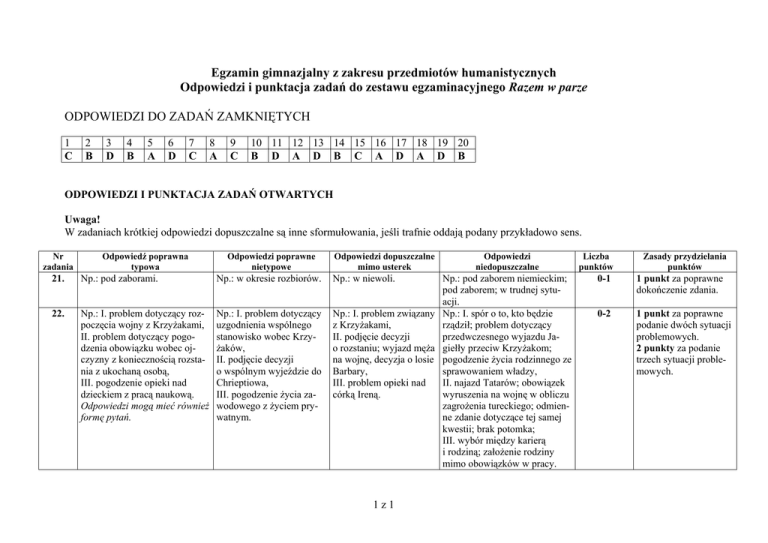 Egzamin gimnazjalny z zakresu przedmiotów humanistycznych Odpowiedzi i punktacja zadań do zestawu egzaminacyjnego Razem w parze ODPOWIEDZI DO ZADAŃ ZAMKNIĘTYCH 1 C 2 B 3 D 4 B 5 A 6 D 7 C 8 A 9 C 10 11 12 13 14 15 16 17 18 19 20 B D A D B C A D A D B ODPOWIEDZI I PUNKTACJA ZADAŃ OTWARTYCH Uwaga! W zadaniach krótkiej odpowiedzi dopuszczalne są inne sformułowania, jeśli trafnie oddają podany przykładowo sens. Nr zadania Odpowiedź poprawna typowa Odpowiedzi poprawne nietypowe 21. Np.: pod zaborami. Np.: w okresie rozbiorów. 22. Np.: I. problem dotyczący rozpoczęcia wojny z Krzyżakami, II. problem dotyczący pogodzenia obowiązku wobec ojczyzny z koniecznością rozstania z ukochaną osobą, III. pogodzenie opieki nad dzieckiem z pracą naukową. Odpowiedzi mogą mieć również formę pytań. Np.: I. problem dotyczący uzgodnienia wspólnego stanowisko wobec Krzyżaków, II. podjęcie decyzji o wspólnym wyjeździe do Chrieptiowa, III. pogodzenie życia zawodowego z życiem prywatnym. Odpowiedzi dopuszczalne mimo usterek Np.: w niewoli. Odpowiedzi niedopuszczalne Np.: pod zaborem niemieckim; pod zaborem; w trudnej sytuacji. Np.: I. problem związany Np.: I. spór o to, kto będzie rządził; problem dotyczący z Krzyżakami, przedwczesnego wyjazdu JaII. podjęcie decyzji o rozstaniu; wyjazd męża giełły przeciw Krzyżakom; na wojnę, decyzja o losie pogodzenie życia rodzinnego ze sprawowaniem władzy, Barbary, II. najazd Tatarów; obowiązek III. problem opieki nad wyruszenia na wojnę w obliczu córką Ireną. zagrożenia tureckiego; odmienne zdanie dotyczące tej samej kwestii; brak potomka; III. wybór między karierą i rodziną; założenie rodziny mimo obowiązków w pracy. 1z1 Liczba punktów Zasady przydzielania punktów 0-1 1 punkt za poprawne dokończenie zdania. 0-2 1 punkt za poprawne podanie dwóch sytuacji problemowych. 2 punkty za podanie trzech sytuacji problemowych. Nr zadania Odpowiedź poprawna typowa Odpowiedzi poprawne nietypowe Odpowiedzi dopuszczalne mimo usterek 23. Np.: z dłoni; ze swoich dłoni. 24. Epitet, metafora (przenośnia). 25. Np.: a) stawianie domu, b) tworzenie związku. 26. Np.: dłonie; otwarte dłonie. 27. Np.: promienie słoneczne przeNp.: okno. nikające przez szybę (przez okno). Np.: symetria; statyczność. Np.: kompozycja zamknię- Np.: umieszczenie postata; postacie stoją w cenci na pierwszym planie. trum obrazu. Ariadna i Tezeusz, Ligia i Winicjusz, Odys i Penelopa. 28. 29. Np.: z otwartych dłoni; Np.: ze swojej miłości; z czterech dłoni; z małżeń- z małżeństwa. skiej wspólnoty i zaufania. Np.: a) stawianie budynku; budowa budynku; budowanie na gruncie, którego jest się właścicielem, b) zakładanie rodziny; budowa rodziny; tworzenie rodziny. Np.: złączone dłonie. Odpowiedzi niedopuszczalne Liczba punktów Zasady przydzielania punktów Np.: z dłoni, które oznaczają pracę i służbę dla innych. 0-1 1 punkt za poprawną odpowiedź. Np.: personifikacja; animizacja; porównanie. 0-1 Np.: b) wspólne życie małżonków; budowanie uczucia; budowanie więzi. Np.: b) nieugiętość w słowach i czynach; przysięganie wierności; stworzenie rodzinnej atmosfery. 0-1 1 punkt za poprawne nazwanie dwóch środków poetyckich. 1 punkt za podanie dosłownego i przenośnego znaczenia tytułu. Np.: trzymanie się za ręce. Np.: pies; wspólny dom; podniesiona dłoń. 0-1 Np.: lustro; świecznik; kandelabr; żyrandol, świeczka. 0-1 Np.: perspektywa; równomierne rozplanowanie. 0-1 1 punkt za poprawne wymienienie cechy. 0-1 1 punkt za właściwe przyporządkowanie par rysunkom. 2z2 1 punkt za poprawne określenie wspólnego elementu. 1 punkt za właściwe podanie źródła światła. ZADANIE ROZSZERZONEJ ODPOWIEDZI Zad. 30. KRYTERIA OCENY NOTATKI Kryteria Zasady przyznawania punktów Punktacja Realizacja tematu wykorzystanie informacji z wybranego tekstu do napisania notatki 0–1 Styl dostosowanie stylu do formy i intencji wypowiedzi (wprowadzenie słownictwa oceniającego) 0–1 Język poprawność językowa – słownictwo; odmiana wyrazów; budowa zdań pojedynczych i złożonych (nie powtarzają się te same struktury zdaniowe, nie pojawiają się: kolokwializmy, wielosłowie, wieloznaczność, nieuzasadnione powtarzanie wyrazów); dopuszczalny1 błąd 0–1 Zapis ortografia i interpunkcja (dopuszczalny 1 błąd ortograficzny i 1 błąd interpunkcyjny) 0–1 Razem: 0–4 1z2 ZADANIE ROZSZERZONEJ ODPOWIEDZI Zad. 31. KRYTERIA OCENY ARTYKUŁU Kryteria oceniania Punktacja 1 TEMAT (0 – 6 pkt) Nadanie tytułu. 0–1 Przedstawienie wybranej pary. 0–1 Rozwinięcie informacji o wybranej parze. 0–1 Argumentacja. 0–1 Podsumowanie. 0–1 Zachowanie poprawności merytorycznej. 0–1 2 KOMPOZYCJA (0 – 3 pkt)* Zachowanie trójdzielności tekstu i właściwych proporcji. 0–1 Spójność tekstu (istnieją językowe nawiązania pomiędzy poszczególnymi 0–1 częściami pracy). Logiczne uporządkowanie (występują związki przyczynowo-skutkowe, nie 0–1 pojawiają się nieuzasadnione powtórzenia). 3 JĘZYK I STYL (0 – 4 pkt)* Poprawne (pod względem znaczeniowym) słownictwo, również w związkach 0–3 frazeologicznych. (dopuszczalne trzy błędy, Poprawna odmiana wyrazów oraz łączenie wyrazów w zdania i zdań pojedynczych w zdania złożone (nie pojawia się powtarzanie tych samych struk- niezależnie od kategorii) tur zdaniowych). 3 bł. – 3 pkt Trafnie dobrane środki językowe (nie pojawiają się: wulgaryzmy, nieuzasad4 bł. – 2 pkt nione kolokwializmy, wielosłowie, wieloznaczność, nieuzasadnione powta5 bł. – 1 pkt rzanie wyrazów, nadużywanie wyrazów obcych i nieuzasadnionych wyrażeń 6 bł. – 0 pkt typu: praktycznie rzecz biorąc, dajmy na to, powiedzmy). Funkcjonalność stylu (słownictwo charakteryzujące i oceniające postać oraz 0–1 stosowanie wyrazów i zwrotów typowych dla wywodu argumentacyjnego). 4 ZAPIS (0 – 3 pkt)* Interpunkcja (dopuszczalne 3 błędy). 0–1 Ortografi