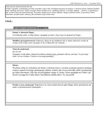 DĄB, Wspólnota św. Jana – 14 grudnia 2010 r. ĆWICZENIE PRZYGOTOWAWCZE Usiądę wygodnie, rozluźniając po kolei wszystkie części ciała. Następnie przyjrzę się miejscu, w którym jestem, ludziom dookoła mnie, spróbuję zauważyć każdy szczegół. Potem zamknę oczy i spróbuję usłyszeć wszystkie odgłosy – zarówno te głośniejsze, jak i te które ledwo do mnie docierają. Na koniec skupię się na swoim oddechu. Mogę wyobrazić sobie, że powietrze, które wdycham, ma jakiś kolor, zobaczę, jak rozchodzi się po moim ciele. Chleb... Część wstępna medytacji /ok. 3 – 5 min./ Stanąć w obecności Boga: Uświadomię sobie, że Bóg Ojciec, spogląda na mnie i chcę, bym Ja spojrzał na Niego... Modlitwa przygotowawcza: Poproszę, abym na tej modlitwie był w stanie odwrócić wzrok od swojej wizji swego życia i przyjąć, to na co Bóg chce mi wskazać... Tekst do medytacji: (Łk 22,19) Następnie wziął chleb, odmówił modlitwę dziękczynną, połamał i dał im, mówiąc: To jest moje ciało, za was wydane. Czyńcie to na moją pamiątkę”. Obraz: Wyobraź sobie że wchodzisz do domu w którym Jezus z swoimi uczniami spożywa kolację, czujesz zapach świeżego pachnącego chleba, widzisz jak rwą na kawałki chleb i przekazują go sobie nawzajem. Gdy tak się przyglądasz stojąc w cieniu, Jezus spogląda na Ciebie i po chwili wyciąga do Ciebie dłoń z kawałkiem chleba abyś i Ty się posilił. Prośba o owoc medytacji: Poproszę o to, bym umiał słyszeć głos Boga, który przemawia do mnie w prozaicznych sytuacjach.... Część właściwa medytacji /ok. 25 min./ 1) „...następnie wziął chleb...” (1) Zobaczyć „W tym czasie, gdy znowu zebrał się wielki tłum i nie mieli co jeść, przywołał uczniów i rzekł im: „Żal mi tego ludu. Przecież już trzy dni nie odstępują Mnie, a nie mają co jeść. Lecz jeśli ich puszczę do domu głodnych w drodze opadną z sił.” (mk8,2-4) (2) Rozważyć Jezus z troską spogląda na tłum ludzi który za nim idzie, a swoich uczniów uwrażliwia na potrzeby tego tłumu. - Czy jesteś wśród ludzi w wielkim tłumie który idzie za Jezusem, czy jesteś jednym z uczniów? - Jeżeli jesteś z tłumu, to czego oczekujesz od Jezusa? - Jeżeli uczniem, to każdego dnia Jezus przywołuje Ciebie i pokazuje Ci ludzi którzy są głodni, zmęczeni, osłabieni i których masz nakarmić chlebem bo inaczej nie wrócą do domu. - Może Jesteś w trudnej sytuacji i Jezus wysyła Ci swoich uczniów którzy się nad Tobą pochylają. Czy jesteś w stanie i chcesz przyjąć pomoc od drugiej osoby? 2) „… odmówił modlitwę dziękczynną, połamał...” (1) Zobaczyć „Wieczorem podeszli do Niego uczniowie i rzekli: Miejsce to jest odludne i jest już późno. Odeślij ludzi do wsi, aby kupili sobie żywności”. Lecz Jezus odpowiedział: „Nie muszą odchodzić. Wy dajcie im jeść!”. A oni na to: „Mamy tylko pięć chlebów i dwie ryby. Wtedy On polecił: „Przynieście mi je tutaj!” I rozkazał ludziom usiąść na trawie. Wziął pięć chlebów i dwie ryby, spojrzał w niebo i odmówił modlitwę uwielbienia. Potem łamał chleby. ” (mt14,15-19) (2) Rozważyć Łatwiej było by odesłać tych ludzi i tego chcieli uczniowie w „swojej litości” nad tym ludem,a Jezus bez cienia wątpliwości, wskazuje na nich samych, jako na tych którzy mają ich nakarmić. - Może jak uczniowie jesteś przerażony tym, że tak nie wiele masz i nie wiele znaczysz, a głodnych jest tak wielu? Tylko pięć chlebów i dwie ryby! A może nawet jeszcze mniej? Gdy tylko przyniesiesz Jezusowi to co masz, On wszystkim głodnym ludziom wokół Ciebie rozkaże usiąść na trawie, a Ciebie weźmie w dłonie jak chleb, spojrzy w niebo i podniesie Ciebie do góry i zacznie się nad Tobą i całym Twoim życiem modlić, dziękując za Ciebie! I gdy już się pomodli, zacznie łamać Ciebie dla innych... 3) „...i dał im, mówiąc: To jest moje ciało, za was wydane. Czyńcie to na moją pamiątkę...” (1) Zobaczyć „I dawał uczniom, a oni ludziom. Wszyscy jedli do syta, a zebranymi resztkami napełniono dwanaście koszy.” (mt14,19-20) (2) Rozważyć Jezus wziął Ciebie w dłonie, podniósł do góry, pobłogosławił, połamał i rozdał... Czy chcesz tego? -To co uczniowie przynieśli Jezusowi było niewiele warte ale w dłoniach Jezusa Ty i Twoje życie może stać się pokarmem dla całej rzeszy ludzi. -Wszyscy będą jedli do syta, a gdy przejdziesz do domu Ojca, z tych okruchów miłości zebranych w dwunastu koszach po Twoim życiu na ziemi, będą się karmić następne pokolenia... ROZMOWA KOŃCOWA Porozmawiam z Bogiem Ojcem, odnośnie tej medytacji (1) zobaczyłem i (2) rozważyłem... Prosić o zrozumienie, o zaufanie, o postawę wdzięczności, o to czego teraz najbardziej pragnę...