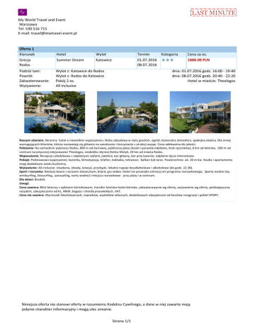 My World Travel and Event Warszawa Tel: 530 516 715 E-mail: [email protected] Oferta 1 Kierunek Grecja Rodos Hotel Summer Dream Podróż tam: Powrót: Zakwaterowanie: Wyżywienie: Wylot z: Katowice do Rodos Wylot z: Rodos do Katowice Pokój 2 os. All Inclusive Wylot Katowice Termin 01.07.2016 08.07.2016 Kategoria Cena za os. 1888.00 PLN dnia: 01.07.2016 godz. 16:00 - 19:40 dnia: 08.07.2016 godz. 20:40 - 22:20 Hotel w mieście: Theologos Naszym zdaniem: Skromny hotel o niewielkim wyposażeniu. Niska zabudowa w stylu greckim, ogród, kameralna atmosfera, spokojna okolica. Dla mniej wymagających klientów, którzy nastawiają się głównie na zwiedzanie i korzystanie z atrakcji wyspy. Cena adekwatna do jakości. Położenie: Na zachodnim wybrzeżu Rodos, 800 m od żwirowej, publicznej plaży (leżaki i parasole odpłatne, brak ręczników), 6 km od lotniska, 500 m od centrum turystycznej miejscowości Theologos, niedaleko słynnej Doliny Motyli, 20 km od miasta Rodos. Wyposażenie: Recepcja całodobowa z odpłatnymi sejfami, jadalnia, bar główny, bar przy basenie, odpłatne łącza internetowe. Pokoje: Podstawowo wyposażone; łazienka, klimatyzacja, telefon, lodówka, telewizor, balkon lub taras. Powierzchnia- ok. 20 m kw. Studia i apartamenty mają dodatkowo aneks kuchenny. Wyżywienie: All inclusive: śniadania, obiady, kolacje, przekąski, lokalne napoje bezalkoholowe i alkoholowe (do godz. 22.30). Sport i rozrywka: Nieduży basen z tarasem słonecznym, bilard, gry wideo. Hotel nie prowadzi animacji ani programu rozrywkowego, Sporty wodne (np. windsurfing, kitesurfing, parasailing, narty wodne) i miejsca rozrywkowe - przy plaży i w centrum. Dla dzieci: Brodzik. Uwagi: . Cena zawiera: Bilet lotniczy z opłatami lotniskowymi, transfer lotnisko-hotel-lotnisko, zakwaterowanie wg oferty, wyżywienie wg oferty, polskojęzyczny rezydent, ubezpieczenie od KL, NNW, bagażu i chorób przewlekłych, VAT. Cena nie zawiera: Wycieczek fakultatywnych, napiwków, wydatków własnych, dodatkowych ubezpieczeń od kosztów rezygnacji i pakiet SPORT. Niniejsza oferta nie stanowi oferty w rozumieniu Kodeksu Cywilnego, a dane w niej zawarte mają jedynie charakter informacyjny i mogą ulec zmianie. Strona 1/1 Powered by TCPDF (www.tcpdf.org)
