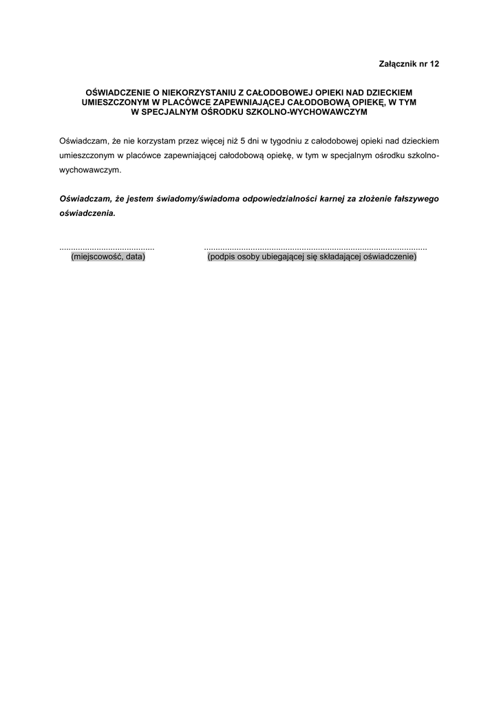 Załącznik nr 12 OŚWIADCZENIE O NIEKORZYSTANIU Z CAŁODOBOWEJ OPIEKI NAD DZIECKIEM UMIESZCZONYM W PLACÓWCE ZAPEWNIAJĄCEJ CAŁODOBOWĄ OPIEKĘ, W TYM W SPECJALNYM OŚRODKU SZKOLNO-WYCHOWAWCZYM Oświadczam, że nie korzystam przez więcej niż 5 dni w tygodniu z całodobowej opieki nad dzieckiem umieszczonym w placówce zapewniającej całodobową opiekę, w tym w specjalnym ośrodku szkolnowychowawczym. Oświadczam, że jestem świadomy/świadoma odpowiedzialności karnej za złożenie fałszywego oświadczenia. ......................................... (miejscowość, data) ................................................................................................ (podpis osoby ubiegającej się składającej oświadczenie)