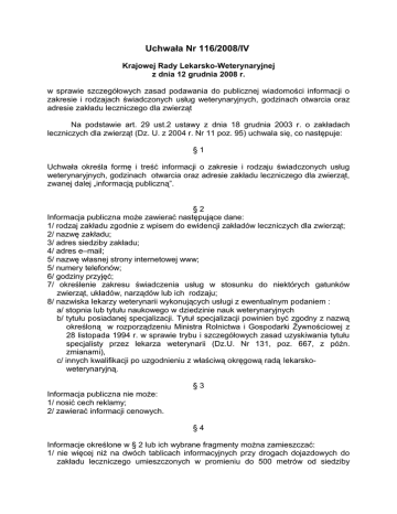 Uchwała Nr 116/2008/IV Krajowej Rady Lekarsko-Weterynaryjnej z dnia 12 grudnia 2008 r. w sprawie szczegółowych zasad podawania do publicznej wiadomości informacji o zakresie i rodzajach świadczonych usług weterynaryjnych, godzinach otwarcia oraz adresie zakładu leczniczego dla zwierząt Na podstawie art. 29 ust.2 ustawy z dnia 18 grudnia 2003 r. o zakładach leczniczych dla zwierząt (Dz. U. z 2004 r. Nr 11 poz. 95) uchwala się, co następuje: §1 Uchwała określa formę i treść informacji o zakresie i rodzaju świadczonych usług weterynaryjnych, godzinach otwarcia oraz adresie zakładu leczniczego dla zwierząt, zwanej dalej „informacją publiczną”. §2 Informacja publiczna może zawierać następujące dane: 1/ rodzaj zakładu zgodnie z wpisem do ewidencji zakładów leczniczych dla zwierząt; 2/ nazwę zakładu; 3/ adres siedziby zakładu; 4/ adres e–mail; 5/ nazwę własnej strony internetowej www; 5/ numery telefonów; 6/ godziny przyjęć; 7/ określenie zakresu świadczenia usług w stosunku do niektórych gatunków zwierząt, układów, narządów lub ich rodzaju; 8/ nazwiska lekarzy weterynarii wykonujących usługi z ewentualnym podaniem : a/ stopnia lub tytułu naukowego w dziedzinie nauk weterynaryjnych b/ tytułu posiadanej specjalizacji. Tytuł specjalizacji powinien być zgodny z nazwą określoną w rozporządzeniu Ministra Rolnictwa i Gospodarki Żywnościowej z 28 listopada 1994 r. w sprawie trybu i szczegółowych zasad uzyskiwania tytułu specjalisty przez lekarza weterynarii (Dz.U. Nr 131, poz. 667, z późn. zmianami), c/ innych kwalifikacji po uzgodnieniu z właściwą okręgową radą lekarskoweterynaryjną. §3 Informacja publiczna nie może: 1/ nosić cech reklamy; 2/ zawierać informacji cenowych. §4 Informacje określone w § 2 lub ich wybrane fragmenty można zamieszczać: 1/ nie więcej niż na dwóch tablicach informacyjnych przy drogach dojazdowych do zakładu leczniczego umieszczonych w promieniu do 500 metrów od siedziby zakładu. W przypadkach spornych dotyczących miejsca usytuowania tablic spór rozstrzyga okręgowa rada lekarsko weterynaryjna, 2/ na tablicy informacyjnej zewnątrz i wewnątrz obiektu zakładu leczniczego, 3/ w książkach telefonicznych w dziale dotyczącym usług weterynaryjnych, 4/ w informatorach gospodarczych, 5/ na stronach internetowych, 6/ na wizytówkach, 7/ w broszurach informacyjnych zakładu leczniczego, 8/ w prasie w rubrykach dotyczących usług weterynaryjnych, 9/ na samochodach używanych przez zakład leczniczy dla zwierząt, właściciela i kierownika zakładu leczniczego dla zwierząt. §5 1. Informacja prasowa i w książce telefonicznej nie może przekraczać powierzchni 1800 mm kwadratowych. 2. Niedozwolona jest wszelka aktywna forma informacji o zakładzie leczniczym dla zwierząt w formie: 1/ rozdawania ulotek, wizytówek, broszur lub innych materiałów reklamowych poza siedzibą zakładu leczniczego dla zwierząt; 2/ wysyłania ogłoszeń pocztą, internetowych i SMS-owych; 3/ artykułów na zamówienie w mediach; 4/ artykułów sponsorowanych w mediach; 5/ plakatów z wyjątkiem ogłoszeń o obowiązkowych szczepieniach, 6/ informacji wielkoformatowej przekraczającej 4 metry kwadratowe, 7/ informacji na samochodach, autobusach lub innych środkach komunikacji z wyjątkiem samochodu używanego przez zakład leczniczy dla zwierząt, właściciela i kierownika tego zakładu; 8/ tworzenia w celach reklamowania usług: prezentacji, filmów z przeprowadzanych zabiegów, stosowanego leczenia, dostępnych powszechnie (np. strony internetowe); 9/ umieszczania informacji na przystankach komunikacji publicznej. 3. Niedopuszczalne jest zamawianie lub sponsorowanie audycji i publikacji w mediach na temat zakładu leczniczego dla zwierząt. §6 Lekarz weterynarii prowadzący praktykę w zakładzie leczniczym dla zwierząt odpowiada za treść publikacji prasowych, radiowych i telewizyjnych z jego udziałem. Podawana przy tej okazji informacja może zawierać jego nazwisko, stopień lub tytuł naukowy wyłącznie w dziedzinie nauk weterynaryjnych i specjalizację określoną w rozporządzeniu Ministra Rolnictwa i Gospodarki Żywnościowej z 28 listopada 1994 r. w sprawie trybu i szczegółowych zasad uzyskiwania tytułu specjalisty przez lekarza weterynarii (Dz.U. Nr 131, poz. 667 z późn. zm.) oraz miejscowość, w której prowadzona jest praktyka. §7 Za realizację postanowień niniejszej uchwały odpowiedzialny jest kierownik zakładu leczniczego dla zwierząt. §8 Zakłady lecznicze dla zwierząt wpisane do ewidencji prowadzonej przez okręgowe rady lekarsko-weterynaryjne obowiązane są dostosować dotychczas stosowane formy informacji publicznej do przepisów uchwały do dnia 30 czerwca 2009 roku §9 . Traci moc uchwała Krajowej Rady Lekarsko-Weterynaryjnej Nr 109/2005/IV z dnia 25 maja 2005 roku w sprawie zasad informowania o wykonywaniu praktyk lekarskoweterynaryjnych, zmieniona uchwałą 82/2007/IV z dnia 6 września 2007 r. § 10 Uchwała wchodzi w życie z dniem podjęcia . Sekretarz Krajowej Rady LekarskoWeterynaryjnej Prezes Krajowej Rady LekarskoWeterynaryjnej ................................................ Marek Mastalerek ................................................ Tadeusz Jakubowski