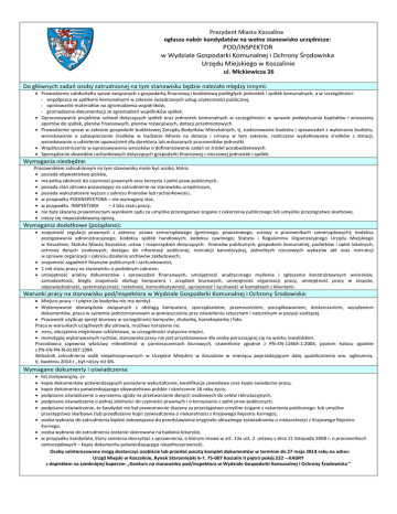 Prezydent Miasta Koszalina ogłasza nabór kandydatów na wolne stanowisko urzędnicze: POD/INSPEKTOR w Wydziale Gospodarki Komunalnej i Ochrony Środowiska Urzędu Miejskiego w Koszalinie ul. Mickiewicza 26 Do głównych zadań osoby zatrudnionej na tym stanowisku będzie należało między innymi: Prowadzenie całokształtu spraw związanych z gospodarką finansową i budżetową podległych jednostek i spółek komunalnych, a w szczególności: - współpraca ze spółkami komunalnymi w zakresie świadczonych usług użyteczności publicznej, - opiniowanie materiałów na zgromadzenia wspólników, - gromadzenie dokumentacji ze zgromadzeń wspólników spółek. Opracowywanie projektów uchwał dotyczących spółek oraz jednostek komunalnych w szczególności: w sprawie podwyższania kapitałów i wnoszenia aportów do spółek, planów finansowych, planów rozwojowych, dotacji przedmiotowych. Prowadzenie spraw w zakresie gospodarki budżetowej Zarządu Budynków Mieszkalnych, tj. nadzorowanie budżetu i sprawozdań z wykonania budżetu, wnioskowanie o zabezpieczenie środków w budżecie Miasta na dotacje i zmiany w tym zakresie, rozliczanie wydatkowania środków z dotacji, wnioskowanie o udzielenie upoważnień dla dyrektora lub wskazanych pracowników jednostki. Współuczestniczenie w opracowywaniu wniosków o dofinansowanie zadań ze źródeł pozabudżetowych. Sporządzanie dowodów rachunkowych dotyczących gospodarki finansowej i rzeczowej jednostek i spółek. Wymagania niezbędne: Pracownikiem zatrudnionym na tym stanowisku może być osoba, która: posiada obywatelstwo polskie, ma pełną zdolność do czynności prawnych oraz korzysta z pełni praw publicznych, posiada stan zdrowia pozwalający na zatrudnienie na stanowisku urzędniczym, posiada wykształcenie wyższe z zakresu finansów lub rachunkowości, w przypadku PODINSPEKTORA – nie wymagany staż, w przypadku INSPEKTORA – 3 lata stażu pracy, nie była skazana prawomocnym wyrokiem sądu za umyślne przestępstwo ścigane z oskarżenia publicznego lub umyślne przestępstwo skarbowe, cieszy się nieposzlakowaną opinią. Wymagania dodatkowe (pożądane): znajomość regulacji prawnych z zakresu: prawa samorządowego (gminnego, powiatowego, ustawy o pracownikach samorządowych); kodeksu postępowania administracyjnego; kodeksu spółek handlowych; kodeksu cywilnego; Statutu i Regulaminu Organizacyjnego Urzędu Miejskiego w Koszalinie; Statutu Miasta Koszalina; ustaw i rozporządzeń dotyczących: finansów publicznych; gospodarki komunalnej; podatków i opłat lokalnych; ochrony danych osobowych; dostępu do informacji publicznej; instrukcji kancelaryjnej, jednolitych rzeczowych wykazów akt oraz instrukcji w sprawie organizacji i zakresu działania archiwów zakładowych; znajomość zagadnień finansów publicznych i rachunkowości; 1 rok stażu pracy na stanowisku o podobnym zakresie; umiejętność analizy dokumentów i sprawozdań finansowych, umiejętność analitycznego myślenia i zgłaszania konstruktywnych wniosków, samodzielność, biegła znajomość obsługi komputera i urządzeń biurowych, umiejętność organizacji pracy, umiejętność pracy w zespole, odpowiedzialność, systematyczność, rzetelność, komunikatywność, uprzejmość i życzliwość w kontaktach z klientami. Warunki pracy na stanowisku pod/inspektora w Wydziale Gospodarki Komunalnej i Ochrony Środowiska: Miejsce pracy – I piętro (w budynku nie ma windy). Wykonywanie obowiązków związanych z obsługą komputera, sporządzaniem, przenoszeniem, porządkowaniem, dostarczaniem, wysyłaniem dokumentów, praca w systemie jednozmianowym w pomieszczeniu przy oświetleniu sztucznym i naturalnym w pozycji siedzącej. Pracownik użytkuje sprzęt biurowy w szczególności komputer, drukarkę, kserokopiarkę i faks. Praca w warunkach uciążliwych dla zdrowia, możliwe narażenie na: stres, obciążenia mięśniowo-szkieletowe, w szczególności statyczne mięśni, monotypię wykonywanych ruchów, stanowisko pracy nie jest przystosowane dla osoby poruszającej się na wózku inwalidzkim. Pracodawca zapewnia właściwy mikroklimat w pomieszczeniach biurowych, oświetlenie zgodnie z PN-EN-12464-1:2004, poziom hałasu zgodnie z PN-EN PN-N-01307:1994. Wskaźnik zatrudnienia osób niepełnosprawnych w Urzędzie Miejskim w Koszalinie w miesiącu poprzedzającym datę upublicznienia ww. ogłoszenia, tj. kwietniu 2014 r., był niższy niż 6%. Wymagane dokumenty i oświadczenia: list motywacyjny, cv kopie dokumentów potwierdzających posiadane wykształcenie, kwalifikacje zawodowe oraz kopie świadectw pracy, kopie dokumentu potwierdzającego obywatelstwo polskie i ukończenie 18 roku życia, podpisane oświadczenie o wyrażeniu zgody na przetwarzanie danych osobowych do celów rekrutacyjnych, podpisane oświadczenie o pełnej zdolności do czynności prawnych i o korzystaniu z pełni praw publicznych, podpisane oświadczenie, że kandydat nie był prawomocnie skazany za przestępstwo umyślne ścigane z oskarżenia publicznego lub umyślne przestępstwo skarbowe (lub przedłożenie kopii zaświadczenia o niekaralności z Krajowego Rejestru Karnego), osoba wybrana do zatrudnienia będzie zobowiązana do przedstawienia oryginału aktualnego zaświadczenia o niekaralności z Krajowego Rejestru Karnego, osoba wybrana do zatrudnienia zostanie skierowana na badania lekarskie, w przypadku kandydata, który zamierza skorzystać z uprawnienia, o którym mowa w art. 13a ust. 2 ustawy z dnia 21 listopada 2008 r. o pracownikach samorządowych – kopia dokumentu potwierdzającego niepełnosprawność. Osoby zainteresowane mogą dostarczyć osobiście lub przesłać pocztą komplet dokumentów w terminie do 27 maja 2014 roku na adres: Urząd Miejski w Koszalinie, Rynek Staromiejski 6-7, 75-007 Koszalin II piętro pokój 222 – KADRY z dopiskiem na zamkniętej kopercie: „Konkurs na stanowisko pod/inspektora w Wydziale Gospodarki Komunalnej i Ochrony 