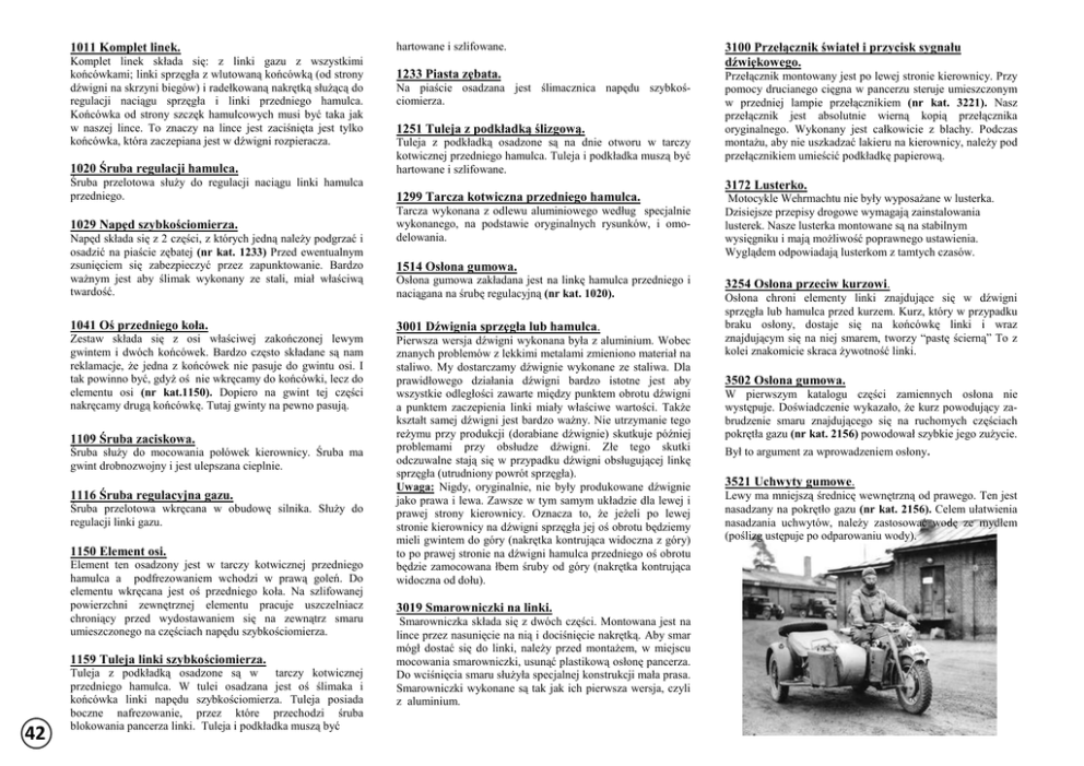 1011 Komplet linek. Komplet linek składa się: z linki gazu z wszystkimi końcówkami; linki sprzęgła z wlutowaną końcówką (od strony dźwigni na skrzyni biegów) i radełkowaną nakrętką służącą do regulacji naciągu sprzęgła i linki przedniego hamulca. Końcówka od strony szczęk hamulcowych musi być taka jak w naszej lince. To znaczy na lince jest zaciśnięta jest tylko końcówka, która zaczepiana jest w dźwigni rozpieracza. 3100 Przełącznik świateł i przycisk sygnału dźwiękowego. 1233 Piasta zębata. Przełącznik montowany jest po lewej stronie kierownicy. Przy pomocy drucianego cięgna w pancerzu steruje umieszczonym w przedniej lampie przełącznikiem (nr kat. 3221). Nasz przełącznik jest absolutnie wierną kopią przełącznika oryginalnego. Wykonany jest całkowicie z blachy. Podczas montażu, aby nie uszkadzać lakieru na kierownicy, należy pod przełącznikiem umieścić podkładkę papierową. Na piaście osadzana jest ślimacznica napędu szybkościomierza. 1251 Tuleja z podkładką ślizgową. 1020 Śruba regulacji hamulca. Tuleja z podkładką osadzone są na dnie otworu w tarczy kotwicznej przedniego hamulca. Tuleja i podkładka muszą być hartowane i szlifowane. Śruba przelotowa służy do regulacji naciągu linki hamulca przedniego. 1299 Tarcza kotwiczna przedniego hamulca. 1029 Napęd szybkościomierza. Napęd składa się z 2 części, z których jedną należy podgrzać i osadzić na piaście zębatej (nr kat. 1233) Przed ewentualnym zsunięciem się zabezpieczyć przez zapunktowanie. Bardzo ważnym jest aby ślimak wykonany ze stali, miał właściwą twardość. 3172 Lusterko. Tarcza wykonana z odlewu aluminiowego według specjalnie wykonanego, na podstawie oryginalnych rysunków, i omodelowania. Osłona gumowa zakładana jest na linkę hamulca przedniego i naciągana na śrubę regulacyjną (nr kat. 1020). 3001 Dźwignia sprzęgła lub hamulca. Zestaw składa się z osi właściwej zakończonej lewym gwintem i dwóch końcówek. Bardzo często składane są nam reklamacje, że jedna z końcówek nie pasuje do gwintu osi. I tak powinno być, gdyż oś nie wkręcamy do końcówki, lecz do elementu osi (nr kat.1150). Dopiero na gwint tej części nakręcamy drugą końcówkę. Tutaj gwinty na pewno pasują. Pierwsza wersja dźwigni wykonana była z aluminium. Wobec znanych problemów z lekkimi metalami zmieniono materiał na staliwo. My dostarczamy dźwignie wykonane ze staliwa. Dla prawidłowego działania dźwigni bardzo istotne jest aby wszystkie odległości zawarte między punktem obrotu dźwigni a punktem zaczepienia linki miały właściwe wartości. Także kształt samej dźwigni jest bardzo ważny. Nie utrzymanie tego reżymu przy produkcji (dorabiane dźwignie) skutkuje później problemami przy obsłudze dźwigni. Złe tego skutki odczuwalne stają się w przypadku dźwigni obsługującej linkę sprzęgła (utrudniony powrót sprzęgła). Uwaga: Nigdy, oryginalnie, nie były produkowane dźwignie jako prawa i lewa. Zawsze w tym samym układzie dla lewej i prawej strony kierownicy. Oznacza to, że jeżeli po lewej stronie kierownicy na dźwigni sprzęgła jej oś obrotu będziemy mieli gwintem do góry (nakrętka kontrująca widoczna z góry) to po prawej stronie na dźwigni hamulca przedniego oś obrotu będzie zamocowana łbem śruby od góry (nakrętka kontrująca widoczna od dołu). Śruba służy do mocowania połówek kierownicy. Śruba ma gwint drobnozwojny i jest ulepszana cieplnie. 1116 Śruba regulacyjna gazu. Śruba przelotowa wkręcana w obudowę silnika. Służy do regulacji linki gazu. 1150 Element osi. Element ten osadzony jest w tarczy kotwicznej przedniego hamulca a podfrezowaniem wchodzi w prawą goleń. Do elementu wkręcana jest oś przedniego koła. Na szlifowanej powierzchni zewnętrznej elementu pracuje uszczelniacz chroniący przed wydostawaniem się na zewnątrz smaru umieszczonego na częściach napędu szybkościomierza. 1159 Tuleja linki szybkościomierza. Tuleja z podkładką osadzone są w tarczy kotwicznej przedniego hamulca. W tulei osadzana jest oś ślimaka i końcówka linki napędu szybkościomierza. Tuleja posiada boczne nafrezowanie, przez które przechodzi śruba blokowania pancerza linki. Tuleja i podkładka muszą być Motocykle Wehrmachtu nie były wyposażane w lusterka. Dzisiejsze przepisy drogowe wymagają zainstalowania lusterek. Nasze lusterka montowane są na stabilnym wysięgniku i mają możliwość poprawnego ustawienia. Wyglądem odpowiadają lusterkom z tamtych czasów. 1514 Osłona gumowa. 1041 Oś przedniego koła. 1109 Śruba zaciskowa. 42 hartowane i szlifowane. 3019 Smarowniczki na linki. Smarowniczka składa się z dwóch części. Montowana jest na lince przez nasunięcie na nią i dociśnięcie nakrętką. Aby smar mógł dostać się do linki, należy przed montażem, w miejscu mocowania smarowniczki, usunąć plastikową osłonę pancerza. Do wciśnięcia smaru służyła specjalnej konstrukcji mała prasa. Smarowniczki wykonane są tak jak ich pierwsza wersja, czyli z aluminium. 3254 Osłona przeciw kurzowi. Osłona chroni elementy linki znajdujące się w dźwigni sprzęgła lub hamulca przed kurzem. Kurz, który w przypadku braku osłony, dostaje się na końcówkę linki i wraz znajdującym się na niej smarem, tworzy “pastę ścierną” To z kolei znakomicie skraca żywotność linki. 3502 Osłona gumowa. W pierwszym katalogu części zamiennych osłona nie występuje. Doświadczenie wykazało, że kurz powodujący zabrudzenie smaru znajdującego się na ruchomych częściach pokrętła gazu (nr kat. 2156) powodował szybkie jego zużycie. Był to argument za wprowadzeniem osłony. 3521 Uchwyty gumowe. Lewy ma mniejszą średnicę wewnętrzną od prawego. Ten jest nasadzany na pokrętło gazu (nr kat. 2156). Celem ułatwienia nasadzania uchwytów, należy zastosować wodę ze mydłem (poślizg ustępuje po odparowaniu wody).