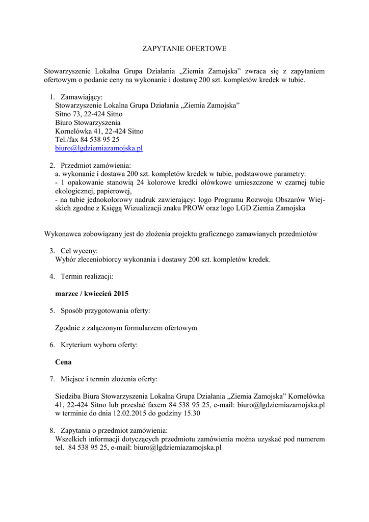 ZAPYTANIE OFERTOWE Stowarzyszenie Lokalna Grupa Działania „Ziemia Zamojska” zwraca się z zapytaniem ofertowym o podanie ceny na wykonanie i dostawę 200 szt. kompletów kredek w tubie. 1. Zamawiający: Stowarzyszenie Lokalna Grupa Działania „Ziemia Zamojska” Sitno 73, 22-424 Sitno Biuro Stowarzyszenia Kornelówka 41, 22-424 Sitno Tel./fax 84 538 95 25 [email protected] 2. Przedmiot zamówienia: a. wykonanie i dostawa 200 szt. kompletów kredek w tubie, podstawowe parametry: - 1 opakowanie stanowią 24 kolorowe kredki ołówkowe umieszczone w czarnej tubie ekologicznej, papierowej, - na tubie jednokolorowy nadruk zawierający: logo Programu Rozwoju Obszarów Wiejskich zgodne z Księgą Wizualizacji znaku PROW oraz logo LGD Ziemia Zamojska Wykonawca zobowiązany jest do złożenia projektu graficznego zamawianych przedmiotów 3. Cel wyceny: Wybór zleceniobiorcy wykonania i dostawy 200 szt. kompletów kredek. 4. Termin realizacji: marzec / kwiecień 2015 5. Sposób przygotowania oferty: Zgodnie z załączonym formularzem ofertowym 6. Kryterium wyboru oferty: Cena 7. Miejsce i termin złożenia oferty: Siedziba Biura Stowarzyszenia Lokalna Grupa Działania „Ziemia Zamojska” Kornelówka 41, 22-424 Sitno lub przesłać faxem 84 538 95 25, e-mail: [email protected] w terminie do dnia 12.02.2015 do godziny 15.30 8. Zapytania o przedmiot zamówienia: Wszelkich informacji dotyczących przedmiotu zamówienia można uzyskać pod numerem tel. 84 538 95 25, e-mail: [email protected]