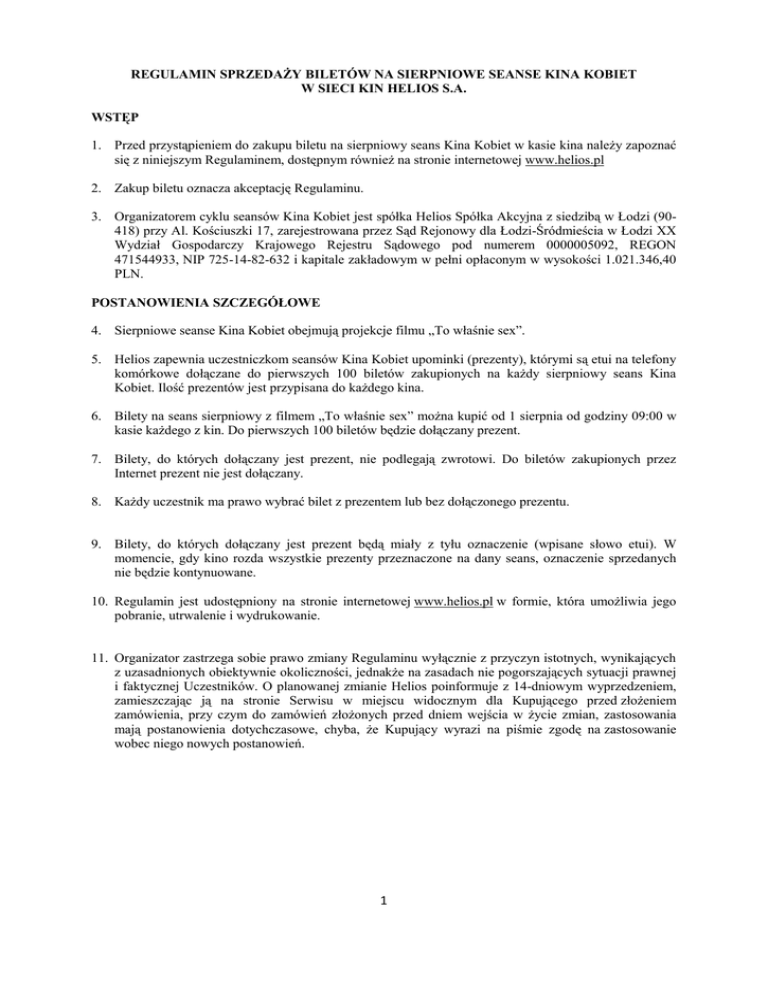 REGULAMIN SPRZEDAŻY BILETÓW NA SIERPNIOWE SEANSE KINA KOBIET W SIECI KIN HELIOS S.A. WSTĘP 1. Przed przystąpieniem do zakupu biletu na sierpniowy seans Kina Kobiet w kasie kina należy zapoznać się z niniejszym Regulaminem, dostępnym również na stronie internetowej www.helios.pl 2. Zakup biletu oznacza akceptację Regulaminu. 3. Organizatorem cyklu seansów Kina Kobiet jest spółka Helios Spółka Akcyjna z siedzibą w Łodzi (90418) przy Al. Kościuszki 17, zarejestrowana przez Sąd Rejonowy dla Łodzi-Śródmieścia w Łodzi XX Wydział Gospodarczy Krajowego Rejestru Sądowego pod numerem 0000005092, REGON 471544933, NIP 725-14-82-632 i kapitale zakładowym w pełni opłaconym w wysokości 1.021.346,40 PLN. POSTANOWIENIA SZCZEGÓŁOWE 4. Sierpniowe seanse Kina Kobiet obejmują projekcje filmu „To właśnie sex”. 5. Helios zapewnia uczestniczkom seansów Kina Kobiet upominki (prezenty), którymi są etui na telefony komórkowe dołączane do pierwszych 100 biletów zakupionych na każdy sierpniowy seans Kina Kobiet. Ilość prezentów jest przypisana do każdego kina. 6. Bilety na seans sierpniowy z filmem „To właśnie sex” można kupić od 1 sierpnia od godziny 09:00 w kasie każdego z kin. Do pierwszych 100 biletów będzie dołączany prezent. 7. Bilety, do których dołączany jest prezent, nie podlegają zwrotowi. Do biletów zakupionych przez Internet prezent nie jest dołączany. 8. Każdy uczestnik ma prawo wybrać bilet z prezentem lub bez dołączonego prezentu. 9. Bilety, do których dołączany jest prezent będą miały z tyłu oznaczenie (wpisane słowo etui). W momencie, gdy kino rozda wszystkie prezenty przeznaczone na dany seans, oznaczenie sprzedanych nie będzie kontynuowane. 10. Regulamin jest udostępniony na stronie internetowej www.helios.pl w formie, która umożliwia jego pobranie, utrwalenie i wydrukowanie. 11. Organizator zastrzega sobie prawo zmiany Regulaminu wyłącznie z przyczyn istotnych, wynikających z uzasadnionych obiektywnie okoliczności, jednakże na zasadach nie pogorszających sytuacji prawnej i faktycznej Uczestników. O planowanej zmianie Helios poinformuje z 14-dniowym wyprzedzeniem, zamieszczając ją na stronie Serwisu w miejscu widocznym dla Kupującego przed złożeniem zamówienia, przy czym do zamówień złożonych przed dniem wejścia w życie zmian, zastosowania mają postanowienia dotychczasowe, chyba, że Kupujący wyrazi na piśmie zgodę na zastosowanie wobec niego nowych postanowień. 1