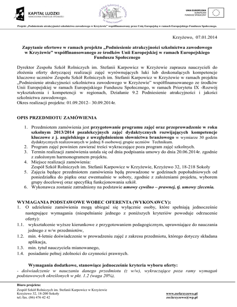 Projekt „Podniesienie atrakcyjności szkolnictwa zawodowego w Krzyżewie” współfinansowany przez Unię Europejską w ramach Europejskiego Funduszu Społecznego. Krzyżewo, 07.01.2014 Zapytanie ofertowe w ramach projektu „Podniesienie atrakcyjności szkolnictwa zawodowego w Krzyżewie” współfinansowanego ze środków Unii Europejskiej w ramach Europejskiego Funduszu Społecznego Dyrektor Zespołu Szkół Rolniczych im. Stefanii Karpowicz w Krzyżewie zaprasza nauczycieli do złożenia oferty dotyczącej realizacji zajęć wyrównujących luki lub doskonalących kompetencje kluczowe uczniów Zespołu Szkół Rolniczych im. Stefanii Karpowicz w Krzyżewie w ramach projektu „Podniesienie atrakcyjności szkolnictwa zawodowego w Krzyżewie” współfinansowanego ze środków Unii Europejskiej w ramach Europejskiego Funduszu Społecznego, w ramach Priorytetu IX -Rozwój wykształcenia i kompetencji w regionach, Działanie 9.2 Podniesienie atrakcyjności i jakości szkolnictwa zawodowego. Okres realizacji projektu: 01.09.2012– 30.09.2014r. OPIS PRZEDMIOTU ZAMÓWIENIA 1. Przedmiotem zamówienia jest przygotowanie programu zajęć oraz przeprowadzenie w roku szkolnym 2013/2014 pozalekcyjnych zajęć dydaktycznych rozwijających kompetencje kluczowe z j. angielskiego z uwzględnieniem słownictwa branżowego w wymiarze 30 godzin dydaktycznych realizowanych w jednej 8 osobowej grupie uczniów Technikum. 2. Program zajęć powinien zawierać treści wykraczające poza program zajęć szkolnych. 3. Termin realizacji zamówienia ustala się od dnia podpisania umowy do dnia 20.06.2014r. zgodnie z założonym harmonogramem projektu. 4. Miejsce realizacji zamówienia: Zespół Szkół Rolniczych im. Stefanii Karpowicz w Krzyżewie, Krzyżewo 32, 18-218 Sokoły 5. Zajęcia będące przedmiotem zamówienia będą prowadzone w godzinach popołudniowych od poniedziałku do piątku oraz ewentualnie w soboty, zgodnie z założeniami projektu, wyborem grupy docelowej oraz specyfiką funkcjonowania szkół. 6. Wykonawca zostanie zatrudniony na podstawie umowy cywilno – prawnej, tj. umowy zlecenia. WYMAGANIA PODSTAWOWE WOBEC OFERENTA (WYKONAWCY): 1. O udzielenie zamówienia mogą ubiegać się wyłącznie osoby, które spełniają jednocześnie następujące wymagania (niespełnianie jednego z poniższych kryteriów powoduje odrzucenie oferty): 1.1. wykształcenie wyższe kierunkowe z przygotowaniem pedagogicznym, uprawniające do nauczania jednego z w/w przedmiotów, 1.2. min. 4-letnie doświadczenie w prowadzeniu zajęć z zakresu przedmiotu, którego dotyczy składana aplikacja, 1.3. min. tytuł nauczyciela mianowanego, 1.4. posiadanie pełnej zdolności do czynności prawnych. Wymagania dodatkowe, stanowiące jednocześnie kryteria wyboru oferty: - doświadczenie w nauczaniu danego przedmiotu (z w/w), wykraczające poza ramy wymagań podstawowych określonych w pkt. 1.2 (waga 20%), Biuro projektu: Zespół Szkół Rolniczych im. Stefanii Karpowicz w Krzyżewie Krzyżewo 32, 18-200 Sokoły tel./fax. (86) 476 42 42 www.zsrkrzyzewo.pl [email protected] Projekt „Podniesienie atrakcyjności szkolnictwa zawodowego w Krzyżewie” współfinansowany przez Unię Europejską w ramach Europejskiego Funduszu Społecznego. - umiejętność wykorzystywania w procesie dydaktycznym nowatorskich i autorskich metod pracy, w tym również uwzględniających indywidualne różnice i potrzeby uczniów, oraz wykorzystywania nowoczesnych technologii, w tym e-learningu (waga 10%), - udokumentowany udział jako egzaminator egzaminu maturalnego (waga 20%), - doświadczenie w pracy w szkole zawodowej (waga 20%), - udokumentowane odbyte kursy i szkolenia podnoszące kwalifikacje zawodowe (waga 20%), - referencje dyrektora placówki, zatrudniającej danego nauczyciela, potwierdzające jakość pracy nauczyciela (waga 10%) - cena brutto za 1 godzinę zajęć (waga 50%) FORMY I SPOSÓB PRZEKAZANIA OFERTY Osoby zainteresowane proszone są o dostarczenie Formularza ofertowego - załącznik nr. 1 oraz następujących dokumentów: CV, kopie dokumentów i/lub oświadczenia potwierdzające wymagania podstawowe i dodatkowe. CV powinno zawierać klauzulę o wyrażeniu zgody na przetwarzanie danych osobowych na potrzeby rekrutacji. Oferty należy zgłaszać do dnia 10.02.2014 r. do siedziby Zamawiającego (osobiście lub za pośrednictwem poczty, decyduje data wpływu do Zamawiającego). OCENA I WYBÓR NAJKORZYSTNIEJSZEJ OFERT Ocena złożonych dokumentów aplikacyjnych zostanie dokonana w dniu 10.02.2014 r. Wybór najkorzystniejszej oferty zostanie dokonany na podstawie spełniania kryteriów podstawowych oraz dodatkowych według wagi punktowej. Wybór najkorzystniejszej oferty zostanie zamieszczony na stronie internetowej Zamawiającego. Dodatkowych informacji udziela Pan Jacek Tomkiel – Kierownik projektu, tel. 864764242 Biuro projektu: Zespół Szkół Rolniczych im. Stefanii Karpowicz w Krzyżewie Krzyżewo 32, 18-200 Sokoły tel./fax. (86) 476 42 42 www.zsrkrzyzewo.pl [email protected] Projekt „Podniesienie atrakcyjności szkolnictwa zawodowego w Krzyżewie” współfinansowany przez Unię Europejską w ramach Europejskiego Funduszu Społecznego. Załącznik nr 1 do Zapytania ofertowego FORMULARZ OFERTOWY Ja, …………………………………………………………. odpowiadając na zapytanie ofertowe dotyczące realizacji zajęć wyrównujących luki lub doskonalących kompetencje kluczowe uczniów Zespołu Szkół Rolniczych im. Stefanii Karpowicz w Krzyżewie w ramach projektu „Podniesienie atrakcyjności szkolnictwa zawodowego w Krzyżewie” współfinansowanego ze środków Unii Europejskiej w ramach Europejskiego Funduszu Społecznego składam ofertę na przeprowadzenie zajęć: pozalekcyjne zajęcia dydaktyczne rozwijające kompetencje kluczowe z j. angielskiego z uwzględnieniem słownictwa branżowego w wymiarze 30 godzin dydaktycznych realizowanych w jednej 8 osobowej grupie uczniów Technikum.