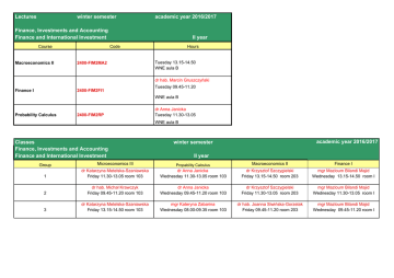 Lectures winter semester academic year 2016/2017 Finance, Investments and Accounting Finance and International Investment Course Macroeconomics II II year Code 2400-FIM2MA2 Hours Tuesday 13.15-14.50 WNE aula B dr hab. Marcin Gruszczyński Finance I 2400-FIM2FI1 Tuesday 09.45-11.20 WNE aula B Probability Calculus 2400-FIM2RP dr Anna Janicka Tuesday 11.30-13.05 WNE aula B Classes Finance, Investments and Accounting Finance and International Investment Group Microeconomics III academic year 2016/2017 winter semester II year Propability Calculus Macroeconomics II Finance I 1 dr Katarzyna Metelska-Szaniawska Friday 11.30-13.05 room 103 dr Anna Janicka Wednesday 11.30-13.05 room 103 dr Krzysztof Szczygielski Friday 13.15-14.50 room 203 mgr Mazloum Bilandi Majid Wednesday 13.15-14.50 room I 2 dr hab. Michał Krawczyk Friday 09.45-11.20 room 103 dr Anna Janicka Wednesday 09.45-11.20 room 103 dr Krzysztof Szczygielski Friday 11.30-13.05 room 203 mgr Mazloum Bilandi Majid Wednesday 11.30-13.05 room I 3 dr Katarzyna Metelska-Szaniawska Friday 13.15-14.50 room 103 mgr Kateryna Zabarina Wednesday 08.00-09.35 room 103 dr hab. Joanna Siwińska-Gorzelak Friday 09.45-11.20 room 203 mgr Mazloum Bilandi Majid Wednesday 09.45-11.20 room I