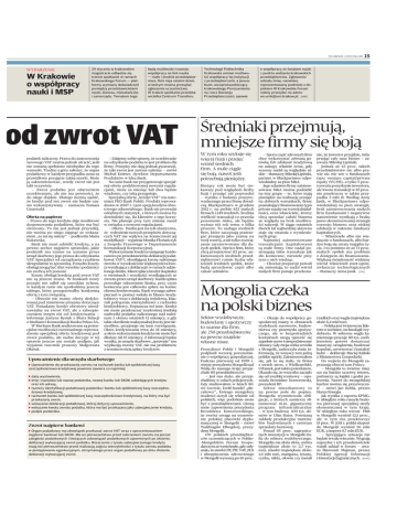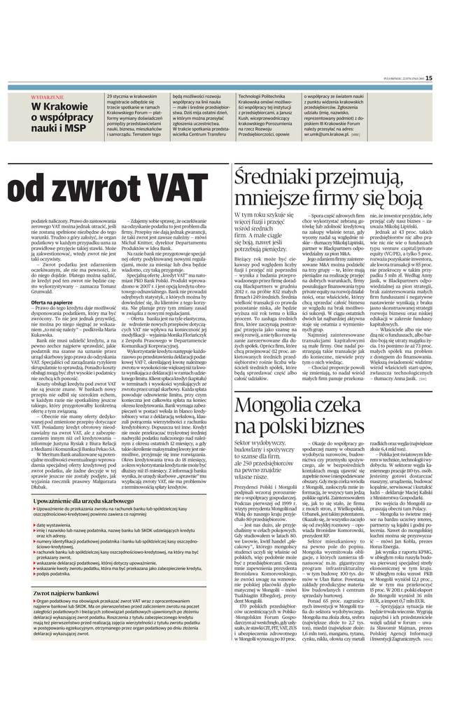 PULS BIZNESU, 22 STYCZNIA 2013 WYDARZENIE W Krakowie o współpracy nauki i MSP 29 stycznia w krakowskim magistracie odbędzie się trzecie spotkanie w ramach Krakowskiego Forum — platformy wymiany doświadczeń pomiędzy przedstawicielami nauki, biznesu, mieszkańców i samorządu. Tematem tego będą możliwości rozwoju współpracy na linii nauka — małe i średnie przedsiębiorstwa. Dziś mija ostatni dzień, w którym można przesyłać zgłoszenia uczestnictwa. W trakcie spotkania przedstawicielka Centrum Transferu od zwrot VAT podatek naliczony. Prawo do zastosowania zerowego VAT można jednak utracić, jeśli nie zostaną spełnione niezbędne do tego warunki. Trudno z góry założyć, że organ podatkowy w każdym przypadku uzna za prawidłowe przyjęcie takiej stawki. Może ją zakwestionować, wtedy zwrot nie jest taki oczywisty. — Zwrot podatku jest zdarzeniem oczekiwanym, ale nie ma pewności, że do niego dojdzie. Dlatego można sądzić, że kredyt pod ten zwrot nie będzie często wykorzystywany — zaznacza Tomasz Grunwald. Oferta na papierze — Prawo do tego kredytu daje możliwość dysponowania podatkiem, który ma być zwrócony. To nie jest jednak przywilej, nie można po niego sięgnąć ze wskazaniem „to mi się należy” — podkreśla Maria Kukawska. Bank nie musi udzielić kredytu, a na pewno zechce najpierw sprawdzić, jakie podatnik ma szanse na uznanie przez urząd skarbowy jego prawa do odzyskania VAT. Specjaliści od zarządzania ryzykiem skrupulatnie to sprawdzą. Ponadto koszty obsługi mogą być zbyt wysokie i podatnicy nie zechcą ich ponosić. Koszty obsługi kredytu pod zwrot VAT nie są jeszcze znane. W bankach nowy przepis nie odbił się szerokim echem, w każdym razie nie spotkaliśmy jeszcze takiego, który przygotowałby konkretną ofertę z tym związaną. — Obecnie nie mamy oferty dedykowanej pod zmienione przepisy dotyczące VAT. Posiadamy kredyt obrotowy nieodnawialny na zwrot VAT, ale z zabezpieczeniem innym niż cel kredytowania — informuje Justyna Rysiak z Biura Relacji z Mediami i Komunikacji Banku Pekao SA. W Meritum Bank analizowane są potencjalne możliwości ewentualnego wprowadzenia specjalnej oferty kredytowej pod zwrot podatku, ale żadne decyzje w tej sprawie jeszcze nie zostały podjęte, jak wyjaśnia rzecznik prasowy Małgorzata Dłubak. — Zdajemy sobie sprawę, że oczekiwanie na odzyskanie podatku to jest problem dla firmy. Przepisy nie dają jednak gwarancji, że taki zwrot jest zawsze należny — mówi Michał Knitter, dyrektor Departamentu Produktów w Idea Bank. Na razie bank nie przygotowuje specjalnej oferty podyktowanej nowymi regulacjami, może za miesiąc lub dwa będzie wiadomo, czy taką przygotuje. Specjalną ofertę „kredyt VAT” ma natomiast PKO Bank Polski. Produkt wprowadzono w 2007 r. i jest opcją kredytu obrotowego odnawialnego. Bank nie prowadzi odrębnych statystyk, z których można by dowiedzieć się, ilu klientów z tego korzysta. Nie planuje przy tym zmiany zasad w związku z nowymi regulacjami. — Oferta banku jest na tyle elastyczna, że wdrożenie nowych przepisów dotyczących VAT nie wpływa na konieczność jej modyfikacji — wyjaśnia Monika Floriańczyk z Zespołu Prasowego w Departamencie Komunikacji Korporacyjnej. Wykorzystanie kredytu następuje każdorazowo po przedstawieniu deklaracji podatkowej VAT-7, określającej kwotę należnego zwrotu w wysokości nie większej niż ta kwota wynikająca z deklaracji i w ramach udzielonego limitu. Klient spłaca kredyt (kapitału) w terminach i wysokości wynikających ze zwrotu przez urząd skarbowy. Każda spłata powoduje odnowienie limitu, przy czym konieczna jest całkowita spłata na koniec okresu kredytowania. Bank wymaga zabezpieczeń w postaci weksla in blanco kredytobiorcy wraz z deklaracją wekslową, klauzuli potrącenia wierzytelności z rachunku kredytobiorcy. Dopuszcza też inne. Kredyt nie może przekraczać trzykrotnej średniej nadwyżki podatku naliczonego nad należnym z okresu ostatnich 12 miesięcy, a gdy takie określenie maksymalnej kwoty jest niemożliwe, przyjmuje się inne rozwiązania. Okres kredytowania trwa do 18 miesięcy, a okres wykorzystania kredytu nie może być dłuższy niż 15 miesięcy. Z informacji banku wynika, że urzędy skarbowe „sprawnie” mu wypłacają zwroty VAT, nie ma problemów z terminowością spłaty kredytów. Upoważnienie dla urzędu skarbowego Upoważnienie do przekazania zwrotu na rachunek banku lub spółdzielczej kasy oszczędnościowo-kredytowej powinno zawiera co najmniej: datę wystawienia, imię i nazwisko lub nazwę podatnika, nazwę banku lub SKOK udzielających kredytu oraz ich adresy, numery identyfikacji podatkowej podatnika i banku lub spółdzielczej kasy oszczędnościowo-kredytowej, rachunek banku lub spółdzielczej kasy oszczędnościowo-kredytowej, na który ma być przekazany zwrot, wskazanie deklaracji podatkowej, której dotyczy upoważnienie, wskazanie kwoty zwrotu podatku, która ma być przekazana jako zabezpieczenie kredytu, podpis podatnika. Zwrot najpierw bankowi Organ podatkowy ma obowiązek przekazać zwrot VAT wraz z oprocentowaniem najpierw bankowi lub SKOK. Ma on pierwszeństwo przed zaliczeniem zwrotu na poczet zaległości podatkowych i bieżących zobowiązań podatkowych ujawnionych po złożeniu deklaracji wykazującej zwrot podatku. Roszczenia z tytułu zabezpieczonego kredytu mają też pierwszeństwo przed realizacją zajęcia wierzytelności z tytułu zwrotu podatku w postępowaniu egzekucyjnym, otrzymanego przez organ podatkowy po dniu złożenia deklaracji wykazującej zwrot. Technologii Politechnika Krakowska omówi możliwości współpracy tej instytucji z przedsiębiorcami, a Janusz Kush, wiceprzewodniczący krakowskiego Porozumienia na rzecz Rozwoju Przedsiębiorczości, opowie 15 o współpracy ze światem nauki z punktu widzenia krakowskich przedsiębiorców. Zgłoszenia udziału (imię, nazwisko, reprezentowa