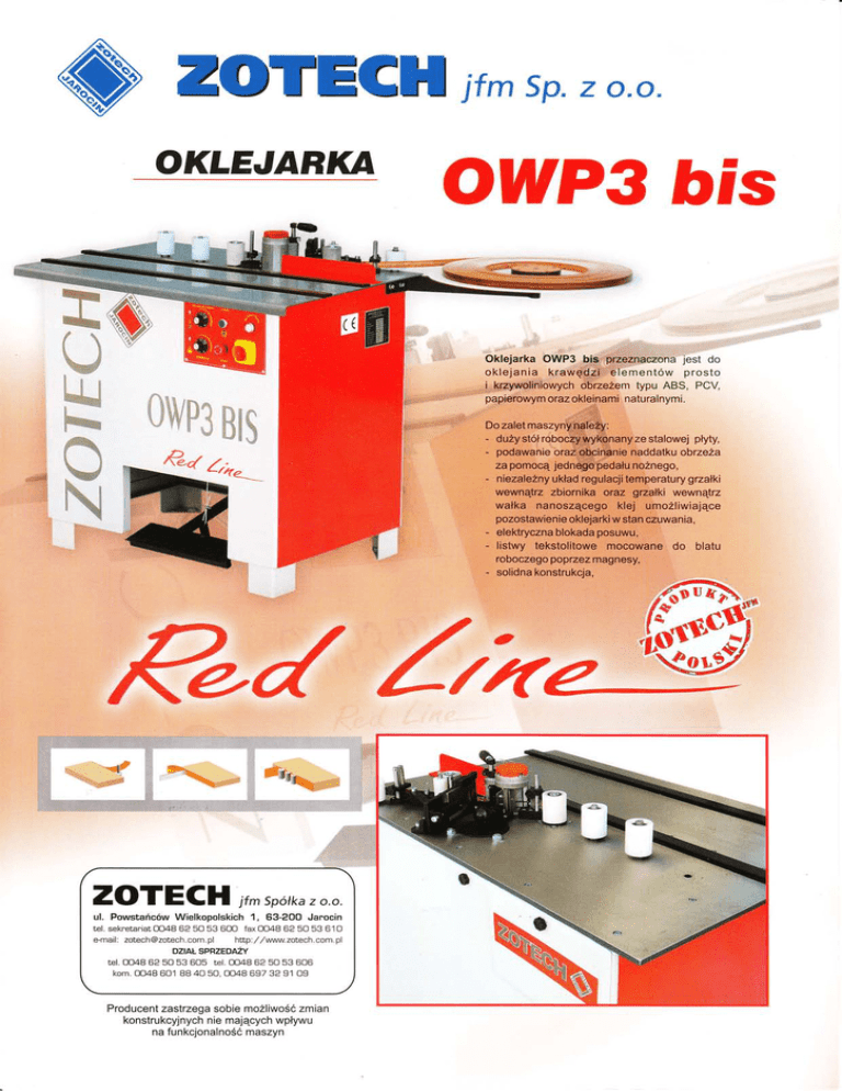 /'\r** ^/...-\\-ł\ /s\ ,^6\ ,/t \s_\ aaJ\-5t \ONZ Ś>v/ \o\-2, v ?offiECH OKLEJAR'(A w @ fĘ M Es* jfmsp. . zo,o. OWP3 bis ementow prosto typu ABS, PCV, re P% ffi naturalnymi. M reM zoTECH i,-Społkazo.o. u|. Powsta cÓw Wie|kopo|skich 1' 63-200 Jarocin tel. sekretaniat OO48 62 50 53 600 fax OO4B 62 50 53 61O e-mail: [email protected] htlp.//www.zotech.com.pl oznt spRzeonżv tel. OO48 62 50 53 605 tel. OO48 62 50 53 6OE kom. OO4B 601 BB 40 50, OO4B 697 32 9'l Og Producent zastrzega sobie moz|iwośÓ zmian konstrukcyjnych nie mających wpływu na funkcjona|nośÓ maszyn OKLEJAR|ł(A OWP3 bis + HIOO fą ,# M p% ŁBąeff# ry= ,#**r a M % !7i''" rl ffi#% f-- ---rt*-- ", OKLEJARKA OWP3 bls + H100 przystosowana jest do ok|ejania obrzeŻem o szerokości do 105 mm. Maszyna znajduje szczegolnie zastosowanie w produkcji mebli w okleinach naturalnych. Oklejarka dokleja rowniez szerokie obrzeŻa PCV i ABS. Konstrukcja wałka k|ejowego zapewnia idea|ne nałozenie k|eju na całej szerokości obrzeza. Prezentowana oklejarka wyposazona jest w n/w wyposazenie dodatkowe: - stoliki boczne SB, powiększające długoścb|atu roboczego do 1600 mm, - dodatkowe dogrzewanie DG, - podporę materiału PM1. Zespoł ręcznei gilotyny RG Zespoł ręcznej giIotyny RG montujemy w przedniej części korpusu obrabiarki' Słuzy on do dokładnego odcinania obrzeŻa z długości e|ementu na zasadzie noŻy c tnących. U moz| iwia obrobkę obrzeŻy do szerokości 100 mm. 6wmtk% : OKLEJART(A OWP3 bis + PW ry Przystosowano iilil$*}Ęłiffi # do naWadania kleiu @ tr% *Wiffi.ffi re M na krawędź elemenlu ffiff% Iuh na ohrzeże % { : t,=--, ę.# :.-.ż oklejarka oWP3 bis PW z ffiąrłr.W,.. przekładanym jest konstrukcją' łqczącą rozwiązania zbiornika klejowego wałkiem klejowym z oklejarki do elementow krzywoliniowych ze zbiornikiem od oklejarki przelotowej. Wałek owy po s i a d a dw u st ro n n ą głow cę klejową, ktora umożliwia nakładanie kleju na kl ej i krawędŹ formatki lub na obrzeże' Dodatkowo zbiornik klejowy Tesf amortyzowany, prowadzony slizgiam. Elementy krzywolinijne kIeimy metodą nakładania kleju na obrzeże a elementy prostolinijne metodq nakładania kleju na krawędŹ formatki. Klejenie w ten sposob eliminuje odkształcenia termiczne w przypadku klejenia cienkimi obrzeżami PCV lub ABS, ma rownież szczegolne znaczenie dla klejenia obrzeżaminaturalnymi, ktore nie zawsze są o idealnej grubosci czy wysokosci, Zdarza się rownieŻ , Że sąone delikatnie pofałdowane. NałoŻenie kleju na krawędŹ płyty a następnie dociśnięcie obrzeża na ogumowanej rolce powoduje id eal ne d okl eje n i e tychże obrzeży. F*{ {rkn WYPOSA ZENIE DODATKOWE OKLEJAREK PŁYNNA BEGULAoJA oBBoTÓW RB UKŁAD DoGBzEwANlA DG RB pozwa|a na płynną regu|ację DG składa się z e|ementu grzejnego oraz podwojnej dyszy, ktora pozwaIa na jednoczesne podgrzanie ok|ejanej krawędzi formatki oraz wewnętrzną stronę obrzeŻa' Podgrzanie ok|ejanej krawędzi formatki ma szczegolne znaczenie w okresie zimowym, gdy jest ona magazynowana w pomieszczeniach o niskich temperaturach. Podgrzanie obrzeŻa jest wskazane W przypadku ok|ejania obrzezami obrotow wałkow prowadzących w zakresie od 0 do B m/min. Zastosowanie tej regulacji znajduje szczegolnie zastosowanie podczas klejenia formatek krzywoliniowych. ABS i PCV, ktore w momencie nałozenia k|eju na jego powierzchnię pochtaniają znaczny zEsTAw DYsTANsÓw on procent temperatury kleju. Dodatkowo podgrzane obrzeŻe charakteryzuje się Zestaw dystansow na magnesach, przeznaczony jest do oklejania eIementow krzywoIiniowych. EIiminuje wykonywania stałego szab|onu. on koniecznośc większą eIastycznością w trakcie klejenia elementow krzywoliniowych. @ KAPÓWKO - FAzowARKA KFl ffi ok|ejarki mozna dodatkowo wyposazyÓ w kapowko - fazowarkę KF1. Urządzenie to przeznaczone jest do dokładnego odcinania obrzeŻa z długoście|ementu oraz fazowania naroŻnika frezem profilowym R2. POSUW GORNV PG Posuw gorny PG słuzy do automatycznego przesuwu ok|ejanego elementu z jednoczesnym dociskiem gÓrnym. Posuw znajduje szczegÓ|ne zastosowanie podczas ok|ejania formatek o większych gabarytach. H *;,' fir: J :I % M} i . OWPS bis Parametr Je-dnosJki mm rnrn mm mrn mm mlmin. m/min. Zapotrzebowanie mocy - szerokość . wysokość Masa obrabiarki ZOO * Oowotna 16*58 16*60 0.8-3 mm mm mm kg Wy1niar 200 5-stała -Bp'lynna 0 - dowolna 16-100 0 PW Wymiar 200 - dowolna 16 - 58 - 105 0,8-3 0,3-3 16-60 0,4-3 0,3-3 5-stała 5 - stała t6 o;3- 3 KW Napięcie zasilania Wymiary gabarytowe - długoŚć Wymiar + - 8 płynna 1,8 1,8 1,8 400V-50H2 400V-50Hz 400V-50H2 1 350 400 1 070 '1350 1 1 180 190 400 1 150 1 350 1400 1070 185