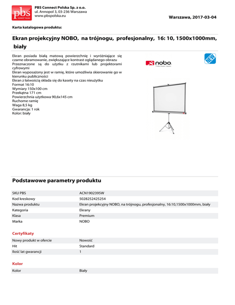 PBS Connect Polska Sp. z o.o. ul. Annopol 3, 03-236 Warszawa www.pbspolska.eu Warszawa, 2017-03-04 Karta katalogowa produktu: Ekran projekcyjny NOBO, na trójnogu, profesjonalny, 16: 10, 1500x1000mm, biały Ekran posiada białą matową powierzchnię i wyróżniające się czarne obramowanie, zwiększające kontrast oglądanego obrazu Przeznaczone są do użytku z rzutnikami lub projektorami cyfrowymi Ekran wyposażony jest w ramię, które umożliwia skierowanie go w kierunku publiczności Ekran z łatwością składa się do kasety na czas nieużytku Format 16:10 Wymiary 150x100 cm Przekątna 171 cm Powierzchnia użytkowa 90,6x145 cm Ruchome ramię Waga 8,5 kg Gwarancja: 1 rok Kolor: biały Podstawowe parametry produktu SKU PBS ACN1902395W Kod kreskowy 5028252425254 Nazwa produktu Ekran projekcyjny NOBO, na trójnogu, profesjonalny, 16:10,1500x1000mm, biały Kategoria Ekrany Klasa Premium Marka NOBO Certyfikaty Nowy produkt w ofercie Nowość Hit Standard Ilość lat gwarancji 1 Kolor Kolor Biały PBS Connect Polska Sp. z o.o. ul. Annopol 3, 03-236 Warszawa www.pbspolska.eu Warszawa, 2017-03-04 Karta katalogowa produktu cd. Ekran projekcyjny NOBO, na trójnogu, profesjonalny, 16: 10, 1500x1000mm, biały Podstawowe parametry produktu Cecha Produkt Ekran projekcyjny Typ Profesjonalny Rodzaj Na trójnogu W ofercie od 2017-01 Wymiary Wymiary (mm) 1500x1000 Format 16:10 Wspólny słownik zamówień CPV 30237210-4 Ekrany antyodblaskowe