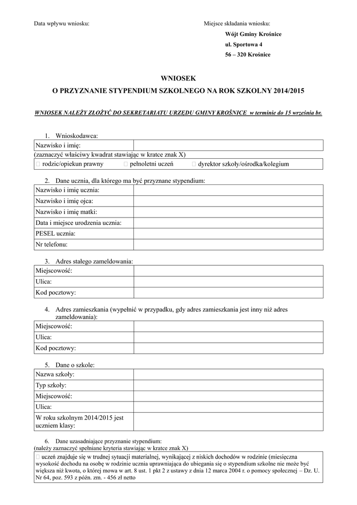 Data wpływu wniosku: Miejsce składania wniosku: Wójt Gminy Krośnice ul. Sportowa 4 56 – 320 Krośnice WNIOSEK O PRZYZNANIE STYPENDIUM SZKOLNEGO NA ROK SZKOLNY 2014/2015 WNIOSEK NALEŻY ZŁOŻYĆ DO SEKRETARIATU URZĘDU GMINY KROŚNICE w terminie do 15 września br. 1. Wnioskodawca: Nazwisko i imię: (zaznaczyć właściwy kwadrat stawiając w kratce znak X) rodzic/opiekun prawny pełnoletni uczeń 2. Dane ucznia, dla którego ma być przyznane stypendium: Nazwisko i imię ucznia: Nazwisko i imię ojca: Nazwisko i imię matki: Data i miejsce urodzenia ucznia: PESEL ucznia: Nr telefonu: 3. Adres stałego zameldowania: Miejscowość: Ulica: Kod pocztowy: 4. Adres zamieszkania (wypełnić w przypadku, gdy adres zamieszkania jest inny niż adres zameldowania): Miejscowość: Ulica: Kod pocztowy: 5. Dane o szkole: Nazwa szkoły: Typ szkoły: Miejscowość: Ulica: W roku szkolnym 2014/2015 jest uczniem klasy: 6. Dane uzasadniające przyznanie stypendium: (należy zaznaczyć spełniane kryteria stawiając w kratce znak X) wysokość dochodu na osobę w rodzinie ucznia uprawniająca do ubiegania się o stypendium szkolne nie może być większa niż kwota, o której mowa w art. 8 ust. 1 pkt 2 z ustawy z dnia 12 marca 2004 r. o pomocy społecznej – Dz. U. Nr 64, poz. 593 z późn. zm. - 456 zł netto (oświadczenie o sytuacji rodzinnej i materialnej ucznia stanowi załącznik nr 1 do wniosku) wypełniania funkcji opiekuńczo - wychowawczych e przyznanie stypendium szkolnego (wymienić jakie) potwierdzający korzystanie ze świadczeń pieniężnych pomocy społecznej, np. decyzja o jego przyznaniu) pobieraniu stypendium o charakterze socjalnym ze środków publicznych) 7. Forma stypendium szkolnego: - świadczenie pieniężne (zakup pomocy edukacyjnych, którego koszty są refundowane po przedłożeniu rachunków i faktur) Nr rachunku bankowego, na które ma być przekazywane stypendium szkolne __-____-____-____-____-____-____ 8. Uzasadnienie (opisać sytuację rodzinną i materialną rodziny oraz uzasadnić wybór formy stypendium): ............................................................................................................................................................................... ............................................................................................................................................................................... ............................................................................................................................................................................... Oświadczam, że powyższy wniosek został wypełniony zgodnie z prawdą i że jestem świadomy/a odpowiedzialności karnej z art. 233 Kodeksu karnego za zeznawanie nieprawdy lub zatajenie prawdy. 10. Zgodnie z art. 24 ust.1 ustawy z dnia 29 sierpnia 1997 r. o ochronie danych osobowych (Dz. U. z 2002 r. Nr 101, poz. 926 z późn. zm.) wyrażam zgodę na przetwarzanie danych osobowych dla potrzeb związanych z pomocą materialną (wnioskodawcy przysługuje prawo dostępu do treści swoich danych i do ich poprawienia) Oświadczam, że nie otrzymuję innego stypendium o charakterze socjalnym ze środków publicznych (kryterium to 9. spełniają stypendia unijne i Agencji Własności Rolnej Skarbu Państwa) Oświadczam, że otrzymuję stypendium o charakterze socjalnym ze środków publicznych w wysokości …………….. zł rocznie ........................................................ (miejscowość, data) ........................................................ (podpis wnioskodawcy) załączniki: 1) Zał. Nr 1 oświadczenie o sytuacji rodzinnej i materialnej ucznia, poświadczone zaświadczeniami o wynagrodzeniu. 2) Zał. Nr 2 zaświadczenie ze szkoły. Objaśnienia załączam do wniosku odpowiednio zaświadczenia o dochodach NETTO uzyskanych w miesiącu poprzedzającym złożenie wniosku, tj. : 1. od pracodawcy o uzyskanych dochodach, 2. zaświadczenie z Powiatowego Urzędu Pracy o pozostawaniu bez pracy (z prawem lub bez prawa do zasiłku), 3. oświadczenia o podejmowaniu prac dorywczych, pracy za granicą i otrzymywaniu z tego tytułu dochodu, 4. zaświadczenie lub decyzja z Gminnego Ośrodka Pomocy Społecznej o otrzymywanych świadczeniach (zasiłek stały, zasiłek okresowy, zasiłek rodzinny, zasiłek pielęgnacyjny, dodatek mieszkaniowy, fundusz alimentacyjny itp.), 5. wyroki sądowe mówiące o wysokości zasądzonych alimentów wraz z potwierdzeniem ich otrzymywania (przekaz pocztowy, wyciąg bankowy) lub zaświadczenia komornika o nieściągalności alimentów, 6. zaświadczenia o otrzymywanych stypendiach powyżej 1820 zł w roku szkolnym, 7. odcinek renty / emerytury, 8. W przypadku prowadzenia gospodarstwa rolnego należy przedstawić zaświadczenie o wielkości gospodarstwa rolnego wydanego przez odpowiedni urząd gminy (1ha przeliczeniowy = 250 zł) * za dochód uważa się sumę miesięcznych przychodów z miesiąca poprzedzającego złożenie wniosku lub w przypadku utraty dochodu z miesiąca, w którym wniosek został złożony, bez względu na tytuł i źródło ich uzyskania, pomniejszoną o: miesięczne obciążenie podatkiem dochodowym od osób fizycznych, składki na ubezpieczenie zdrowotne określone w przepisach o powszechnym ubezpieczeniu w Narodowym Funduszu Zdrowia oraz ubezpieczenia społeczne określone w odrębnych przepisach, kwotę alimentów świadczonych na rzecz innych osób. Osoby prowadzące działalność gospodarczą są zobowiązane do przedstawienia informacji o dochodach uzyskanych w 2014 r., np. w formie zaświadczenia z Urzędu Skarbowego, a w przypadku działalności gospodarczej opodatkowanej na podstawie przepisów o zryczałtowanych formach opodatkowania należy przyjąć kwotę zadeklarowaną przez wnioskodawcę na oświadczeniu. * W stosunku do osób prowadzących pozarolniczą działalność gospodarczą: 1. a) opodatkowaną podatkiem dochodowym od osób fizycznych na zasadach określony