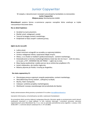 Junior Copywriter W związku z dynamicznym rozwojem poszukujemy kandydata na stanowisko: Junior Copywriter Miejsce pracy: Konstantynów Łódzki Bloomboard wspiera biznes e-commerce poprzez narzędzie która analizuje w trybie rzeczywistym kluczowe dane. Na co dzień będziesz:     Zarabiał na życie pisaniem; Myślał, pisał, redagował, szukał; Tworzył strategię content marketingu; Dziękował za fajny zespół i cudowną pracę. Zgłoś się do nas jeśli:      Lubisz pisać; Jesteś mistrzem ortografii na szczeblu co najmniej Łódzkim; Umiesz redagować teksty i poprawiać błędy innych; Wiesz, o co chodzi w mediach społecznościowych, content marketingu; Doświadczenie w branży marketing/reklama może być ale nie musi !. Jeśli nie wiesz, co to jest „CTA”, DOWIEDZ SIĘ JUŻ TERAZ – i zgłoś się na staż;  Masz bujną wyobraźnię i szybko porusz się w onlinie bez prędkości LTE;  Jesteś niebanalny, ale myślisz logicznie;  Mówisz płynnie po Polsku i trochę po Angielsku. Na stażu zapewnimy Ci:      Ekscytującą pracę w zgranym zespole pasjonatów, content marketingu; Nieszablonową formę szkoleń , szlifujemy na błysk; Biurko, fotel i komputer; Ciekawe i ambitne projekty marketingowe; Możliwość rozwoju zawodowego (od przedszkola do Opola). Osoby zainteresowane ofertą prosimy o przesłanie CV na adres: [email protected] Uprzejmie informujemy, że kontaktujemy się tylko z wybranymi Kandydatami Do przesyłanej oferty prosimy dołączyć następującą klauzulę: Wyrażam zgodę na przetwarzanie moich danych osobowych zawartych w mojej aplikacji w celu realizacji obecnego i przyszłych procesów rekrutacji organizowanych przez Bloomboard Sp. Z o.o. oraz na potrzeby pośrednictwa pracy (zgodnie z ustawą z dnia 29.08.1997 r. o ochronie danych osobowych Dz. U. 97.133.883).