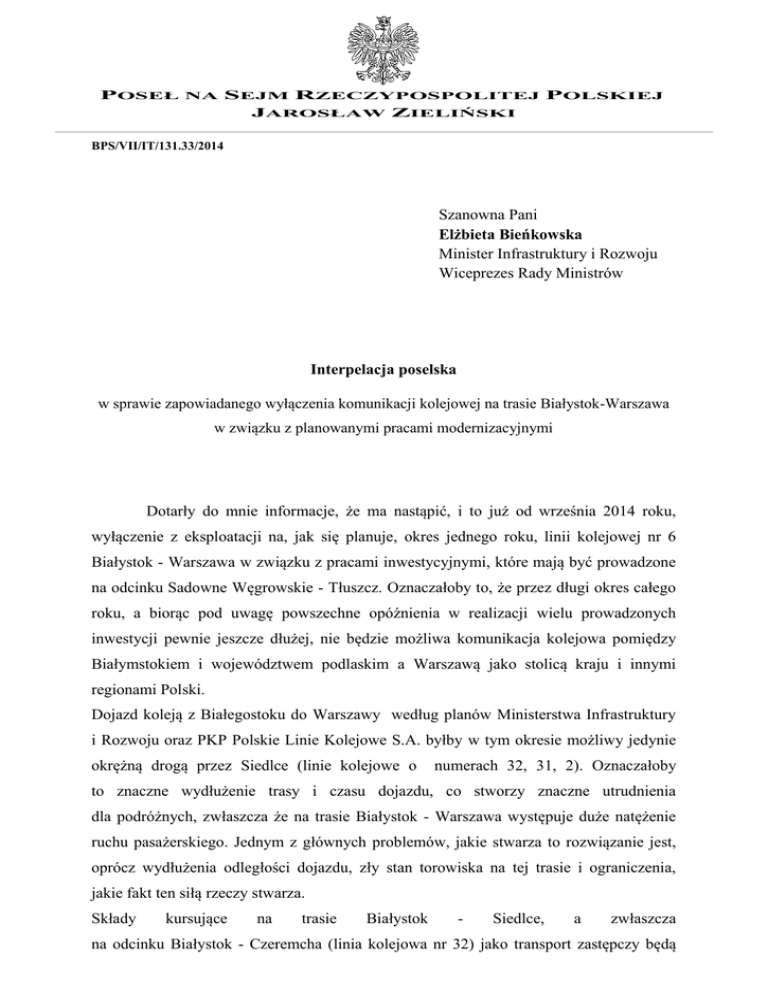 POSEŁ NA SEJM RZECZYPOSPOLITEJ POLSKIEJ JAROSŁAW ZIELIŃSKI BPS/VII/IT/131.33/2014 Szanowna Pani Elżbieta Bieńkowska Minister Infrastruktury i Rozwoju Wiceprezes Rady Ministrów Interpelacja poselska w sprawie zapowiadanego wyłączenia komunikacji kolejowej na trasie Białystok-Warszawa w związku z planowanymi pracami modernizacyjnymi Dotarły do mnie informacje, że ma nastąpić, i to już od września 2014 roku, wyłączenie z eksploatacji na, jak się planuje, okres jednego roku, linii kolejowej nr 6 Białystok - Warszawa w związku z pracami inwestycyjnymi, które mają być prowadzone na odcinku Sadowne Węgrowskie - Tłuszcz. Oznaczałoby to, że przez długi okres całego roku, a biorąc pod uwagę powszechne opóźnienia w realizacji wielu prowadzonych inwestycji pewnie jeszcze dłużej, nie będzie możliwa komunikacja kolejowa pomiędzy Białymstokiem i województwem podlaskim a Warszawą jako stolicą kraju i innymi regionami Polski. Dojazd koleją z Białegostoku do Warszawy według planów Ministerstwa Infrastruktury i Rozwoju oraz PKP Polskie Linie Kolejowe S.A. byłby w tym okresie możliwy jedynie okrężną drogą przez Siedlce (linie kolejowe o numerach 32, 31, 2). Oznaczałoby to znaczne wydłużenie trasy i czasu dojazdu, co stworzy znaczne utrudnienia dla podróżnych, zwłaszcza że na trasie Białystok - Warszawa występuje duże natężenie ruchu pasażerskiego. Jednym z głównych problemów, jakie stwarza to rozwiązanie jest, oprócz wydłużenia odległości dojazdu, zły stan torowiska na tej trasie i ograniczenia, jakie fakt ten siłą rzeczy stwarza. Składy kursujące na trasie Białystok - Siedlce, a zwłaszcza na odcinku Białystok - Czeremcha (linia kolejowa nr 32) jako transport zastępczy będą zmuszone znacznie ograniczyć swą prędkość przelotową oraz liczbę przewożonych pasażerów, co będzie podyktowane względami bezpieczeństwa. Kolejnym problemem związanym z zamiarem wyłączenia z eksploatacji na czas modernizacji linii kolejowej nr 6 Białystok - Warszawa jest fakt, że zmiany te są utrzymywane w tajemnicy przed opinią publiczną, co w momencie ich wejścia w życie wywoła tym większy chaos komunikacyjny i zniechęci podróżnych do korzystania z kolei jako środka transportu. Spotkanie poświęcone tej sprawie zorganizowane w siedzibie Podlaskiego Urzędu Wojewódzkiego w dniu 17 lipca 2014 roku z udziałem Podsekretarza Stanu odpowiedzialnego w Ministerstwie Infrastruktury i Rozwoju za sprawy kolei Pana Zbigniewa Klepackiego odbyło się w wąskim gronie, bez udziału przewoźników obsługujących tę linię kolejową. Z informacji, jaką przedstawił Pan Zbigniew Klepacki miało wynikać, że nie jest to pomysł, który może podlegać dyskusji, lecz już podjęta przez Ministerstwo decyzja. Taka postawa jest szczególnie bulwersująca, gdyż nie pozostawia się miejsca na żadne konsultacje, informując jedynie o powziętym zamiarze. Modernizacja linii kolejowej nr 6 jest niezbędna i powinna zostać przeprowadzona ze względu na duże natężenie ruchu pociągów oraz znaczną liczbę podróżnych, którzy z niej korzystają. Mimo tej niezaprzeczalnej potrzeby prace modernizacyjne należy zorganizować tak, aby w trakcie ich prowadzenia ruch pociągów się odbywał jedynie z absolutnie niezbędnymi ograniczeniami. Przykładem takiego rozwiązania i dowodem na to, że jest to możliwe są trwające obecnie prace modernizacyjne na sąsiednim odcinku tej trasy. Planowane zamknięcie na długi czas linii kolejowej nr 6 Białystok - Warszawa jest działaniem nieodpowiedzialnym i całkowicie pozbawionym wyobraźni, które przyniesie trudne do oszacowania straty społeczne i gospodarcze. Wobec powyższego, działając na podstawie art.14 ust. 1 pkt 7 ustawy z dnia 9 maja 1996 roku o wykonywaniu mandatu posła i senatora (Dz. U. Nr 73, poz. 350, z późn. zm.), uprzejmie proszę Panią Minister o udzielenie odpowiedzi na następujące pytania: 1. Czy w ramach sprawowanego nadzoru nad spółkami kolejowymi podejmie Pani Minister interwencję w stosunku do PKP PLK, aby prace modernizacyjne były zorganizowane tak, by nie było konieczne wyłączenie z eksploatacji trasy Białystok - Warszawa? 2 2. Dlaczego decyzja o zamknięciu tej linii, która skutkować będzie znacznymi utrudnieniami i kosztami społecznymi jest utrzymywana w tajemnicy przed opinią publiczną i pasażerami? Czy w przypadku podtrzymania tej decyzji, choć mam nadzieję na jej zmianę, zostanie zorganizowana sprawna komunikacja zastępcza i czy budżet państwa przekaże samorządom odpowiednie środki finansowe na pokrycie kosztów powszechnego poinformowania społeczeństwa, a w szczególności podróżnych, o zaistniałej sytuacji i możliwościach skorzystania z dostępnych połączeń komunikacyjnych między Białymstokiem i całym województwem podlaskim a Warszawą i innymi regionami kraju albo czy proces informowania społeczeństwa zorganizują skutecznie i jego koszty sfinansują spółki kolejowe? 3 Warszawa, 21 lipca 2014 roku Sejm Rzeczypospolitej Polskiej Klub Parlamentarny Prawo i Sprawiedliwość ul. Wiejska 4/6/8 00-902 Warszawa Biura Poselskie Posła na Sejm Rzeczypospolitej Polskiej Jarosława Zielińskiego 16-400 Suwałki, ul. Kościuszki 32, tel. (87) 566 55 48 15-443 Białystok, ul. Zwycięstwa 26 C, tel. (85) 653 77 69 16-300 Augustów, ul. Młyńska 20/6, tel. (87) 644 57 73 16-500 Sejny, ul. J. Piłsudskiego 28, tel. (87) 565 66 04 e-mail: [email protected] www.jaroslawzielinski.pl
