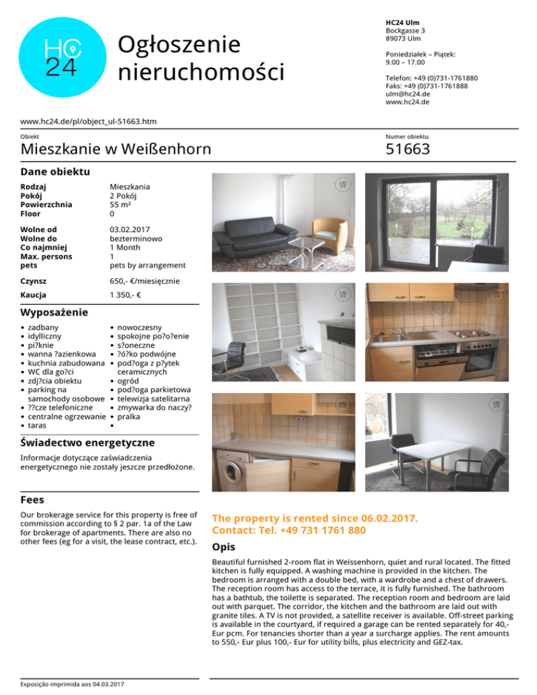 Ogłoszenie nieruchomości HC24 Ulm Bockgasse 3 89073 Ulm Poniedziałek – Piątek: 9.00 – 17.00 Telefon: +49 (0)731-1761880 Faks: +49 (0)731-1761888 [email protected] www.hc24.de www.hc24.de/pl/object_ul-51663.htm Obiekt Numer obiektu Mieszkanie w Weißenhorn 51663 Dane obiektu Rodzaj Pokój Powierzchnia Floor Mieszkania 2 Pokój 55 m² 0 Wolne od Wolne do Co najmniej Max. persons pets 03.02.2017 bezterminowo 1 Month 1 pets by arrangement Czynsz 650,- €/miesięcznie Kaucja 1 350,- € Wyposażenie zadbany idylliczny pi?knie wanna ?azienkowa kuchnia zabudowana WC dla go?ci zdj?cia obiektu parking na samochody osobowe ??cze telefoniczne centralne ogrzewanie taras nowoczesny spokojne po?o?enie s?oneczne ?ó?ko podwójne pod?oga z p?ytek ceramicznych ogród pod?oga parkietowa telewizja satelitarna zmywarka do naczy? pralka Świadectwo energetyczne Informacje dotyczące zaświadczenia energetycznego nie zostały jeszcze przedłożone. Fees Our brokerage service for this property is free of commission according to § 2 par. 1a of the Law for brokerage of apartments. There are also no other fees (eg for a visit, the lease contract, etc.). The property is rented since 06.02.2017. Contact: Tel. +49 731 1761 880 Opis Beautiful furnished 2-room flat in Weissenhorn, quiet and rural located. The fitted kitchen is fully equipped. A washing machine is provided in the kitchen. The bedroom is arranged with a double bed, with a wardrobe and a chest of drawers. The reception room has access to the terrace, it is fully furnished. The bathroom has a bathtub, the toilette is separated. The reception room and bedroom are laid out with parquet. The corridor, the kitchen and the bathroom are laid out with granite tiles. A TV is not provided, a satellite receiver is available. Off-street parking is available in the courtyard, if required a garage can be rented separately for 40,Eur pcm. For tenancies shorter than a year a surcharge applies. The rent amounts to 550,- Eur plus 100,- Eur for utility bills, plus electricity and GEZ-tax. Exposição imprimida aos 04.03.2017 Powered by TCPDF (www.tcpdf.org)