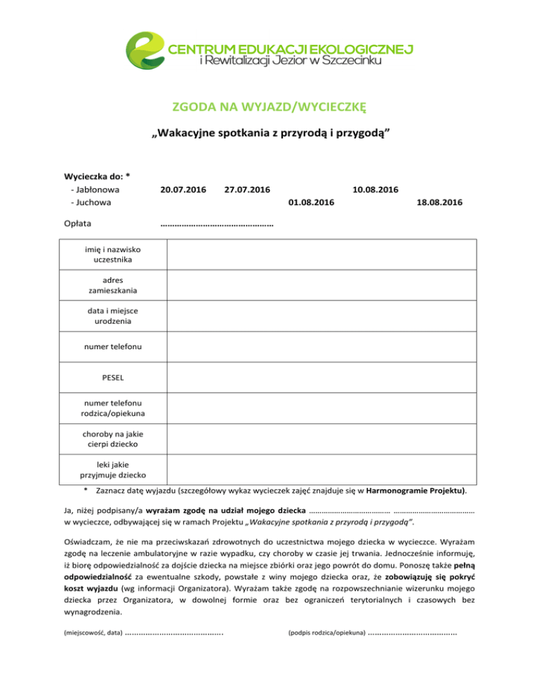 ZGODA NA WYJAZD/WYCIECZKĘ „Wakacyjne spotkania z przyrodą i przygodą” Wycieczka do: * - Jabłonowa - Juchowa 20.07.2016 Opłata ………………………………………… 27.07.2016 10.08.2016 01.08.2016 18.08.2016 imię i nazwisko uczestnika adres zamieszkania data i miejsce urodzenia numer telefonu PESEL numer telefonu rodzica/opiekuna choroby na jakie cierpi dziecko leki jakie przyjmuje dziecko * Zaznacz datę wyjazdu (szczegółowy wykaz wycieczek zajęć znajduje się w Harmonogramie Projektu). Ja, niżej podpisany/a wyrażam zgodę na udział mojego dziecka ………………………………… ………………………………… w wycieczce, odbywającej się w ramach Projektu „Wakacyjne spotkania z przyrodą i przygodą”. Oświadczam, że nie ma przeciwskazań zdrowotnych do uczestnictwa mojego dziecka w wycieczce. Wyrażam zgodę na leczenie ambulatoryjne w razie wypadku, czy choroby w czasie jej trwania. Jednocześnie informuję, iż biorę odpowiedzialność za dojście dziecka na miejsce zbiórki oraz jego powrót do domu. Ponoszę także pełną odpowiedzialność za ewentualne szkody, powstałe z winy mojego dziecka oraz, że zobowiązuję się pokryć koszt wyjazdu (wg informacji Organizatora). Wyrażam także zgodę na rozpowszechnianie wizerunku mojego dziecka przez Organizatora, w dowolnej formie oraz bez ograniczeń terytorialnych i czasowych bez wynagrodzenia. (miejscowość, data) ……………………………………. (podpis rodzica/opiekuna) …………………………………