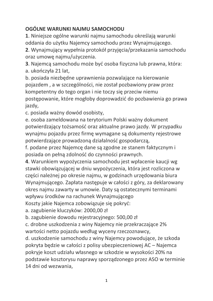 OGÓLNE WARUNKI NAJMU SAMOCHODU 1. Niniejsze ogólne warunki najmu samochodu określają warunki oddania do użytku Najemcy samochodu przez Wynajmującego. 2. Wynajmujący wypełnia protokół przyjęcia/przekazania samochodu oraz umowę najmu/użyczenia. 3. Najemcą samochodu może byd osoba fizyczna lub prawna, która: a. ukooczyła 21 lat, b. posiada niezbędne uprawnienia pozwalające na kierowanie pojazdem , a w szczególności, nie został pozbawiony praw przez kompetentny do tego organ i nie toczy się przeciw niemu postępowanie, które mogłoby doprowadzid do pozbawienia go prawa jazdy, c. posiada ważny dowód osobisty, e. osoba zameldowana na terytorium Polski ważny dokument potwierdzający tożsamośd oraz aktualne prawo jazdy. W przypadku wynajmu pojazdu przez firmę wymagane są dokumenty rejestrowe potwierdzające prowadzoną działalnośd gospodarczą, f. podane przez Najemcę dane są zgodne ze stanem faktycznym i posiada on pełną zdolnośd do czynności prawnych. 4. Warunkiem wypożyczenia samochodu jest wpłacenie kaucji wg stawki obowiązującej w dniu wypożyczenia, która jest rozliczona w części należnej po okresie najmu, w godzinach urzędowania biura Wynajmującego. Zapłata następuje w całości z góry, za deklarowany okres najmu zawarty w umowie. Daty są ostatecznymi terminami wpływu środków na rachunek Wynajmującego Koszty jakie Najemca zobowiązuje się pokryd: a. zagubienie kluczyków: 2000,00 zł b. zagubienie dowodu rejestracyjnego: 500,00 zł c. drobne uszkodzenia z winy Najemcy nie przekraczające 2% wartości netto pojazdu według wyceny rzeczoznawcy, d. uszkodzenie samochodu z winy Najemcy powodujące, że szkoda pokryta będzie w całości z polisy ubezpieczeniowej AC – Najemca pokryje koszt udziału własnego w szkodzie w wysokości 20% na podstawie kosztorysu naprawy sporządzonego przez ASO w terminie 14 dni od wezwania, 1 e. jeśli samochód zostanie z niepełnym zbiornikiem paliwa to Wynajmujący obciąży Najemcę kosztami za brakujące paliwo zwiększonymi o połowę kwoty za brakujące paliwo jako opłata manipulacyjna. f. Najemcy zostanie doliczona opłata manipulacyjna za każde wezwanie, monit, upomnienie, wykroczenie drogowe, mandat, nie opłacenie postoju w płatnej strefie parkowania itp. dotyczące okresu w jakim Najemca wynajmował pojazd, g. za utratę gwarancji przez pojazd w wyniku okoliczności leżących po stronie Najemcy 2500,00 zł, h. kary umowne mogą byd fakturowane jako opłat manipulacyjnych z doliczonym podatkiem VAT. i. ustanawia się bezwzględny zakaz palenia tytoniu w wynajmowanym pojeździe pod rygorem kary umownej w wysokości 200,00 zł. 5. Najemca lub Użytkownik poniesie wszelkie koszty powstałe w wyniku użytkowania pojazdu nie objęte odpowiedzialnością z tytułu polis ubezpieczeniowych. 6. Najkrótszy okres najmu pojazdu to 24 godziny. 7. Paliwo nie jest wliczone w cenę najmu. 8. Wynajmowany pojazd nie może byd prowadzony przez osobę nie wymienioną w umowie, zabrania się holowania innych pojazdów, przeciążenia, udziału we wszelkiego rodzaju rajdach lub wyścigach samochodowych itp. 9. Wynajęty pojazd nie może opuszczad granic kraju. 10. Najemca nie może przewozid dóbr i towarów niezgodnych z przepisami Urzędu Celnego. 11. Najemca odpowiada materialnie wobec Wynajmującego za braki paliwa, części i wyposażenie pojazdu oraz wynikłe z jego winy straty oraz z faktu niewłaściwego zabezpieczenia. 12. W przypadku uszkodzenia pojazdu przez Najemcę spowodowanego jazdą pod wpływem alkoholu lub innych środków odurzających (halucynogennych)jak również jakiegokolwiek innego zdarzenia powodującego odmowę pokrycia kosztów naprawy lub usunięcia szkody przez ubezpieczyciela w ramach polisy ubezpieczeniowej Najemca zobowiązuje się uiścid w terminie 14 dni 2 od dnia doręczenia wezwania. 13. W dniu zwrotu pojazdu Najemca bądź Użytkownik zobowiązany jest uiścid ewentualne inne należności, wynikające z postanowieo umowy. 14. W przypadku zwrotu pojazdu przed terminem wygaśnięcia umowy najmu, wypożyczalnia nie zwraca różnicy wynikającej z faktycznego okresu użytkowania. 15. Najemca wypożycza pojazd sprawny, czysty i zobowiązany jest do jego zwrotu w takim samym stanie. Jeżeli pojazd w momencie zwrotu jest brudny naliczona i pobrana zostaje uznaniowa stawka za mycie samochodu w wysokości 50zł. 16. W przypadku przekroczenia prędkości zarejestrowanej fotoradarem lub innym urządzeniem do pomiaru prędkości Wynajmujący przekaże dane adresowe Najemcy odpowiednim organom na co Najemca wyraża zgodę. Ponadto Wynajmujący nie odpowiada za naruszenie przez kierującego pojazdem przepisów o ruchu drogowym, płatnym postoju itp. jak również o nałożeniu w tym zakresie kary pieniężnej. 17. Najemca jest zobowiązany oddad pojazd w dniu i godzinie określonej w umowie, po uprzednim telefonicznym potwierdzeniu i uzgodnieniu miejsca zwrotu pojazdu minimum na godzinę przed upływem terminu w stanie czystym, zatankowanym i nie pogorszonym wraz z dokumentami i wyposażeniem z nim wydanym. 18. Samodzielne przedłużenie o ponad 24 godziny powoduje powiadomienie Policji o fakcie przywłaszczenia samochodu a wszelkie konsekwencje i koszty z tym związane ponosi Najemca. 19. Przedłużenie wypożyczenia samochodu bez wcześniejszego uzgodnienia z Wynajmującym od godziny ponad termin wyznaczony w umowie skutkował będzie naliczeniem kary umownej w wysokości podwójnej stawki odpłatności za dobę wykraczającą poza okres wynajmu określony w umowie. 3 20. W przypadku gdy zwrócony pojazd będzie uszkodzony lub nadmiernie zużyty ponadnormatywne zużycie wynikające z prawidłowej eksploatacji, Najemca zapłaci Wynajmującemu odszkodowanie będące równowartością poniesionej przez Wynajmującego udokumentowanej szkody. 21. Wynajmujący nie ponosi odpowiedzialności za szkody poniesione przez Najemcę w wyniku awarii samochodu. 22. W czasie użytkowania pojazdu Naj