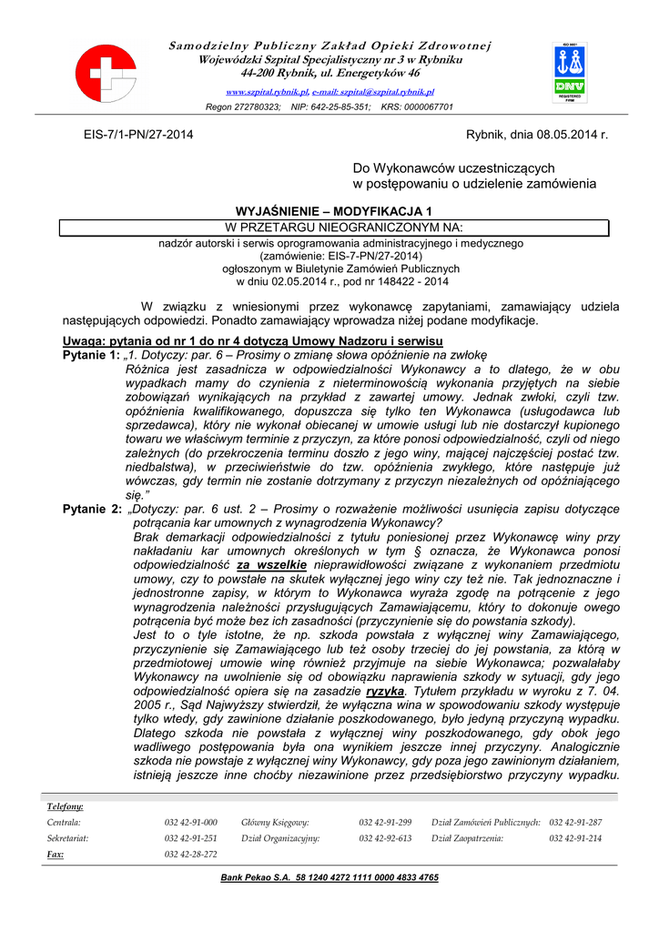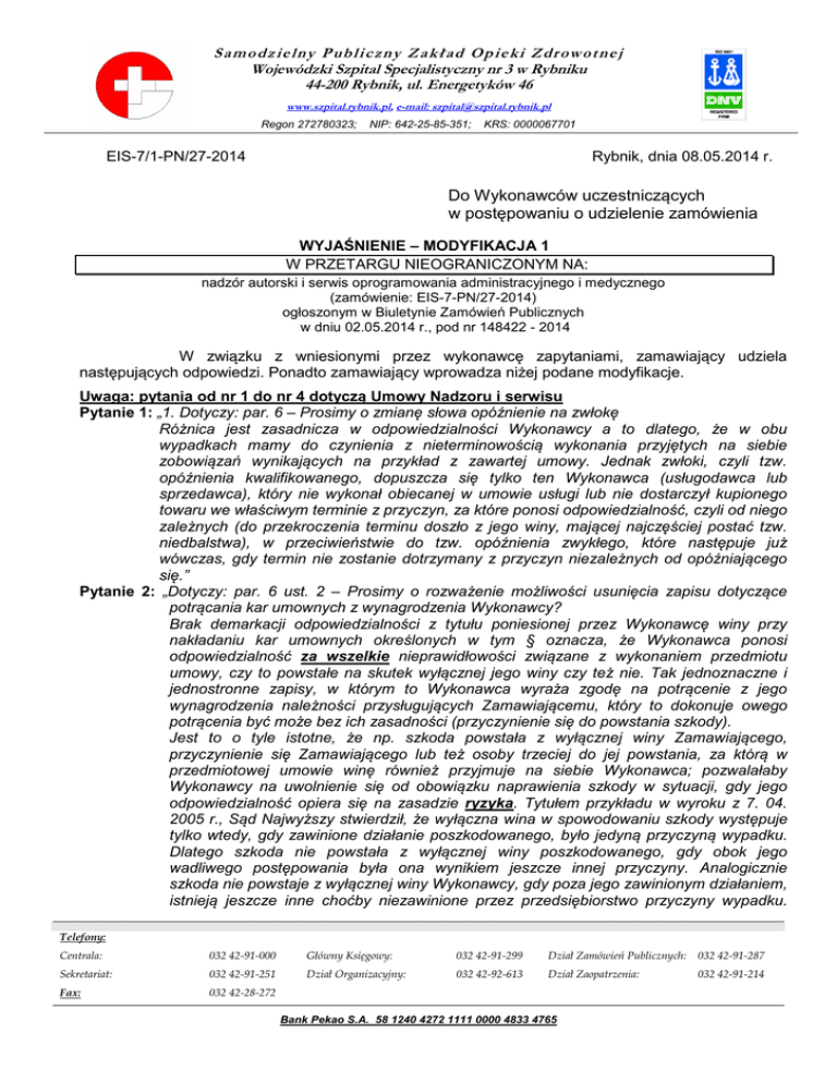 S a m od z i e l n y P ub l i c zn y Za k ł ad Op i e k i Zdr o w o tn e j Wojewódzki Szpital Specjalistyczny nr 3 w Rybniku 44-200 Rybnik, ul. Energetyków 46 www.szpital.rybnik.pl, e-mail: [email protected] Regon 272780323; NIP: 642-25-85-351; KRS: 0000067701 EIS-7/1-PN/27-2014 Rybnik, dnia 08.05.2014 r. Do Wykonawców uczestniczących w postępowaniu o udzielenie zamówienia WYJAŚNIENIE – MODYFIKACJA 1 W PRZETARGU NIEOGRANICZONYM NA: nadzór autorski i serwis oprogramowania administracyjnego i medycznego (zamówienie: EIS-7-PN/27-2014) ogłoszonym w Biuletynie Zamówień Publicznych w dniu 02.05.2014 r., pod nr 148422 - 2014 W związku z wniesionymi przez wykonawcę zapytaniami, zamawiający udziela następujących odpowiedzi. Ponadto zamawiający wprowadza niżej podane modyfikacje. Uwaga: pytania od nr 1 do nr 4 dotyczą Umowy Nadzoru i serwisu Pytanie 1: „1. Dotyczy: par. 6 – Prosimy o zmianę słowa opóźnienie na zwłokę Różnica jest zasadnicza w odpowiedzialności Wykonawcy a to dlatego, że w obu wypadkach mamy do czynienia z nieterminowością wykonania przyjętych na siebie zobowiązań wynikających na przykład z zawartej umowy. Jednak zwłoki, czyli tzw. opóźnienia kwalifikowanego, dopuszcza się tylko ten Wykonawca (usługodawca lub sprzedawca), który nie wykonał obiecanej w umowie usługi lub nie dostarczył kupionego towaru we właściwym terminie z przyczyn, za które ponosi odpowiedzialność, czyli od niego zależnych (do przekroczenia terminu doszło z jego winy, mającej najczęściej postać tzw. niedbalstwa), w przeciwieństwie do tzw. opóźnienia zwykłego, które następuje już wówczas, gdy termin nie zostanie dotrzymany z przyczyn niezależnych od opóźniającego się.” Pytanie 2: „Dotyczy: par. 6 ust. 2 – Prosimy o rozważenie możliwości usunięcia zapisu dotyczące potrącania kar umownych z wynagrodzenia Wykonawcy? Brak demarkacji odpowiedzialności z tytułu poniesionej przez Wykonawcę winy przy nakładaniu kar umownych określonych w tym § oznacza, że Wykonawca ponosi odpowiedzialność za wszelkie nieprawidłowości związane z wykonaniem przedmiotu umowy, czy to powstałe na skutek wyłącznej jego winy czy też nie. Tak jednoznaczne i jednostronne zapisy, w którym to Wykonawca wyraża zgodę na potrącenie z jego wynagrodzenia należności przysługujących Zamawiającemu, który to dokonuje owego potrącenia być może bez ich zasadności (przyczynienie się do powstania szkody). Jest to o tyle istotne, że np. szkoda powstała z wyłącznej winy Zamawiającego, przyczynienie się Zamawiającego lub też osoby trzeciej do jej powstania, za którą w przedmiotowej umowie winę również przyjmuje na siebie Wykonawca; pozwalałaby Wykonawcy na uwolnienie się od obowiązku naprawienia szkody w sytuacji, gdy jego odpowiedzialność opiera się na zasadzie ryzyka. Tytułem przykładu w wyroku z 7. 04. 2005 r., Sąd Najwyższy stwierdził, że wyłączna wina w spowodowaniu szkody występuje tylko wtedy, gdy zawinione działanie poszkodowanego, było jedyną przyczyną wypadku. Dlatego szkoda nie powstała z wyłącznej winy poszkodowanego, gdy obok jego wadliwego postępowania była ona wynikiem jeszcze innej przyczyny. Analogicznie szkoda nie powstaje z wyłącznej winy Wykonawcy, gdy poza jego zawinionym działaniem, istnieją jeszcze inne choćby niezawinione przez przedsiębiorstwo przyczyny wypadku. Telefony: Centrala: 032 42-91-000 Główny Księgowy: 032 42-91-299 Dział Zamówień Publicznych: 032 42-91-287 Sekretariat: 032 42-91-251 Dział Organizacyjny: 032 42-92-613 Dział Zaopatrzenia: 032 42-91-214 Fax: 032 42-28-272 Bank Pekao S.A. 58 1240 4272 1111 0000 4833 4765 Ryzyko: owe uprawnienie bez wyjaśnienia zasadności ich potrącenia rodzi konsekwencje w postaci jednostronnego obniżenia wynagrodzenia.” Pytanie 3: „Czy Zamawiający byłby skłonny na tle zapisów dotyczących kar i braku ograniczenia odpowiedzialności Wykonawcy, uzupełnić poniższy par. 6 o ust. 4, 5 i 6 o treści, a tym samym wykreślenia par. 7 ust.4.: 4. Całkowita odpowiedzialność odszkodowawcza Wykonawcy wynikająca z niewykonania lub nienależytego wykonania przedmiotu Umowy ogranicza się do rzeczywistej straty Zamawiającego, bez utraconych korzyści, lecz nie więcej niż równowartość 20 %wynagrodzenia netto otrzymanego przez Wykonawcę na podstawie niniejszej Umowy. 5. Strony oświadczają, że wszelka odpowiedzialność Wykonawcy z tytułu rękojmi za wady fizyczne na podstawie art. 55 ustawy o prawie autorskim i prawach pokrewnych jak i na podstawie jakiegokolwiek tytułu prawnego, ulega wyłączeniu. 6. Strony oświadczają, że wszelka odpowiedzialność Wykonawcy z tytułu rękojmi za wady fizyczne ulega wyłączeniu” Pytanie 4: „Czy Zamawiający na tle ustawy o ochronie danych osobowych, celem precyzji i przetwarzania wszelkich danych osobowych, włącznie z danymi wrażliwymi zgadza się na uzupełnienie par. 9 ust. 7 o treści: [...], w tym przetwarzania danych osobowych z art. 27 ust. 2 pkt. 7 niniejszej ustawy [...].” Odpowiedź 4: Zamawiający nie wyraża zgody na zmianę wzoru umowy. Uwaga: pytania od nr 5 do nr 6 dotyczą Umowy powierzenia danych osobowych Pytanie 5: „Czy Zamawiający na tle wytycznych GIODO, a w szczególności możliwości przetwarzania danych wrażliwych objętych art. 27 ust.2 pkt. 7, mając na uwadze par. 2 ust. 3 Umowy o ochronie danych osobowych, wyraża zodę na umieszczenie w komparycji pisma zapisu o treści: >>Zamawiający oświadcza, a Wykonawca przyjmuje do wiadomości, że Zamawiający jest Administratorem Danych Osobowych w rozumieniu Ustawy z dnia 29 sierpnia 1997 r. o ochronie danych osobowych (t. jedn. z 2002 r. Dz. U. nr 101, poz. 926 z późn. zm.) w szczególności danych powierzonych do przetwarzania na podstawie art. 27 ust. 2 pkt 7 wskazanej powyżej ustawy<<.” Odpowiedź 5: Zamawiający nie wyraża zgody, jednocześnie modyfikuje załącznik do specyfikacji i