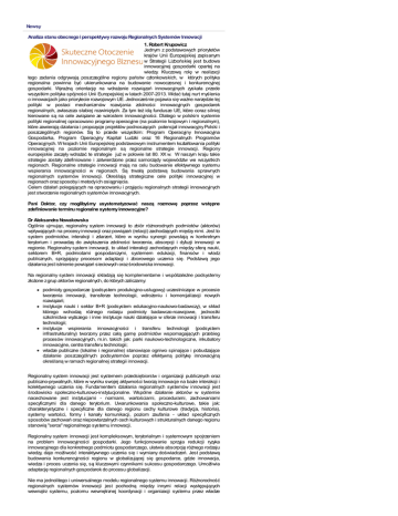 Newsy Analiza stanu obecnego i perspektywy rozwoju Regionalnych Systemów Innowacji 1. Robert Krupowicz Jednym z podstawowych priorytetów krajów Unii Europejskiej zapisanym w Strategii Lizbońskiej jest budowa innowacyjnej gospodarki opartej na wiedzy. Kluczową rolę w realizacji tego zadania odgrywają poszczególne regiony państw członkowskich, w których polityka regionalna powinna być ukierunkowana na budowanie nowoczesnej i konkurencyjnej gospodarki. Wyraźną orientację na wdrażanie rozwiązań innowacyjnych zyskała przede wszystkim polityka spójności Unii Europejskiej w latach 2007-2013. Widać tutaj nurt myślenia o innowacjach jako priorytecie rozwojowym UE. Jednocześnie pojawia się ważne narzędzie tej polityki w postaci mechanizmów rozwijania zdolności innowacyjnych gospodarek regionalnych, zwłaszcza słabiej rozwiniętych. Za tym też idą fundusze UE, które coraz silniej kierowane są na cele związane ze wzrostem innowacyjności. Dlatego w polskim systemie polityki regionalnej opracowano programy operacyjne (na poziomie krajowym i regionalnym), które zawierają działania i propozycje projektów podnoszących potencjał innowacyjny Polski i poszczególnych regionów. Są to przede wszystkim: Program Operacyjny Innowacyjna Gospodarka, Program Operacyjny Kapitał Ludzki oraz 16 Regionalnych Programów Operacyjnych. W krajach Unii Europejskiej podstawowym instrumentem kształtowania polityki innowacyjnej na poziomie regionalnym są regionalne strategie innowacji. Regiony europejskie zaczęły wdrażać te strategie już w połowie lat 80. XX w. W naszym kraju takie strategie zostały zdefiniowane i zatwierdzone przez samorządy województw we wszystkich regionach. Regionalne strategie innowacji mają na celu budowanie efektywnego systemu wspierania innowacyjności w regionach. Są trwałą podstawą budowania sprawnych regionalnych systemów innowacji. Określają strategiczne cele polityki innowacyjnej w regionach oraz sposoby i metody ich osiągnięcia. Celem działań polegających na opracowaniu i przyjęciu regionalnych strategii innowacyjnych jest stworzenie regionalnych systemów innowacyjnych. Pani Doktor, czy moglibyśmy usystematyzować naszą rozmowę poprzez wstępne zdefiniowanie terminu regionalne systemy innowacyjne? Dr Aleksandra Nowakowska Ogólnie ujmując, regionalny system innowacji to zbiór różnorodnych podmiotów (aktorów) wpływających na procesy innowacji oraz powiązań (relacji) zachodzących między nimi. Jest to system podmiotów, interakcji i zdarzeń, które w wyniku synergii powstają w konkretnym terytorium i prowadzą do zwiększenia zdolności tworzenia, absorpcji i dyfuzji innowacji w regionie. Regionalny system innowacji, to układ interakcji zachodzących między sferą nauki, sektorem B+R, podmiotami gospodarczymi, systemem edukacji, finansów i władz publicznych, sprzyjający procesom adaptacji i zbiorowego uczenia się. Podstawą jego działania jest istnienie powiązań sieciowych oraz środowiska innowacji. Na regionalny system innowacji składają się komplementarne i współzależne podsystemy złożone z grup aktorów regionalnych, do których zaliczamy: podmioty gospodarcze (podsystem produkcyjno-usługowy) uczestniczące w procesie tworzenia innowacji, transferze technologii, wdrożeniu i komercjalizacji nowych rozwiązań; instytucje nauki i sektor B+R (podsystem edukacyjno-naukowo-badawczy), w skład którego wchodzą różnego rodzaju podmioty badawczo-rozwojowe, jednostki szkolnictwa wyższego i inne instytucje nauki działające w sferze innowacji i transferu technologii; instytucje wspierania innowacyjności i transferu technologii (podsystem infrastrukturalny) tworzony przez całą gamę podmiotów wspomagających przebieg procesów innowacyjnych, m.in. takich jak: parki naukowo-technologiczne, inkubatory innowacyjne, centra transferu technologii; władze publiczne (lokalne i regionalne) stanowiące ogniwo spinające i pobudzające działanie poszczególnych podsystemów poprzez efektywną politykę innowacyjną określaną w ramach regionalnej strategii innowacji. Regionalny system innowacji jest systemem przedsiębiorstw i organizacji publicznych oraz publiczno-prywatnych, które w wyniku swojej aktywności tworzą innowacje na bazie interakcji i kolektywnego uczenia się. Fundamentem działania regionalnych systemów innowacji jest środowisko społeczno-kulturowo-instytucjonalne. Wspólne działanie aktorów w systemie nacechowane jest instytucjami - normami, wartościami, procedurami, zachowaniami specyficznymi dla danego terytorium. Uwarunkowania społeczno-kulturowe, takie jak: charakterystyczne i specyficzne dla danego regionu cechy kulturowe (tradycja, historia), systemy wartości, formy i kanały komunikacji, poziom zaufania - układ specyficznych sposobów zachowań oraz niepowtarzalnych cech kulturowych i strukturalnych danego regionu stanowią "serce" regionalnego systemu innowacji. Regionalny system innowacji jest kompleksowym, terytorialnym i systemowym spojrzeniem na problem innowacyjności gospodarki. Jego funkcjonowanie sprzyja redukcji ryzyka innowacyjnego dla konkretnego podmiotu gospodarczego, ułatwia absorpcję różnego rodzaju wiedzy, daje możliwość interaktywnego uczenia się i wymiany doświadczeń. Jest podstawą budowania konkurencyjności regionu w globalizującej się gospodarce, gdzie innowacja, wiedza i proces uczenia się, są kluczowymi czynnikami sukcesu gospodarczego. Umożliwia adaptację regionalnych gospodarek do procesu globalizacji. Nie ma jednolitego i uniwersalnego modelu regionalnego systemu innowacji. Różnorodność regionalnych systemów innowacji jest pochodną między innymi relacji występujących wewnątrz systemu, poziomu wewnętrznej koordynacji i organizacji systemu przez władze regionalne, roli i znaczenia dużych podmiotów gospodarczych i sektora MŚP. Systemy te różnią się także źródłami finansowania aktywności innowacyjnej i 