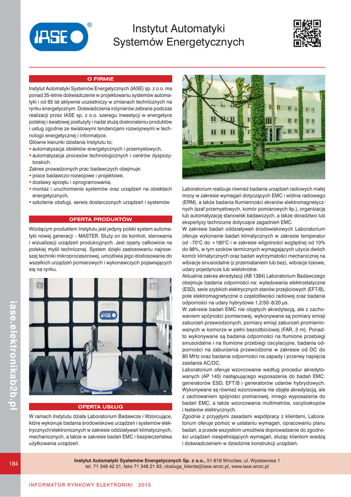 Instytut Automatyki Systemów Energetycznych OFIRMIE Instytut Automatyki Systemów Energetycznych (IASE) sp. zo.o. ma ponad 35-letnie doświadczenie wprojektowaniu systemów automatyki iod 65 lat aktywnie uczestniczy wzmianach technicznych na rynku energetycznym. Doświadczenia inżynierów zebrane podczas realizacji przez IASE sp. zo.o. szeregu inwestycji wenergetyce polskiej iświatowej posłużyły inadal służą doskonaleniu produktów iusług zgodnie ze światowymi tendencjami rozwojowymi wtechnologii energetycznej iinformatyce. Główne kierunki działania Instytutu to: automatyzacja obiektów energetycznych iprzemysłowych, automatyzacja procesów technologicznych icentrów dyspozytorskich. Zakres prowadzonych prac badawczych obejmuje: prace badawczo-rozwojowe iprojektowe, dostawy sprzętu ioprogramowania, montaż i uruchomienie systemów oraz urządzeń na obiektach energetycznych, szkolenie obsługi, serwis dostarczonych urządzeń isystemów OFERTA PRODUKTÓW Wiodącym produktem Instytutu jest jedyny polski system automatyki nowej generacji – MASTER. Służy on do kontroli, sterowania iwizualizacji urządzeń produkcyjnych. Jest oparty całkowicie na polskiej myśli technicznej. System dzięki zastosowaniu najnowszej techniki mikroprocesorowej, umożliwia jego dostosowanie do wszelkich urządzeń pomiarowych iwykonawczych pojawiających się na rynku. iase.elektronikab2b.pl OFERTA USŁUG Wramach Instytutu działa Laboratorium Badawcze iWzorcujące, które wykonuje badania środowiskowe urządzeń isystemów elektrycznych/elektronicznych wzakresie oddziaływań klimatycznych, mechanicznych, atakże wzakresie badań EMC ibezpieczeństwa użytkowania urządzeń. 184 Laboratorium realizuje również badania urządzeń radiowych małej mocy wzakresie wymagań dotyczących EMC iwidma radiowego (ERM), atakże badania tłumienności ekranów elektromagnetycznych (szaf przemysłowych, komór pomiarowych itp.), organizację lub automatyzację stanowisk badawczych, atakże doradztwo lub ekspertyzy techniczne dotyczące zagadnień EMC. W zakresie badań oddziaływań środowiskowych Laboratorium oferuje wykonanie badań klimatycznych w zakresie temperatur od –70°C do +180°C iwzakresie wilgotności względnej od 10% do 98%, wtym szoków termicznych wymagających użycia dwóch komór klimatycznych oraz badań wytrzymałości mechanicznej na wibracje sinusoidalne (zprzemiataniem lub bez), wibracje losowe, udary pojedyncze lub wielokrotne. Aktualnie zakres akredytacji (AB 1384) Laboratorium Badawczego obejmuje badania odporności na: wyładowania elektrostatyczne (ESD), serie szybkich elektrycznych stanów przejściowych (EFT/B), pole elektromagnetyczne oczęstotliwości radiowej oraz badania odporności na udary hybrydowe 1,2/50–8/20 μs. Wzakresie badań EMC nie objętych akredytacją, ale zzachowaniem spójności pomiarowej, wykonywane są pomiary emisji zaburzeń przewodzonych, pomiary emisji zaburzeń promieniowanych wkomorze wpełni bezodbiciowej (FAR, 3m). Ponadto wykonywane są badania odporności na tłumione przebiegi sinusoidalne ina tłumione przebiegi oscylacyjne, badania odporności na zaburzenia przewodzone w zakresie od DC do 80 MHz oraz badania odporności na zapady iprzerwy napięcia zasilania AC/DC. Laboratorium oferuje wzorcowanie według procedur akredytowanych (AP 145) następującego wyposażenia do badań EMC: generatorów ESD, EFT/B i generatorów udarów hybrydowych. Wykonywane są również wzorcowania nie objęte akredytacją, ale z zachowaniem spójności pomiarowej, innego wyposażenia do badań EMC, a także wzorcowania multimetrów, oscyloskopów itesterów elektrycznych. Zgodnie z przyjętymi zasadami współpracy z klientami, Laboratorium oferuje pomoc wustalaniu wymagań, opracowaniu planu badań, aprzede wszystkim umożliwia doprowadzanie do zgodności urządzeń niespełniających wymagań, służąc klientom wiedzą idoświadczeniem wdziedzinie konstrukcji urządzeń. Instytut Automatyki Systemów Energetycznych Sp. zo.o., 51-618 Wrocław, ul. Wystawowa 1 tel. 71 348 42 21, faks 71 348 21 83, [email protected], www.iase.wroc.pl I N F O R M AT O R R Y N KO W Y E L E K T R O N I K I 2015