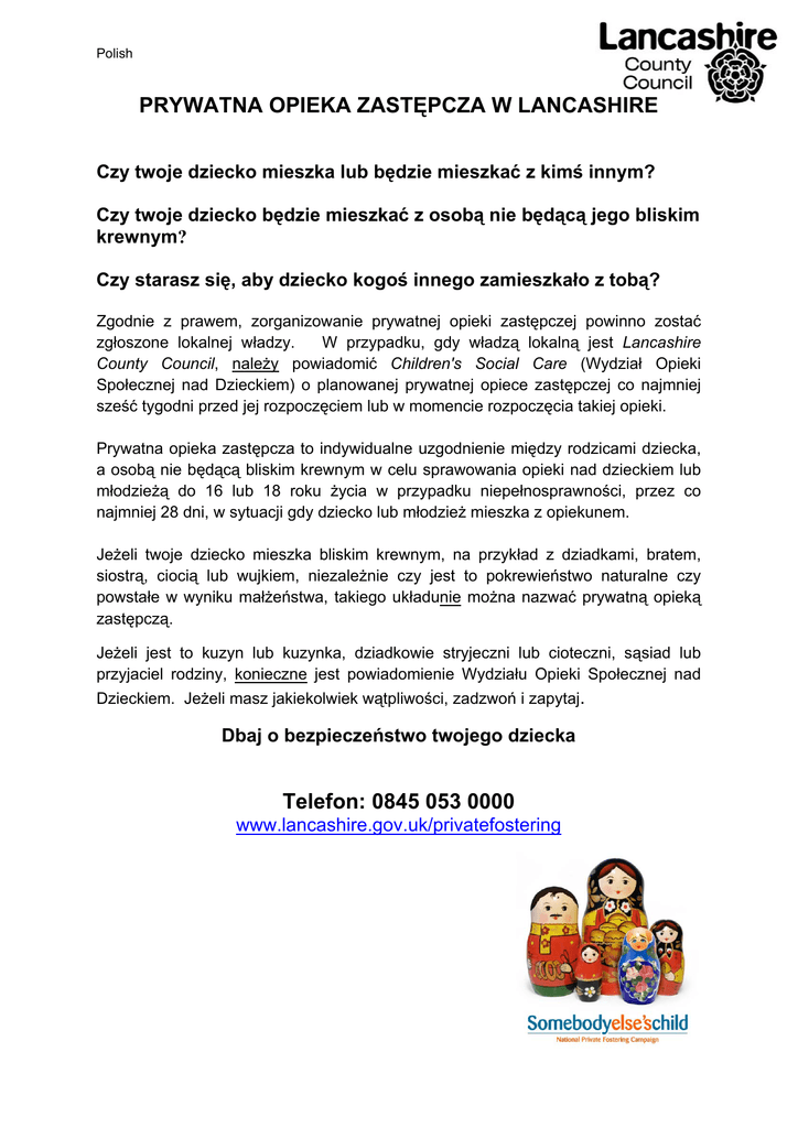 Polish PRYWATNA OPIEKA ZASTĘPCZA W LANCASHIRE Czy twoje dziecko mieszka lub będzie mieszkać z kimś innym? Czy twoje dziecko będzie mieszkać z osobą nie będącą jego bliskim krewnym? Czy starasz się, aby dziecko kogoś innego zamieszkało z tobą? Zgodnie z prawem, zorganizowanie prywatnej opieki zastępczej powinno zostać zgłoszone lokalnej władzy. W przypadku, gdy władzą lokalną jest Lancashire County Council, należy powiadomić Children's Social Care (Wydział Opieki Społecznej nad Dzieckiem) o planowanej prywatnej opiece zastępczej co najmniej sześć tygodni przed jej rozpoczęciem lub w momencie rozpoczęcia takiej opieki. Prywatna opieka zastępcza to indywidualne uzgodnienie między rodzicami dziecka, a osobą nie będącą bliskim krewnym w celu sprawowania opieki nad dzieckiem lub młodzieżą do 16 lub 18 roku życia w przypadku niepełnosprawności, przez co najmniej 28 dni, w sytuacji gdy dziecko lub młodzież mieszka z opiekunem. Jeżeli twoje dziecko mieszka bliskim krewnym, na przykład z dziadkami, bratem, siostrą, ciocią lub wujkiem, niezależnie czy jest to pokrewieństwo naturalne czy powstałe w wyniku małżeństwa, takiego układunie można nazwać prywatną opieką zastępczą. Jeżeli jest to kuzyn lub kuzynka, dziadkowie stryjeczni lub cioteczni, sąsiad lub przyjaciel rodziny, konieczne jest powiadomienie Wydziału Opieki Społecznej nad Dzieckiem. Jeżeli masz jakiekolwiek wątpliwości, zadzwoń i zapytaj. Dbaj o bezpieczeństwo twojego dziecka Telefon: 0845 053 0000 www.lancashire.gov.uk/privatefostering