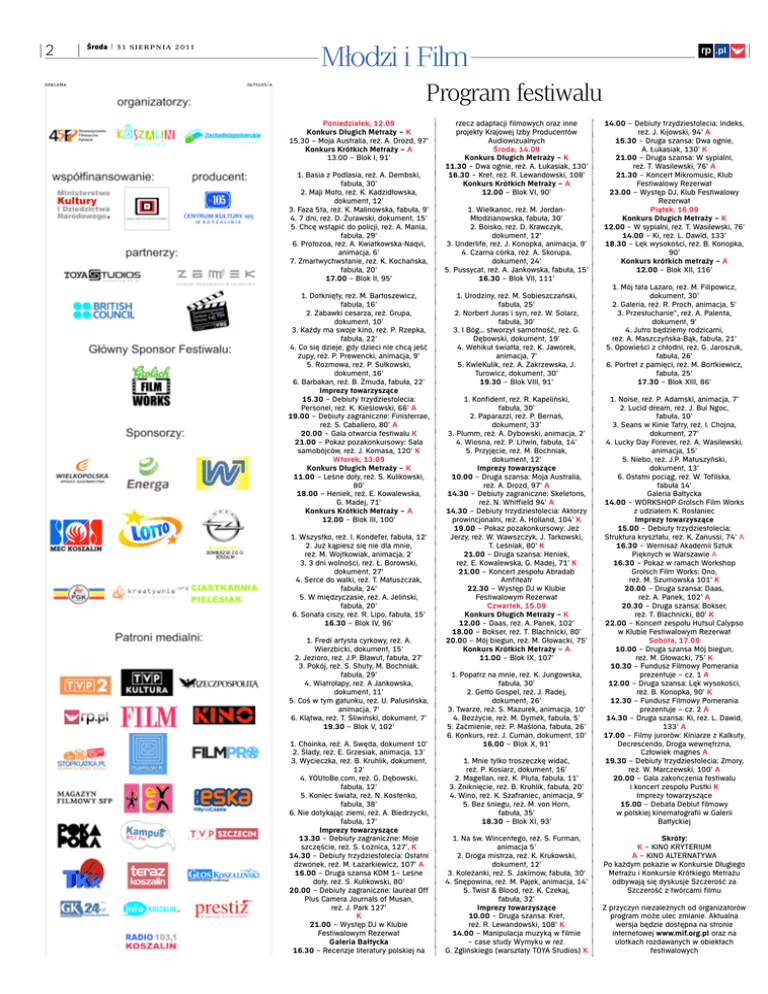 2 REKLAMA Młodzi i Film Środa | 31 sierpnia 2011 0675105/A rp .pl ◊ Program festiwalu Poniedziałek, 12.09 Konkurs Długich Metraży – K 15.30 – Moja Australia, reż. A. Drozd, 97’ Konkurs Krótkich Metraży – A 13.00 – Blok I, 91’ 1. Basia z Podlasia, reż. A. Dembski, fabuła, 30’ 2. Maji Moto, reż. K. Kadzidłowska, dokument, 12’ 3. Faza 5ta, reż. K. Malinowska, fabuła, 9’ 4. 7 dni, reż. D. Żurawski, dokument, 15’ 5. Chcę wstąpić do policji, reż. A. Mania, fabuła, 29’ 6. Protozoa, reż. A. Kwiatkowska-Naqvi, animacja, 6’ 7. Zmartwychwstanie, reż. K. Kochańska, fabuła, 20’ 17.00 – Blok II, 95’ 1. Dotknięty, reż. M. Bartoszewicz, fabuła, 16’ 2. Zabawki cesarza, reż. Grupa, dokument, 10’ 3. Każdy ma swoje kino, reż. P. Rzepka, fabuła, 22’ 4. Co się dzieje, gdy dzieci nie chcą jeść zupy, reż. P. Prewencki, animacja, 9’ 5. Rozmowa, reż. P. Sułkowski, dokument, 16’ 6. Barbakan, reż. B. Żmuda, fabuła, 22’ Imprezy towarzyszące 15.30 – Debiuty trzydziestolecia: Personel, reż. K. Kieślowski, 66’ A 19.00 – Debiuty zagraniczne: Finisterrae, reż. S. Caballero, 80’ A 20.00 – Gala otwarcia festiwalu K 21.00 – Pokaz pozakonkursowy: Sala samobójców, reż. J. Komasa, 120’ K Wtorek, 13.09 Konkurs Długich Metraży – K 11.00 – Leśne doły, reż. S. Kulikowski, 80’ 18.00 – Heniek, reż. E. Kowalewska, G. Madej, 71’ Konkurs Krótkich Metraży – A 12.00 – Blok III, 100’ 1. Wszystko, reż. I. Kondefer, fabuła, 12’ 2. Już kąpiesz się nie dla mnie, reż. M. Wojtkowiak, animacja, 2’ 3. 3 dni wolności, reż. Ł. Borowski, dokument, 27’ 4. Serce do walki, reż. T. Matuszczak, fabuła, 24’ 5. W międzyczasie, reż. A. Jeliński, fabuła, 20’ 6. Sonata ciszy, reż. R. Lipo, fabuła, 15’ 16.30 – Blok IV, 96’ 1. Fredi artysta cyrkowy, reż. A. Wierzbicki, dokument, 15’ 2. Jezioro, reż. J.P. Bławut, fabuła, 27’ 3. Pokój, reż. S. Shuty, M. Bochniak, fabuła, 29’ 4. Wiatrołapy, reż. A Jankowska, dokument, 11’ 5. Coś w tym gatunku, reż. U. Palusińska, animacja, 7’ 6. Klątwa, reż. T. Śliwiński, dokument, 7’ 19.30 – Blok V, 102’ 1. Choinka, reż. A. Swęda, dokument 10’ 2. Ślady, reż. E. Grzesiak, animacja, 13’ 3. Wycieczka, reż. B. Kruhlik, dokument, 12’ 4. YOUtoBe.com, reż. G. Dębowski, fabuła, 12’ 5. Koniec świata, reż. N. Kostenko, fabuła, 38’ 6. Nie dotykając ziemi, reż. A. Biedrzycki, fabuła, 17’ Imprezy towarzyszące 13.30 – Debiuty zagraniczne: Moje szczęście, reż. S. Łożnica, 127’, K 14.30 – Debiuty trzydziestolecia: Ostatni dzwonek, reż. M. Łazarkiewicz, 107’ A 16.00 – Druga szansa KDM 1– Leśne doły, reż. S. Kulikowski, 80’ 20.00 – Debiuty zagraniczne: laureat Off Plus Camera Journals of Musan, reż. J. Park 127’ K 21.00 – Występ DJ w Klubie Festiwalowym Rezerwat Galeria Bałtycka 16.30 – Recenzje literatury polskiej na rzecz adaptacji filmowych oraz inne projekty Krajowej Izby Producentów Audiowizualnych Środa, 14.09 Konkurs Długich Metraży – K 11.30 – Dwa ognie, reż. A. Łukasiak, 130’ 16.30 – Kret, reż. R. Lewandowski, 108’ Konkurs Krótkich Metraży – A 12.00 – Blok VI, 90’ 1. Wielkanoc, reż. M. JordanMłodzianowska, fabuła, 30’ 2. Boisko, reż. D. Krawczyk, dokument, 12’ 3. Underlife, reż. J. Konopka, animacja, 9’ 4. Czarna córka, reż. A. Skorupa, dokument, 24’ 5. Pussycat, reż. A. Jankowska, fabuła, 15’ 16.30 – Blok VII, 111’ 1. Urodziny, reż. M. Sobieszczański, fabuła, 25’ 2. Norbert Juras i syn, reż. W. Solarz, fabuła, 30’ 3. I Bóg… stworzył samotność, reż. G. Dębowski, dokument, 19’ 4. Wehikuł światła, reż. K. Jaworek, animacja, 7’ 5. KwieKulik, reż. A. Zakrzewska, J. Turowicz, dokument, 30’ 19.30 – Blok VIII, 91’ 1. Konfident, reż. R. Kapeliński, fabuła, 30’ 2. Paparazzi, reż. P. Bernaś, dokument, 33’ 3. Plumm, reż. A. Dybowski, animacja, 2’ 4. Wiosna, reż. P. Litwin, fabuła, 14’ 5. Przyjęcie, reż. M. Bochniak, dokument, 12’ Imprezy towarzyszące 10.00 – Druga szansa: Moja Australia, reż. A. Drozd, 97’ A 14.30 – Debiuty zagraniczne: Skeletons, reż. N. Whitfield 94’ A 14.30 – Debiuty trzydziestolecia: Aktorzy prowincjonalni, reż. A. Holland, 104’ K 19.00 – Pokaz pozakonkursowy: Jeż Jerzy, reż. W. Wawszczyk, J. Tarkowski, T. Leśniak, 80’ K 21.00 – Druga szansa: Heniek, reż. E. Kowalewska, G. Madej, 71’ K 21.00 – Koncert zespołu Abradab Amfiteatr 22.30 – Występ DJ w Klubie Festiwalowym Rezerwat Czwartek, 15.09 Konkurs Długich Metraży – K 12.00 – Daas, reż. A. Panek, 102’ 18.00 – Bokser, reż. T. Blachnicki, 80’ 20.00 – Mój biegun, reż. M. Głowacki, 75’ Konkurs Krótkich Metraży – A 11.00 – Blok IX, 107’ 1. Popatrz na mnie, reż. K. Jungowska, fabuła, 30’ 2. Getto Gospel, reż. J. Radej, dokument, 26’ 3. Twarze, reż. S. Mazurek, animacja, 10’ 4. Bezżycie, reż. M. Dymek, fabuła, 5’ 5. Zaćmienie, reż. P. Maślona, fabuła, 26’ 6. Konkurs, reż. J. Cuman, dokument, 10’ 16.00 – Blok X, 91’ 1. Mnie tylko troszeczkę widać, reż. P. Kosiarz, dokument, 16’ 2. Magellan, reż. K. Pluta, fabuła, 11’ 3. Zniknięcie, reż. B. Kruhlik, fabuła, 20’ 4. Wino, reż. K. Szafraniec, animacja, 9’ 5. Bez śniegu, reż. M. von Horn, fabuła, 35’ 18.30 – Blok XI, 93’ 1. Na św. Wincentego, reż. S. Furman, animacja 5’ 2. Droga mistrza, reż. K. Krukowski, dokument, 12’ 3. Koleżanki, reż. S. Jakimow, fabuła, 30’ 4. Snępowina, reż. M. Pajek, animacja, 14’ 5. Twist & Blood, reż. K. Czekaj, fabuła, 32’ Imprezy towarzyszące 10.00 – Druga szansa: Kret, reż. R. Lewandowski, 108’ K 14.00 – Manipulacja muzyką w filmie – case study Wymyku w reż. G. Zglińskiego (warsztaty TOYA Studios) K 14.00 – Debiuty trzydziestolecia: Indeks, reż. J. Kijowski, 94’ A 15.30 – Druga szansa: Dwa ognie, A. Łukasia