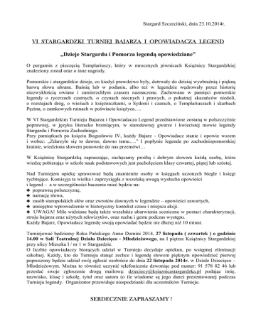 Stargard Szczeciński, dnia 23.10.2014r. VI STARGARDZKI TURNIEJ BAJARZA I OPOWIADACZA LEGEND „Dzieje Stargardu i Pomorza legendą opowiedziane” O pergamin z pieczęcią Templariuszy, który w mrocznych piwnicach Książnicy Stargardzkiej znaleziony został oraz o inne nagrody. Pomorskie i stargardzkie dzieje, co kiedyś prawdziwe były, dotrwały do dzisiaj wyobraźnią i piękną barwą słowa ubrane. Baśnią lub w podaniu, albo też w legendzie wędrowały przez historię niezwykłością owiane i zamierzchłym czasem naznaczone. Zachowane w pamięci pomorskie legendy o rycerzach czarnych, o czynach niecnych i prawych, o pokutnej skazańców niedoli, o rozstajach dróg, o wieżach z księżniczkami, o Sydonii i czarach, o Templariuszach i skarbach Pęzina, o zamkowych ruinach w poświacie księżyca…. W VI Stargardzkim Turnieju Bajarza i Opowiadacza Legend przedstawione zostaną w polszczyźnie poprawnej, w języku literacko brzmiącym, w starodawnej gwarze i kwiecistej mowie legendy Stargardu i Pomorza Zachodniego. Przy pamiątkach po księciu Bogusławie IV, każdy Bajarz - Opowiadacz stanie i opowie wszem i wobec: „Zdarzyło się to dawno, dawno temu….” I popłynie legenda po zachodniopomorskiej krainie, wiedziona słowem ponownie do nas przemówi… W Książnicę Stargardzką zapraszając, zachęcamy prośbą i dobrym słowem każdą osobę, która wiedzę pobierając w szkole nauk podstawowych jest pacholęciem klasy czwartej, piątej lub szóstej. Nad Turniejem opiekę sprawować będą znamienite osoby w księgach uczonych biegle i księgi rychtujące. Komisyja ta wielka i zaprzysięgła z wszelaką uwagą wysłucha opowieści i legend – a w szczególności baczenie mieć będzie na: ♣ poprawną polszczyznę, ♣ narrację słowa, ♣ zasób staropolskich słów oraz zwrotów dawnych w legendzie – opowieści zawartych, ♣ umiejętne wprowadzenie w historyczny kontekst czasu i miejsca akcji. ♣ UWAGA! Mile widziane będą także wszelakie ubarwienia sceniczne w postaci charakteryzacji, stroju bajarza oraz użytych rekwizytów, oraz ruchu i gestu podczas występu. Każdy Bajarz, Opowiadacz legendę swoją opowiadać będzie nie dłużej niż 10 minut. Turniejować będziemy Roku Pańskiego Anno Domini 2014, 27 listopada ( czwartek ) o godzinie 14.00 w Sali Teatralnej Działu Dziecięco - Młodzieżowego, na I piętrze Książnicy Stargardzkiej przy ulicy Mieszka I / nr 1 w Stargardzie. O liczbie opowiadaczy biorących udział w Turnieju decyduje opiekun, po wstępnej eliminacji szkolnej. Każdy, kto do Turnieju stanąć zechce i legendę słowem pięknym opowiedzieć pierwej poproszony będzie udział swój zgłosić osobiście do dnia 22 listopada 2014r. w Dziale Dziecięco – Młodzieżowym. Można to również uczynić telefonicznie dzwoniąc pod numer: 91 578 82 46 lub przesłać swoje zgłoszenie drogą mailową: [email protected] podając imię, nazwisko, klasę i szkołę, tytuł oraz autora (o ile wiadome są jego dane) prezentowanej podczas Turnieju legendy. Organizator przewiduje niespodzianki dla uczestników Turnieju. SERDECZNIE ZAPRASZAMY !