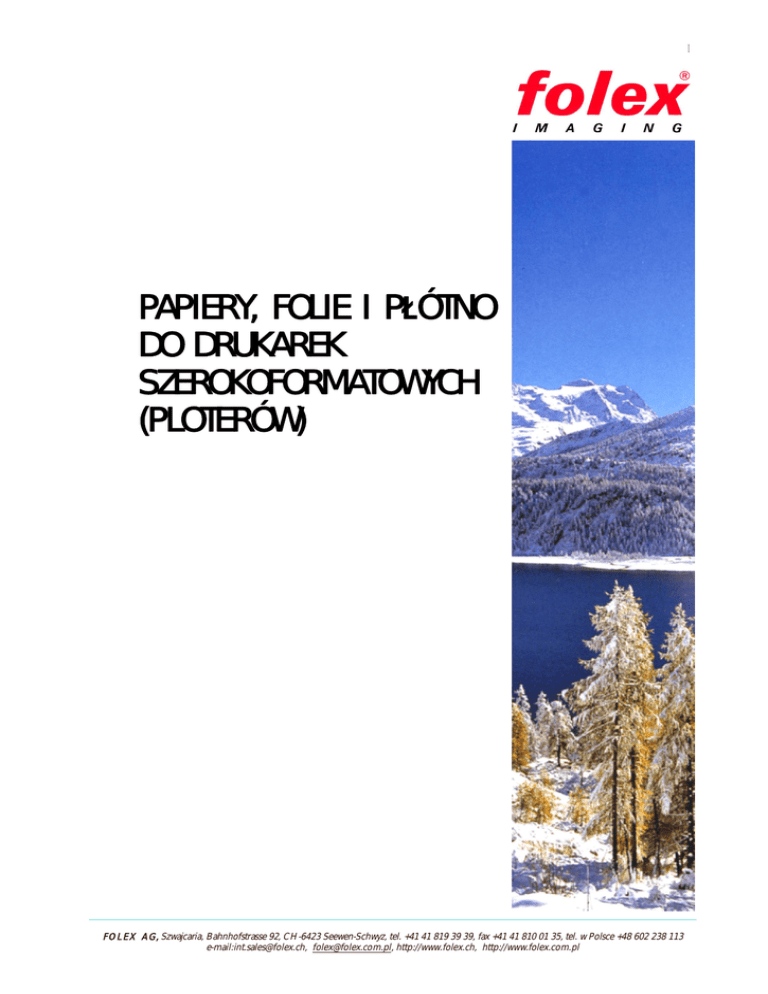 1 PAPIERY, FOLIE I P ÓTNO DO DRUKAREK SZEROKOFORMATOWYCH (PLOTERÓW) FOLEX AG, Szwajcaria, Bahnhofstrasse 92, CH-6423 Seewen-Schwyz, tel. +41 41 819 39 39, fax +41 41 810 01 35, tel. w Polsce +48 602 238 113 e-mail:[email protected], [email protected], http://www.folex.ch, http://www.folex.com.pl 2 PAPIERY, FOLIE I P ÓTNO DOSTARCZANE PRZEZ F-M FOLEX AG DO SZEROKOFORMATOWYCH DRUKAREK ATRAMENTOWYCH (PLOTERÓW) Firma FOLEX® AG (Seewen/Szwajcaria) oferuje Pa stwu szeroki asortyment pod y do druku w ploterach ink-jet. Pod a te znajduj zastosowanie w agencjach reklamowych, biurach konstrukcyjnych, drukarniach i innych instytucjach. UWAGA: ciwy dobór folii do urz dze mo liwy jest w oparciu o specjalny wykaz (tzw. list rekomendacyjn ) zamieszczony w Internecie pod adresem: http://www.folex.ch/ W dalszej cz ci tekstu omówione s nast puj ce media: papiery; folie: powlekane do ró nych zastosowa do kasetonów pod wietlanych i reklam pod ogowych; przylepne; folia na no niku papierowym do transferu wydruków na tkaniny; ótna (canvas) – do wodnych atramentów barwnikowych i pigmentowych; pod a do drukowania barwnikami solwentowymi (w tym tak e ótno); folie do drukowania atramentami utrwalanymi promieniami UV UWAGA 1: okre lenie <ploter> jest jednoznaczne z okre leniem <drukarka szerokoformatowa> UWAGA 2: symbole przy nazwach produktów oznaczaj nast puj ce cechy wyrobu: TERM PIEZO PIGM DYE ESOLV SOLV UV LATEX SN SS SENS DT do ploterów z g owicami termicznymi do ploterów z g owicami piezoelektrycznymi do wodnych atramentów pimentowych do wodnych atramentów barwnikowych do barwników eko-solwentowych do barwników solwentowych do atramentów utrwalanych promieniowaniem UV do barwników na bazie lateksu wydruki wysychaj natychmiast wydruki wysychaj szybko bia e paski sensorowe na d szych kraw dziach rolek folia na papierze do termicznego i dociskowego przeniesienia wydruku na tkanin wydruki wykon. wodnymi atramentami pigmentowymi lub solwentowymi maj podwy szon wodoodporno OW FOLEX AG, Szwajcaria, Bahnhofstrasse 92, CH-6423 Seewen-Schwyz, tel. +41 41 819 39 39, fax +41 41 810 01 35, tel. w Polsce +48 602 238 113 e-mail:[email protected], [email protected], http://www.folex.ch, http://www.folex.com.pl 3 PAPIERY DO PLOTERÓW ATRAMENTOWYCH Aby otrzyma na prawd dobrej jako ci wydruki wykonane technik ink-jet konieczne jest u ycie papierów specjalnie przygotowanych do tej w nie metody. Firma FOLEX AG produkuje papiery powlekane warstw uszlachetniaj , gwarantuj otrzymanie wydruków najwy szej jako ci. Zastosowanie: plakaty (postery), wydruki próbne (DDCP - direkt digital colour proofing), wydruki prezentacyjne i in. FOLAPROOF PTDP-HG / -SM TERM / PIEZO / PIGM / DYE / SN / LATEX Gramatura: 210 g/m2. Uniwersalne, najwy szej jako ci papiery pokryte nanoporowat warstw gwarantuj b yskawiczne wysychanie nadrukowanego atramentu (oszcz dno czasu pracy), uzyskanie nasyconych barw oraz zachowanie p asko ci, tak e przy zwi kszonej ilo ci nadrukowanego atramentu. S przystosowane do druku w ploterach z systemem piezo lub thermo, wodnymi atramentami barwnikowymi lub pigmentowymi. Mog by bezproblemowo laminowane foli . Stosuje si je do wykonania plakatów, prezentacji, display’ów wystawowych i innych, podobnych przeznacze . Wysoki po ysk oznaczony literami HG, Nr katalog.: 23708.210.3xx00 jedwabisty pó mat – SM, Nr katalog.: 23728.210.3xx00. Rolki szer. 431, 610, 914, 1067, 1270, 1370 oraz 1524 mm. D ugo nawoju: 20 lub 30 m. Na indywidualne zamówienie rolki d sze od 30 m. FINE ART PAPER „CONTOUR” TERM / PIEZO / PIGM / DYE / SN / LATEX Gramatura: 310 g/m2. Powlekany, g boko matowy papier do ploterów i drukarek ink-jet, kremowo-bia y. Powierzchnia z jedwabistym po yskiem o strukturze podobnej do papieru czerpanego. Jest przeznaczony zarówno do atramentów wodnych jak równie pigmentowych oraz do druku reprodukcji starych grafik i innych prac malarskich [akwarele, pastele i in.]. Po wydruku natychmiast wysycha. Umo liwia zachowanie pe nego spektrum kolorów. Rolki szer. 420, 610, 914, 1067 i 1270 mm. Formaty. D ugo nawoju: 5 lub 10 m. Nr katalog.: 03508.310.3xx00 FINE ART PAPER PHOTO TERM / PIEZO / PIGM / DYE / SN / LATEX Gramatura: 310 g/m2. Papier o strukturze i powierzchni artystycznych papierów czerpanych, w którego sk ad wchodzi w 75% linters [krótkie, nieprz dne w ókna, porastaj ce nasiona bawe ny], oraz w 25% masy celulozowej. Fine Art Paper Photo posiada matow , bia powierzchni , przeznaczon w szczególno ci do artystycznych wydruków fotograficznych. Jest przeznaczony do przeno nych i szerokoformatowych drukarek ink-jet. Rolki szer. 431, 610, 914, 1067, 1118 i 1270 mm. Formaty. D ugo nawoju: 15 m. Nr katalog.: 03528.310.3xx00 FOLEX AG, Szwajcaria, Bahnhofstrasse 92, CH-6423 Seewen-Schwyz, tel. +41 41 819 39 39, fax +41 41 810 01 35, tel. w Polsce +48 602 238 113 e-mail:[email protected], [email protected], http://www.folex.ch, http://www.folex.com.pl 4 FOLIE DO PLOTERÓW ATRAMENTOWYCH Folie pokryte s specjaln warstw wch aniaj barwnik natryskiwany przez dysze g owicy plotera. Barwnik szybko wysycha, pozostaje elastyczny i nie odpryskuje od pod a. FOLIE POWLEKANE DO RÓ NYCH ZASTOSOWA FOLAJET WO-P TERM / PIEZO / PIGM / DYE / SN / OW / LATEX Grubo : 0,160 mm. Bia a, b yszcz ca, odporna na dzia anie wody, poliestrowa folia do ploterów drukuj cych wodnymi atramentami barwnikowymi lub pigmentowymi. Jest pokryta nanoporowat warstw umo liwiaj druk z fotograficzn rozdzielczo ci plakatów i innych wielkoformatowych druków reklamowych. Rolki szerok.: 610, 914, 1067, 1270 mm; d ug. 20 m. Nr katalog.: 20875.135.3xx00 FOLAJET QD-WO TERM / DYE / SS Grubo : 0,115 mm. Bia a, b yszcz ca, powlekana folia poliestrowa jest trwa a, odporna na rozerwanie i wietnie odwzorowuje kolory. Du a ilo nadrukowanego atramentu nie powoduje deformacji folii. Wydruki szybko wysychaj a po wyschni ciu mo na je atwo laminowa . Idealnie nadaje si do wykonania paneli wystawowych, plakatów i wielkoformatowych fotoreprodukcji.