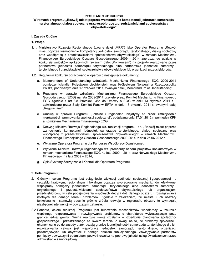 REGULAMIN KONKURSU W ramach programu „Rozwój miast poprzez wzmocnienie kompetencji jednostek samorządu terytorialnego, dialog społeczny oraz współpracę z przedstawicielami społeczeństwa obywatelskiego” I. Zasady Ogólne 1. Wstęp 1.1. Ministerstwo Rozwoju Regionalnego (zwane dalej „MRR”) jako Operator Programu „Rozwój miast poprzez wzmocnienie kompetencji jednostek samorządu terytorialnego, dialog społeczny oraz współpracę z przedstawicielami społeczeństwa obywatelskiego” w ramach Mechanizmu Finansowego Europejskiego Obszaru Gospodarczego 2009 - 2014 zaprasza do udziału w konkursie wniosków aplikacyjnych (zwanym dalej „Konkursem”) na projekty realizowane przez partnerstwa jednostek samorządu terytorialnego albo partnerstwa jednostek samorządu terytorialnego i przedstawicieli społeczeństwa obywatelskiego lub organizacji przedsiębiorców. 1.2. Regulamin konkursu opracowano w oparciu o następujące dokumenty: a. Memorandum of Understanding wdrażania Mechanizmu Finansowego EOG 2009-2014 pomiędzy Islandią, Księstwem Liechtenstein oraz Królestwem Norwegii a Rzeczpospolitą Polską, podpisanym dnia 17 czerwca 2011, zwanym dalej „Memorandum of Understanding”; b. Regulacje w sprawie wdrażania Mechanizmu Finansowego Europejskiego Obszaru Gospodarczego (EOG) na lata 2009-2014 przyjęte przez Komitet Mechanizmu Finansowego EOG zgodnie z art. 8.8 Protokołu 38b do Umowy o EOG w dniu 13 stycznia 2011 r. i zatwierdzone przez Stały Komitet Państw EFTA w dniu 18 stycznia 2011 r, zwanymi dalej „Regulacjami”; c. Umowę w sprawie Programu „Lokalne i regionalne inicjatywy na rzecz zmniejszenia nierówności i promowania spójności społecznej”, podpisaną dnia 17.04.2012 r. pomiędzy KPK a Komitetem Mechanizmu Finansowego EOG; d. Decyzję Ministra Rozwoju Regionalnego ws. realizacji programu pn. „Rozwój miast poprzez wzmocnienie kompetencji jednostek samorządu terytorialnego, dialog społeczny oraz współpracę z przedstawicielami społeczeństwa obywatelskiego” w ramach Mechanizmu Finansowego Europejskiego Obszaru Gospodarczego 2009-2014, z dnia 25.06.2012 r. e. Wytyczne Operatora Programu dla Funduszu Współpracy Dwustronnej, f. Wytyczne Ministra Rozwoju regionalnego ws. procedury naboru projektów konkursowych w ramach mechanizmu Finansowego EOG na lata 2009 – 2014 oraz Norweskiego Mechanizmu Finansowego na lata 2009 – 2014, g. Opis Systemy Zarządzania i Kontroli dla Operatora Programu. 2. Cele Programu 2.1 Głównym celem Programu jest osiągniecie większej spójności społecznej i gospodarczej na szczeblu krajowym, regionalnym i lokalnym poprzez wypracowanie mechanizmów efektywnej współpracy pomiędzy jednostkami samorządu terytorialnego albo jednostkami samorządu terytorialnego i przedstawicielami społeczeństwa obywatelskiego lub organizacjami przedsiębiorców, w celu podejmowania wspólnych decyzji dot. danego obszaru i rozwiązywania istotnych dla danego terenu problemów. Zgodnie z założeniem, że miasta i ich obszary funkcjonalne stanowią obecnie główne źródła rozwoju w regionach, obszary te wymagają niezbędnej interwencji w powyższym zakresie. 2.2 Ponadto, celem realizacji Programu jest budowanie mechanizmów współpracy w zakresie wspólnego rozpoznawania i rozwiązywania problemów o charakterze wykraczającym poza granice jednej gminy. Gmina realizuje swoje działania w dziedzinie planowania społecznogospodarczego i przestrzennego na swoim terenie. Z uwagi na to, że problemy społeczne i ekonomiczne co do zasady przekraczają granice jednej jednostki samorządu terytorialnego dla ich rozwiązywania celowa jest współpraca jednostek samorządu terytorialnego, organizacji pozarządowych lub obywateli z danego obszaru funkcjonalnego. Zawiązywanie partnerstw pomiędzy powyższymi podmiotami pozwoli również na poprawę jakości usług świadczonych przez administrację samorządową. 1 2.3 Produktami Programu będą w pierwszej kolejności zintegrowane strategie rozwoju miejskich obszarów funkcjonalnych i lokalne plany działania. Natomiast sieci współpracy będą służyły jako jedne z ważnych narzędzi do tworzenia tych produktów lub podnoszenia ich jakości. 3. Warunki podmiotowe udziału w konkursie 3.1 W konkursie mogą brać udział jednostki samorządu terytorialnego, działające w partnerstwie spełniające jednocześnie warunki określone w pkt 3.2 – 3.7, przy czym będą to: a. co najmniej dwie współpracujące jednostki samorządu terytorialnego, z których co najmniej jedna musi być miastem bądź gminą miejsko - wiejską, b. stowarzyszenie JST, w którym co najmniej jeden członek jest miastem/gminą miejsko-wiejską (albo miastem i gminą), c. związek komunalny, w którym co najmniej jeden członek jest miastem/ gminą miejsko wiejską (albo miastem i gminą). 3.2 Projekty muszą być realizowane przez partnerstwa jednostek samorządu terytorialnego, o których mowa w pkt. 3.3 albo partnerstwa jednostek samorządu terytorialnego i przedstawicieli społeczeństwa obywatelskiego lub organizacji przedsiębiorców, o których mowa w pkt. 3.4. 3.3 Partnerstwo jednostek samorządu terytorialnego zawiązane jest pomiędzy co najmniej dwoma jednostkami samorządu terytorialnego, z których przynajmniej jedna jest gminą miejską lub miejskowiejską. Gmina miejska lub miejsko-wiejska, powiat, stowarzyszenie JST, związek komunalny będzie liderem partnerstwa. 3.4 Partnerstwo jednostek samorządu terytorialnego i przedstawicieli społeczeństwa obywatelskiego lub organizacji przedsiębiorców zawiązane jest pomiędzy co najmniej dwoma jednostkami samorządu terytorialnego i co najmniej jednym z wymienionych podmiotów: organizacja społeczna, organizacja przedsiębiorców, uczelnia wyższa, inni partnerzy społeczni. Wymienione podmioty nie będące jednostkami samorządu terytorialnego realizują w ramach projektu zadania opiniodawczokonsultacyjne i nie partycypują w budżecie pr