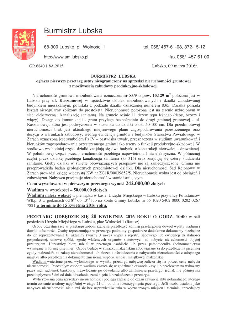 Burmistrz Lubska 68-300 Lubsko, pl. Wolno ci 1 tel. 068/ 457-61-08, 372-15-12 fax 068/ 457-61-00 http://www.um.lubsko.pl Lubsko, 09 marca 2016r. GR.6840.1.8A.2015 BURMISTRZ LUBSKA ogłasza pierwszy przetarg ustny nieograniczony na sprzeda nieruchomo ci gruntowej z mo liwo ci zabudowy produkcyjno-składowej. Nieruchomo gruntowa niezabudowana oznaczona nr 83/9 o pow. 10.129 m2 poło ona jest w Lubsku przy ul. Kasztanowej w s siedztwie działek niezabudowanych i działki zabudowanej budynkiem mieszkalnym, powstała z podziału działki oznaczonej numerem 83/5. Działka posiada kształt nieregularny zbli ony do prostok ta. Nieruchomo poło ona jest na terenie uzbrojonym w sie : elektryczn i kanalizacj sanitarn . Na gruncie ro nie 11 drzew typu le nego (d by, brzozy i wi zy). Dost p do komunikacji - grunt przylega bezpo rednio do drogi gminnej gruntowej - ul. Kasztanowej, która jest podwy szona w stosunku do działki o ok. 50-100 cm. Dla przedmiotowej nieruchomo ci brak jest aktualnego miejscowego planu zagospodarowania przestrzennego oraz decyzji o warunkach zabudowy, według ewidencji gruntów i budynków Starostwa Powiatowego w arach oznaczona jest symbolem Ps IV – pastwiska trwałe, przeznaczona w studium uwarunkowa i kierunków zagospodarowania przestrzennego gminy jako tereny o funkcji produkcyjno-składowej. W rodkowo wschodniej cz ci działki znajduj si dwa budynki o konstrukcji nietrwałej – drewnianej. W południowej cz ci przez nieruchomo przebiega napowietrzna linia elektryczna. W północnej cz ci przez działk przebiega kanalizacja sanitarna (ks 315) oraz znajduj si cztery studzienki sanitarne. Gleby działki w wietle obowi zuj cych przepisów nie s zanieczyszczone. Gmina nie przeprowadziła bada geologicznych przedmiotowej działki. Dla nieruchomo ci S d Rejonowy w arach prowadzi ksi g wieczyst KW nr ZG1R/00039652/5. Nieruchomo wolna jest od obci e i zobowi za . Nabywca przejmuje nieruchomo w stanie istniej cym. Cena wywoławcza w pierwszym przetargu wynosi 242.000,00 złotych Wadium w wysoko ci – 50.000,00 złotych Wadium nale y wpłaci w pieni dzu w kasie Urz du Miejskiego w Lubsku przy ulicy Powsta ców Wlkp. 3 w godzinach od 8oo do 133o lub na konto Gminy Lubsko nr 55 1020 5402 0000 0202 0267 7821 w terminie do 15 kwietnia 2016 roku. PRZETARG ODB DZIE SI 20 KWIETNIA 2016 ROKU O GODZ. 10:00 posiedze Urz du Miejskiego w Lubsku, plac Wolno ci 1 (Ratusz). w sali Osoby uczestnicz ce w przetargu zobowi zane s przedło y komisji przetargowej dowód wpłaty wadium i dowód to samo ci. Osoby reprezentuj ce w przetargu podmioty gospodarcze dodatkowo dokumenty niezb dne do ich reprezentowania tj. aktualny (wa ny 3 m-ce) wypis z rejestru s dowego lub ewidencji działalno ci gospodarczej, umow spółki, zgod wła ciwych organów statutowych na nabycie nieruchomo ci obj tej przetargiem. Uczestnicy bior udział w przetargu osobi cie lub przez pełnomocnika (pełnomocnictwo wymagane w formie pisemnej). Osoby b d ce w zwi zku mał e skim zobowi zane s do przedło enia pisemnej zgody mał onki/a na zakup nieruchomo ci lub zło enia o wiadczenia o nabywaniu nieruchomo ci z odr bnego maj tku albo przedło enia dokumentu zniesienia współwłasno ci maj tkowej mał e skiej. Wadium wniesione przez wyłonionego w wyniku przetargu nabywc zalicza si na poczet ceny nabycia nieruchomo ci. Pozostałym osobom wadium zwraca si w godzinach otwarcia kasy lub przelewem na wskazany przez nich rachunek bankowy, niezwłocznie po odwołaniu albo zamkni ciu przetargu, jednak nie pó niej ni przed upływem 3 dni od dnia odwołania, zamkni cia lub zako czenia przetargu. Wylicytowana cena sprzeda y nieruchomo ci podlega zapłacie do czasu zawarcia aktu notarialnego, którego termin zostanie ustalony najpó niej w ci gu 21 dni od dnia rozstrzygni cia przetargu. Je li osoba ustalona jako nabywca nieruchomo ci nie stawi si bez usprawiedliwienia w wyznaczonym miejscu i terminie, sprzedaj cy mo e odst pi od zawarcia umowy, a wpłacone wadium nie polega zwrotowi. Koszt aktu notarialnego ponosi nabywca. Ogłaszaj cy przetarg zastrzega sobie prawo odwołania przetargu z wa nych przyczyn. Nabycie nieruchomo ci przez cudzoziemca w rozumieniu ustawy z dnia 24 marca 1920r. o nabywaniu nieruchomo ci przez cudzoziemców (tekst jednolity Dz. U. z 2014r., poz. 1380) wymaga uzyskania zezwolenia Ministra Spraw Wewn trznych. W przypadku nieuzyskania zezwolenia przed zawarciem aktu notarialnego wpłacone wadium przepada na rzecz Gminy Lubsko. Przetarg odb dzie si na podstawie rozporz dzenia Rady Ministrów z dnia 14 wrze nia 2004r. w sprawie sposobu i trybu przeprowadzania przetargów oraz rokowa na zbycie nieruchomo ci (tekst jednolity Dz.U. z 2014r., poz. 1490). Szczegółowych informacji udziela Wydział Geodezji i Rolnictwa Urz du Miejskiego w Lubsku – Ratusz (p. 26), tel. 68 457-61-27 i 68 457-61-28 i na stronie internetowej www.bip.lubsko.pl. Burmistrz Lubska Lech Jurkowski
