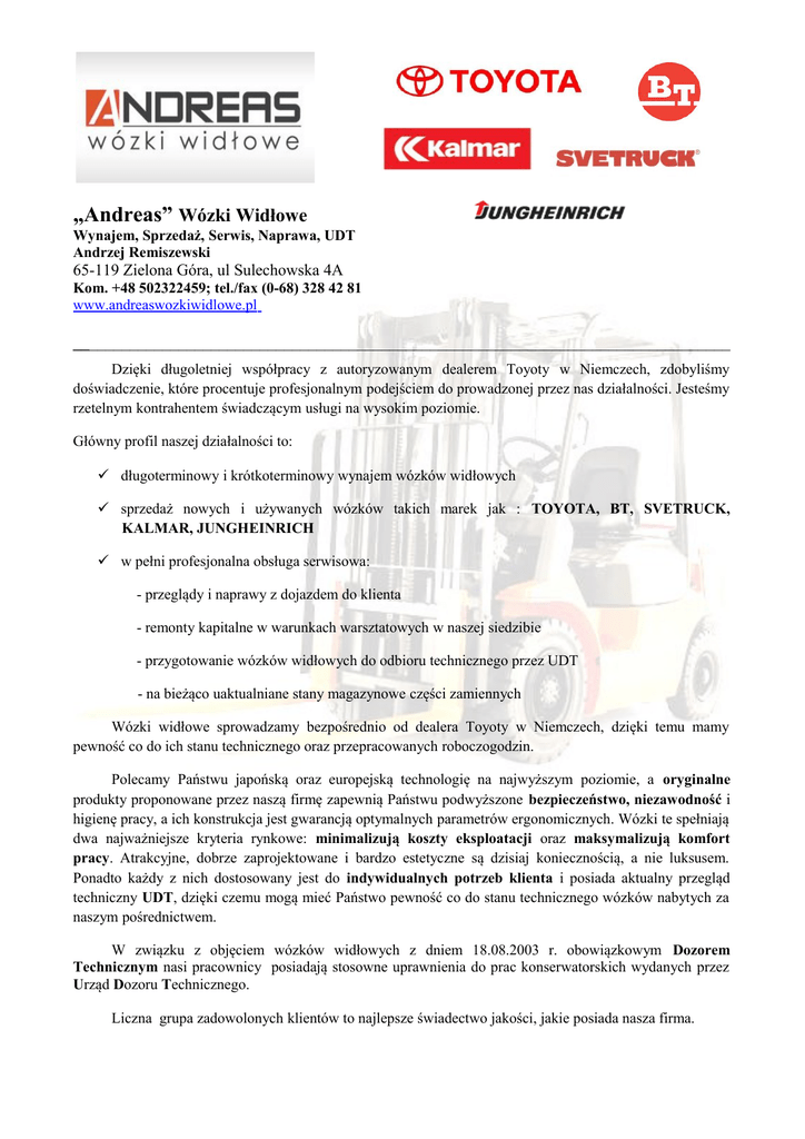 „Andreas” Wózki Widłowe Wynajem, Sprzedaż, Serwis, Naprawa, UDT Andrzej Remiszewski 65-119 Zielona Góra, ul Sulechowska 4A Kom. +48 502322459; tel./fax (0-68) 328 42 81 www.andreaswozkiwidlowe.pl _________________________________________________________________________________ Dzięki długoletniej współpracy z autoryzowanym dealerem Toyoty w Niemczech, zdobyliśmy doświadczenie, które procentuje profesjonalnym podejściem do prowadzonej przez nas działalności. Jesteśmy rzetelnym kontrahentem świadczącym usługi na wysokim poziomie. Główny profil naszej działalności to: długoterminowy i krótkoterminowy wynajem wózków widłowych sprzedaż nowych i używanych wózków takich marek jak : TOYOTA, BT, SVETRUCK, KALMAR, JUNGHEINRICH w pełni profesjonalna obsługa serwisowa: - przeglądy i naprawy z dojazdem do klienta - remonty kapitalne w warunkach warsztatowych w naszej siedzibie - przygotowanie wózków widłowych do odbioru technicznego przez UDT - na bieżąco uaktualniane stany magazynowe części zamiennych Wózki widłowe sprowadzamy bezpośrednio od dealera Toyoty w Niemczech, dzięki temu mamy pewność co do ich stanu technicznego oraz przepracowanych roboczogodzin. Polecamy Państwu japońską oraz europejską technologię na najwyższym poziomie, a oryginalne produkty proponowane przez naszą firmę zapewnią Państwu podwyższone bezpieczeństwo, niezawodność i higienę pracy, a ich konstrukcja jest gwarancją optymalnych parametrów ergonomicznych. Wózki te spełniają dwa najważniejsze kryteria rynkowe: minimalizują koszty eksploatacji oraz maksymalizują komfort pracy. Atrakcyjne, dobrze zaprojektowane i bardzo estetyczne są dzisiaj koniecznością, a nie luksusem. Ponadto każdy z nich dostosowany jest do indywidualnych potrzeb klienta i posiada aktualny przegląd techniczny UDT, dzięki czemu mogą mieć Państwo pewność co do stanu technicznego wózków nabytych za naszym pośrednictwem. W związku z objęciem wózków widłowych z dniem 18.08.2003 r. obowiązkowym Dozorem Technicznym nasi pracownicy posiadają stosowne uprawnienia do prac konserwatorskich wydanych przez Urząd Dozoru Technicznego. Liczna grupa zadowolonych klientów to najlepsze świadectwo jakości, jakie posiada nasza firma. W naszej ofercie posiadamy nowe i używane wózki widłowe zróżnicowane pod względem tonażu, typów, funkcji i wysokości podnoszenia: I. Wózki spalinowe: TOYOTA - od 1 do 8 ton udźwigu ( LPG, DIESEL ) SVETRUCK, KALMAR - wózki wysokotonażowe o udźwigu od 8 do 52 ton ( DIESEL ) II. Wózki elektryczne takich firm jak TOYOTA, BT, JUNGHEINRICH: - wózki elektryczne z przeciwwagą 3 i 4 kołowe o udźwigu od 1 do 5 ton. - wózki elektryczne z masztem - wózki wysokiego składowania - wózki paletowe WYNAJEM WÓZKÓW WIDŁOWYCH: Wynajem staje się coraz bardziej powszechną formą finansowania użytkowanych przez firmy maszyn. W krajach Europy zachodniej stanowi on już ponad 60% dostaw nowych urządzeń. W ostatnich latach w Polsce zaobserwowano zdecydowany wzrost popularności tego typu formy finansowania, co oznacza, iż również w naszym kraju przekonano się do wynajmu, który w swojej prostocie jest zdecydowanie wygodniejszy dla klienta niż zakup nowego wózka. Proponujemy następujące możliwości wynajmu nowych jak i używanych wózków widłowych: wynajem krótkoterminowy ( od doby do 30 dni ) wynajem średnioterminowy ( powyżej 30 dni do 12 miesięcy ) wynajem długoterminowy ( powyżej 12 miesięcy ) Możliwość Wynajmu Krótko i Średnioterminowego pozwala menadżerowi firmy szybko zareagować i podejmować odpowiednie decyzje w planowej realizacji celów poprzez dostosowywanie wielkość floty wózków do chwilowo zwiększonych obciążeń i nieprzewidzianych okoliczności. Wynajem Długoterminowy daje firmie duże korzyści płynące z użytkowania wózków, a jednocześnie ogranicza problemy wynikające z własnego ich posiadania. Jest to korzystna forma finansowania własnego biznesu bez ponoszenia nakładów na środki trwałe i zarządzanie nimi. Wózek widłowy zawsze dopasowujemy do osobistych preferencji klienta oraz do specyfiki warunków w jakich przyjdzie mu pracować. Poddawany on jest okresowym przeglądom oraz posiada aktualne badania techniczne dopuszczające go do ruchu wydane przez Urząd Dozoru Technicznego. Wynajem realizujemy w opcji z pełnym serwisem ( w jego cenie są wszystkie koszty eksploatacji wózka oprócz kosztu zużytych opon i wideł ) oraz standardowej ( cena nie zwiera kosztów materiałów eksploatacyjnych, a także kosztu zużytych opon i wideł ). Tak naprawdę Wynajem Długoterminowy swojej formie porównywalny jest do leasingu z tą jednak różnicą, że w przypadku full opcji mają Państwo zapewniony pełen serwis wózka widłowego w trakcie całego czasu trwania umowy, a w przypadku leasingu ponoszą Państwo koszty okresowych przeglądów, wymiany płynów eksploatacyjnych, napraw, przeglądów UDT i tym podobnych. Tak więc zdecydowanie korzystniejszą formą finansowania jest Wynajem Długoterminowy. Korzyści wynajmu długoterminowego oferowanego przez „ANDREAS” Wózki Widłowe: − zerowe początkowe zaangażowanie kapitału własnego − nienaruszanie zdolności kredytowej Klienta − przejrzystość kosztów utrzymania taboru wózków − brak konieczności utrzymywania przeszkolonych mechaników, budynków warsztatowych, odpowiedniego zapasu części zamiennych − uproszczenie procedur księgowych – jedna faktura miesięczne za cały eksploatowany park maszynowy − zaliczanie kwot za wynajem w koszty uzyskania przychodu − brak problemów związanych ze sprzedażą zużytego i niepotrzebnego sprzętu − pełna dyspozycyjność maszyn oraz opieka techniczna zakładająca podstawienie wózka zastępczego w przypadku awarii Reasumując, wynajem długoterminowy jest formą finansowania, która jest bardzo korzystna, nie tylko ze względu na niższe koszty użytkowania, ale 