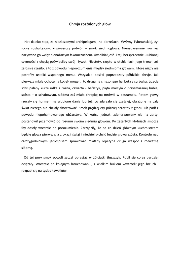 Chryja rozżalonych głów Het daleko stąd, za niezliczonymi archipelagami, na obrzeżach Wyżyny Tybetańskiej, żył sobie rozhultajony, krwiożerczy potwór – smok siedmiogłowy. Nienadaremnie również nazywano go wciąż nienażartym łakomczuchem. Uwielbiał jeść i tej bezsprzecznie ulubionej czynności z chęcią poświęciłby swój żywot. Niestety, często w otchłaniach jego trzewi coś żałośnie rzęziło, a to z powodu nieporozumienia między siedmioma głowami, które nigdy nie potrafiły ustalić wspólnego menu. Wszystkie posiłki poprzedzały półdzikie chryje. Jak pierwsza miała ochotę na kogel- mogel , to druga na smażonego halibuta z surówką, trzecia schrupałaby kurze udka z rożna, czwarta - befsztyk, piąta marzyła o przysmażanej hubie, szósta – o schabowym, siódma zaś miała chrapkę na mrówki w beszamelu. Potem głowy rzucały się hurmem na ulubione dania lub też, co zdarzało się częściej, obrażone na cały świat niczego nie chciały skosztować. Smok prędzej czy później sczezłby z głodu lub padł z powodu niepohamowanego obżarstwa. W końcu jednak, zdenerwowany nie na żarty, postanowił przemówić do rozumu swoim siedmiu głowom. Po zażartych kłótniach smocze łby doszły wreszcie do porozumienia. Zarządziły, że na co dzień głównym kuchmistrzem będzie głowa pierwsza, a z okazji świąt i niedziel pichcić będzie głowa szósta. Kontrolę nad całotygodniowym jadłospisem sprawować miałaby łepetyna druga wespół z rozważną siódmą. Od tej pory smok powoli zaczął obrastać w żółciutki tłuszczyk. Robił się coraz bardziej ociężały. Wreszcie po kolejnym łasuchowaniu, z wielkim hukiem wystrzelił jego brzuch i rozpadł się na tysiąc kawałków.