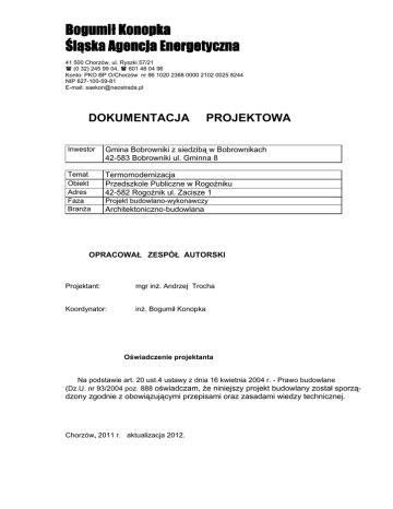 Bogumił Konopka Konopka Śląska Agencja Agencja Energetyczna 41 500 Chorzów, ul. Ryszki 57/21 (0 32) 245 99 04, 601 48 04 96 Konto: PKO BP O/Chorzów nr 86 1020 2368 0000 2102 0025 8244 NIP 627-100-59-81 E-mail: [email protected] DOKUMENTACJA PROJEKTOWA Inwestor Gmina Bobrowniki z siedzibą w Bobrownikach 42-583 Bobrowniki ul. Gminna 8 Temat Obiekt Adres Faza Branża Termomodernizacja Przedszkole Publiczne w Rogoźniku 42-582 Rogoźnik ul. Zacisze 1 Projekt budowlano-wykonawczy Architektoniczno-budowlana OPRACOWAŁ ZESPÓŁ AUTORSKI Projektant: mgr inż. Andrzej Trocha Koordynator: inż. Bogumił Konopka Oświadczenie projektanta Na podstawie art. 20 ust.4 ustawy z dnia 16 kwietnia 2004 r. - Prawo budowlane (Dz.U. nr 93/2004 poz. 888 oświadczam, że niniejszy projekt budowlany został sporzą- dzony zgodnie z obowiązującymi przepisami oraz zasadami wiedzy technicznej. Chorzów, 2011 r. aktualizacja 2012. Projekt budowlany termomodernizacji budynku Przedszkola Publicznego w Rogoźniku Spis treści Opis techniczny projektu str. 3 1. Sytuacja S - 01 1. Elewacje południowa i zachodnia P - 01 2. Elewacje wschodnia i północna P - 02 3. Zestawienie stolarki P - 03 1. U1talenia ogólne Autor opracowania: Śląska Agencja Energetyczna 2 Projekt budowlany termomodernizacji budynku Przedszkola Publicznego w Rogoźniku 1.1. Pod1tawa opracowania Podstawą opracowania są: - umowa z inwestorem - inwentaryzacja własna obiektu dla potrzeb projektowych - Rozporządzenie Ministra Infrastruktury z dnia 12 kwietnia 2002 r. (Dz.U. nr 75/2002., poz. 690) w sprawie warunków technicznych, jakim powinny odpowiadać budynki i ich usytuowanie - obowiązujące normy, normatywy i przepisy obowiązujące w budownictwie 1.2. Przedmiot opracowania Przedmiotem opracowania jest termomodernizacja budynku Przedszkola Publicznego w Rogoźniku obejmujący: - wymianę drewnianej stolarki okiennej i drzwiowej - ocieplenie ścian - wymianę poszycia dachu - ocieplenie stropu ostatniej kondygnacji - prace budowlane związane z ociepleniem 1.3. Cel i zakre1 opracowania Celem opracowania jest poprawa parametrów termoizolacyjności przegród budowlanych w obiekcie związanych z wymogami ochrony środowiska i czynnikami ekonomicznymi. 1.4. Dane ewidencyjne - obiekt: Przedszkole Publiczne w Rogoźniku - własność obiektu: Mienie Skarbu Państwa, własność Gminy Bobrowniki - inwestor: Gmina Bobrowniki z siedzibą w Bobrownikach 42-583 Bobrowniki ul. Gminna 8 - adres budowy: 42-582 Rogoźnik ul. Zacisze 1 - działka 1146/6 2. Opi1 techniczny Autor opracowania: Śląska Agencja Energetyczna 3 Projekt budowlany termomodernizacji budynku Przedszkola Publicznego w Rogoźniku 2.1. Stan i1tniejący 2.1.1. Architektura Jest to budynek konstrukcji murowanej jednokondygnacyjny, częściowo podpiwniczony. Ściany murowane z cegły pełnej. Strop ostatniej kondygnacji typu Kleina. Dach konstrukcji drewnianej kryty papą. Ogólny stan techniczny budynku dobry. Podstawowe dane budynku: Nr Obiekt Powierzchnia 1 Przedszkole Kubatura zabudowy m2 użytkowa m2 całkowita m3 329 266 1 230 Wentylacja Rok ogrzewana grawitacyjna budowy m3 m3/h 907 907 1957 Ciepłochronność przegród budowlanych nie spełnia aktualnych wymagań technicznych ( za wyjątkiem nowych okien i drzwi). 2.1.2. Kolory1tyka Okna białe Drzwi wejściowe brązowe Ściany szare zabrudzone Dach szary 2.2. Stan projektowany 2.2.1. Okna Przewiduje się wymianę jednego okna drewnianego na okno PCV z szybą zespoloną. Projektowany współczynnik przenikania ciepła U = 1,30 W/m2K. Parapety zewnętrzne z blachy stalowej ocynkowanej powlekanej w brązowym. 2.2.2. Drzwi zewnętrzne Przewiduje się wymianę drzwi zewnętrznych gospodarczych na drzwi stalowe ocieplane. Projektowany współczynnik przenikania ciepła U = 2,00 W/m2K. 2.2.3. Ściany zewnętrzne Przewiduje się ocieplenie ścian zewnętrznych metodą lekką-mokrą wg systemu Caparol lub zamiennego z zastosowaniem styropianu grafitowego grubości 10 cm. Styropian powinien posiadać współczynnik przewodności cieplnej λ ≤ 0,031 W/mK. Odporność ppoż. - NRO. Warstwa elewacyjna - tynk silikonowy wodozmywalny. Projektowany współczynnik przenikania ciepła: U = 0,24 W/m2K Kolory wg rysunków - ostateczny dobór po wyłonieniu wykonawcy 2.2.4. Ościeża Autor opracowania: Śląska Agencja Energetyczna 4 Projekt budowlany termomodernizacji budynku Przedszkola Publicznego w Rogoźniku Przewiduje się ocieplenie ościeży metodą lekką-mokrą wg systemu Caparol lub zamiennego z zastosowaniem styropianu grafitowego grubości 3 cm. Styropian powinien posiadać współczynnik przewodności cieplnej λ ≤ 0,031 W/mK. Warstwa elewacyjna - tynk silikonowy wodozmywalny Kolory wg rysunków - ostateczny dobór po wyłonieniu wykonawcy 2.2.5. Ściany fundamentowe i cokół Ściany w gruncie i cokół Przewiduje się ocieplenie ścian fundamentowych do poziomu ław i cokołu metodą lekką-mokrą wg systemu Caparol lub zamiennego z zastosowaniem polistyrenu ekstrudowanego grubości 10 cm. Polistyren powinien posiadać współczynnik przewodności cieplnej λ ≤ 0,032 W/mK. Odporność ppoż. - NRO. Warstwa elewacyjna cokołu - płytki z piaskowca łamanego. Wyprawa w gruncie z masy szpachlowej polimerowej wodoodpornej. Projektowany współczynnik przenikania ciepła: U = 0,25 W/m2K Wokół budynku chodnik z kostki brukowej i opaska rozbryzgowa. 2.2.6. Dach i 1trop o1tatniej kondygnacji Dach Przewiduje się: - demontaż istniejącej papy - demontaż deskowania dachu i podbitek okapów - impregnacja ppoż. konstrukcji więźby dachowej - wykonanie deskowania dachu z płyt OSB 3 - pokrycie dachu papą termozgrzewalną podkładowa i wierzchniego krycia Strop pod dachem Przewiduje się: - demontaż istniejącego ocieplenia - wykonanie szlichty betonowej 2 cm - montaż membrany paroszczelnej 0,20 mm - montaż warstwy izolacyjnej ze styropianu grubości 15 cm - wykonanie warstwy betonowej dociskowej grubości 4 cm z siatką przeci