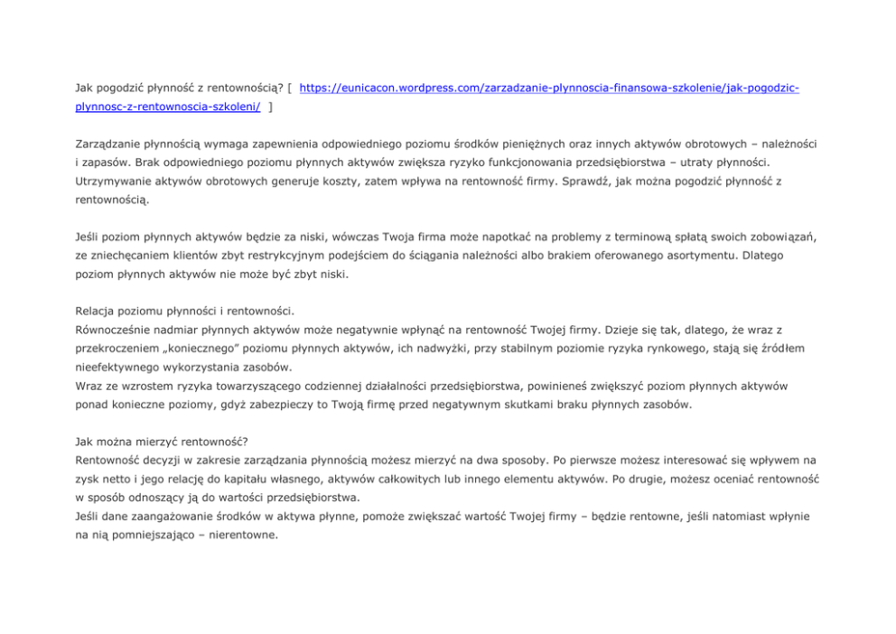 Jak pogodzić płynność z rentownością? [ https://eunicacon.wordpress.com/zarzadzanie-plynnoscia-finansowa-szkolenie/jak-pogodzicplynnosc-z-rentownoscia-szkoleni/ ] Zarządzanie płynnością wymaga zapewnienia odpowiedniego poziomu środków pieniężnych oraz innych aktywów obrotowych – należności i zapasów. Brak odpowiedniego poziomu płynnych aktywów zwiększa ryzyko funkcjonowania przedsiębiorstwa – utraty płynności. Utrzymywanie aktywów obrotowych generuje koszty, zatem wpływa na rentowność firmy. Sprawdź, jak można pogodzić płynność z rentownością. Jeśli poziom płynnych aktywów będzie za niski, wówczas Twoja firma może napotkać na problemy z terminową spłatą swoich zobowiązań, ze zniechęcaniem klientów zbyt restrykcyjnym podejściem do ściągania należności albo brakiem oferowanego asortymentu. Dlatego poziom płynnych aktywów nie może być zbyt niski. Relacja poziomu płynności i rentowności. Równocześnie nadmiar płynnych aktywów może negatywnie wpłynąć na rentowność Twojej firmy. Dzieje się tak, dlatego, że wraz z przekroczeniem „koniecznego” poziomu płynnych aktywów, ich nadwyżki, przy stabilnym poziomie ryzyka rynkowego, stają się źródłem nieefektywnego wykorzystania zasobów. Wraz ze wzrostem ryzyka towarzyszącego codziennej działalności przedsiębiorstwa, powinieneś zwiększyć poziom płynnych aktywów ponad konieczne poziomy, gdyż zabezpieczy to Twoją firmę przed negatywnym skutkami braku płynnych zasobów. Jak można mierzyć rentowność? Rentowność decyzji w zakresie zarządzania płynnością możesz mierzyć na dwa sposoby. Po pierwsze możesz interesować się wpływem na zysk netto i jego relację do kapitału własnego, aktywów całkowitych lub innego elementu aktywów. Po drugie, możesz oceniać rentowność w sposób odnoszący ją do wartości przedsiębiorstwa. Jeśli dane zaangażowanie środków w aktywa płynne, pomoże zwiększać wartość Twojej firmy – będzie rentowne, jeśli natomiast wpłynie na nią pomniejszająco – nierentowne. Wpływ płynnych aktywów na wartość przedsiębiorstwa Poszczególne elementy wpływające na decyzje w zakresie zarządzania płynnością, wpływają na poziom wolnych przepływów pieniężnych CF, a przez to na wartość przedsiębiorstwa. Jaki poziom aktywów powinieneś wybrać? Załóżmy, że Twoja firma stoi przed wyborem, jak duży poziom aktywów płynnych zaangażować. Wiadomo, że większemu poziomowi należności i zapasów (wynikających z bardziej liberalnego podejścia do udzielania kredytu kupieckiego i proponowania krótszego oczekiwania na realizację zamówień od klientów), towarzyszyć będzie większa sprzedaż, ale także większe koszty Zbyt mały poziom płynnych aktywów ogranicza poziom sprzedaży odstraszając klientów zbyt restrykcyjną polityką udzielania kredytu kupieckiego. Z drugiej strony zbyt duże zaangażowanie w aktywa płynne w opcji z „dużym” poziomem aktywów płynnych, stało się podstawą do wyższej niż w wariancie ze średnim poziomem, przychodów ze sprzedaży, lecz równocześnie wygenerowało na tyle wysokie koszty, że pozytywny efekt przyrostu sprzedaży został „przejedzony”. Powyższe zagadnienia szczegółowo omawiane są na szkoleniu: https://eunicacon.wordpress.com/zarzadzanie-plynnoscia-finansowa-szkolenie/ Zarządzanie płynnością finansową zawiera w sobie zbiór fundamentalnych narzędzi umożliwiających oszacowanie wpływu działań biznesowych w zakresie kształtowania aktywów płynnych na wartość przedsiębiorstwa. Proponuję szkolenie, dzięki któremu będziesz umiał zarządzać elementami aktywów płynnych takich jak środki pieniężne, należności i zapasy w sposób kreujący wartość przedsiębiorstwa (bogactwo właściciela). W trakcie tego szkolenia wszystkie przykłady i analizowane przypadki opierają się na danych bliskich rzeczywistości. Uczestnik będzie wdrażać i pogłębiać umiejętności: • zarządzania środkami pieniężnymi, doboru właściwego modelu zarządzania gotówką w zależności od sytuacji (min. model BaumolaAlaisa-Tobina, model Beranka, model Millera-Orra, model Stone’a, itp.) • oceniania przyszłych potrzeb gotówkowych i dodatkowych niezbędnych środków z wykorzystaniem preliminowania środków pieniężnych • szacowania wolnych przepływów pieniężnych, • brania pod uwagę w decyzjach ryzyka i niepewności w decyzjach związanych z doborem strategii zarządzania płynnymi aktywami, • doboru strategii inwestowania w aktywa płynne w zależności od specyfiki przedsiębiorstwa, • doboru najodpowiedniejszej strategii finansowania aktywów płynnych w zależności od charakterystyk biznesu • odpowiedniej wyceny decyzji w zakresie polityki kredytu kupieckiego i zarządzania należnościami – metoda pośrednia i bezpośrednia (uproszczona i przyrostowa), • najlepszego z punktu widzenia interesów przedsiębiorstwa zarządzania zapasami materiałów i surowców do produkcji, zapasów produkcji w toku, zapasów wyrobów gotowych, z uwzględnieniem metody ABC, modeli EOQ i VBEOQ, modeli POQ i VBPOQ Nasze szkolenie w praktyczny i skuteczny sposób rozwija umiejętności analitycznego myślenia, łącząc je z holistycznym spojrzeniem na przedsiębiorstwo z perspektywy jego wartości oraz z uwzględnieniem etapu rozwoju branży i wpływu czynników spoza przedsiębiorstwa. Szkolenie zalecam przede wszystkim osobom, które są zainteresowane zrozumieniem mechanizmów związanych z nowoczesnym zarządzaniem płynnością finansową zachodzących w przedsiębiorstwie. Zapraszam pracowników z wszystkich działów przedsiębiorstw, nie tylko działów bezpośrednio zarządzających finansami. Szczególne zaproszenie kieruję również do właścicieli małych i średnich przedsiębiorstw, którzy zainteresowani są poznaniem podstaw wpływu decyzji biznesowych na tworzenie wartości firmy. PROGRAM SZK