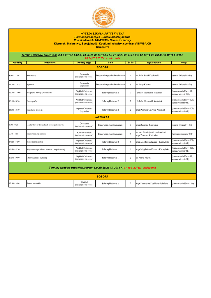 WYŻSZA SZKOŁA ARTYSTYCZNA Harmonogram zajęć - Studia niestacjonarne Rok akademicki 2014/2015 - Semestr zimowy Kierunek: Malarstwo, Specjalność: Kostium i rekwizyt sceniczny/ III WSA CH Semestr V Terminy zjazdów głównych: 3,4,5 X; 10,11,12 X; 24,25,26 X; 14,15,16 XI; 21,22,23 XI; 5,6,7 XII; 12,13,14 XII 2014r.; 9,10,11 I 2015r. 23,24,25 I 2015r. - zaliczenia Godziny Przedmiot Rodzaj zajęć Sala ECTS Wykładowca Uwagi SOBOTA Ćwiczenia (zaliczenie na ocenę) Pracownia rysunku i malarstwa 4 dr. hab. Rafał Kochański (suma ćwiczeń=36h) Ćwiczenia (egzamin) Pracownia rysunku i malarstwa 3 dr Jerzy Korput (suma ćwiczeń=27h) Reżyseria barwy i przestrzeni Wykład/Ćwiczenia (zaliczenie na ocenę) Sala wykładowa 2 2 dr hab. Romuald Woźniak (suma wykładów = 6h, suma ćwiczeń=12h) 15:00-16:30 Scenografia Wykład/Ćwiczenia (zaliczenie na ocenę) Sala wykładowa 2 2 dr hab. Romuald Woźniak (suma wykładów = 12h, suma ćwiczeń=6h) 16:40-18:10 Podstawy filozofii Wykład/Ćwiczenia (egzamin) Sala wykładowa 2 2 mgr Patrycja Guevara-Woźniak (suma wykładów = 12h, suma ćwiczeń=6h) 8.00 - 11.00 Malarstwo 11.00 - 13.15 Rysunek 13.30 - 15:00 NIEDZIELA 8.00 - 9.30 Malarstwo w technikach scenograficznych Ćwiczenia (zaliczenie na ocenę) Pracownia charakteryzacji 2 mgr Zuzanna Kulawiak (suma ćwiczeń=18h) 9.30-14.00 Pracownia dyplomowa Konserwatorium (zaliczenie na ocenę) Pracownia charakteryzacji 8 dr hab. Maciej Aleksandrowicz/ mgr Zuzanna Kulawiak (konserwatorium=54h) 14:20-15:50 Historia malarstwa Wykład/Ćwiczenia (zaliczenie na ocenę) Sala wykładowa 2 1 mgr Magdalena Kucza - Kuczyńska (suma wykładów = 12h, suma ćwiczeń=6h) 15:50-17:20 Wybrane zagadnienia ze sztuki współczesnej Wykład/Ćwiczenia (zaliczenie na ocenę) Sala wykładowa 1 2 mgr Magdalena Kucza - Kuczyńska (suma wykładów = 12h, suma ćwiczeń=6h) 17:30-19:00 Rozważania o kulturze Wykład/Ćwiczenia (zaliczenie na ocenę) Sala wykładowa 1 2 dr Maria Piątek (suma wykładów = 9h, suma ćwiczeń=9h) Terminy zjazdów uzupełniających: 8,9 XI; 20,21 XII 2014 r.; 17,18 I 2015r. - zaliczenia SOBOTA 13.30-18:00 Prawo autorskie Wykład (zaliczenie na ocenę) Sala wykładowa 2 2 mgr Katarzyna Kosińska-Polańska (suma wykładów =18h)
