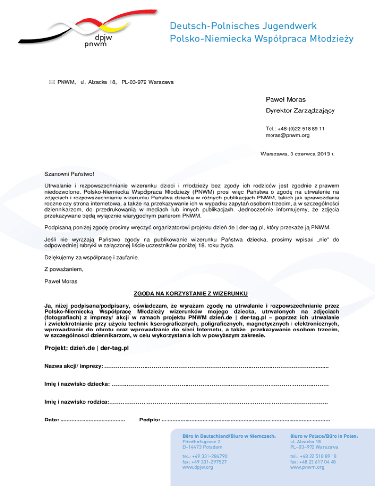 PNWM, ul. Alzacka 18, PL-03-972 Warszawa Paweł Moras Dyrektor Zarządzający Tel.: +48-(0)22-518 89 11 [email protected] Warszawa, 3 czerwca 2013 r. Szanowni Państwo! Utrwalanie i rozpowszechnianie wizerunku dzieci i młodzieŜy bez zgody ich rodziców jest zgodnie z prawem niedozwolone. Polsko-Niemiecka Współpraca MłodzieŜy (PNWM) prosi więc Państwa o zgodę na utrwalenie na zdjęciach i rozpowszechnianie wizerunku Państwa dziecka w róŜnych publikacjach PNWM, takich jak sprawozdania roczne czy strona internetowa, a takŜe na przekazywanie ich w wypadku zapytań osobom trzecim, a w szczególności dziennikarzom, do przedrukowania w mediach lub innych publikacjach. Jednocześnie informujemy, Ŝe zdjęcia przekazywane będą wyłącznie wiarygodnym parterom PNWM. Podpisaną poniŜej zgodę prosimy wręczyć organizatorowi projektu dzień.de | der-tag.pl, który przekaŜe ją PNWM. Jeśli nie wyraŜają Państwo zgody na publikowanie wizerunku Państwa dziecka, prosimy wpisać „nie” do odpowiedniej rubryki w załączonej liście uczestników poniŜej 18. roku Ŝycia. Dziękujemy za współpracę i zaufanie. Z powaŜaniem, Paweł Moras ZGODA NA KORZYSTANIE Z WIZERUNKU Ja, niŜej podpisana/podpisany, oświadczam, Ŝe wyraŜam zgodę na utrwalanie i rozpowszechnianie przez Polsko-Niemiecką Współpracę MłodzieŜy wizerunków mojego dziecka, utrwalonych na zdjęciach (fotografiach) z imprezy/ akcji w ramach projektu PNWM dzień.de | der-tag.pl – poprzez ich utrwalanie i zwielokrotnianie przy uŜyciu technik kserograficznych, poligraficznych, magnetycznych i elektronicznych, wprowadzanie do obrotu oraz wprowadzanie do sieci Internetu, a takŜe przekazywanie osobom trzecim, w szczególności dziennikarzom, w celu wykorzystania ich w powyŜszym zakresie. Projekt: dzień.de | der-tag.pl Nazwa akcji/ imprezy: …………………………………………………………………………………………………......... Imię i nazwisko dziecka: ……………………………………………………………………………………………………. Imię i nazwisko rodzica:…………………………………………………………………………………………………….. Data: ......................................... Podpis: ...........................................................................................................