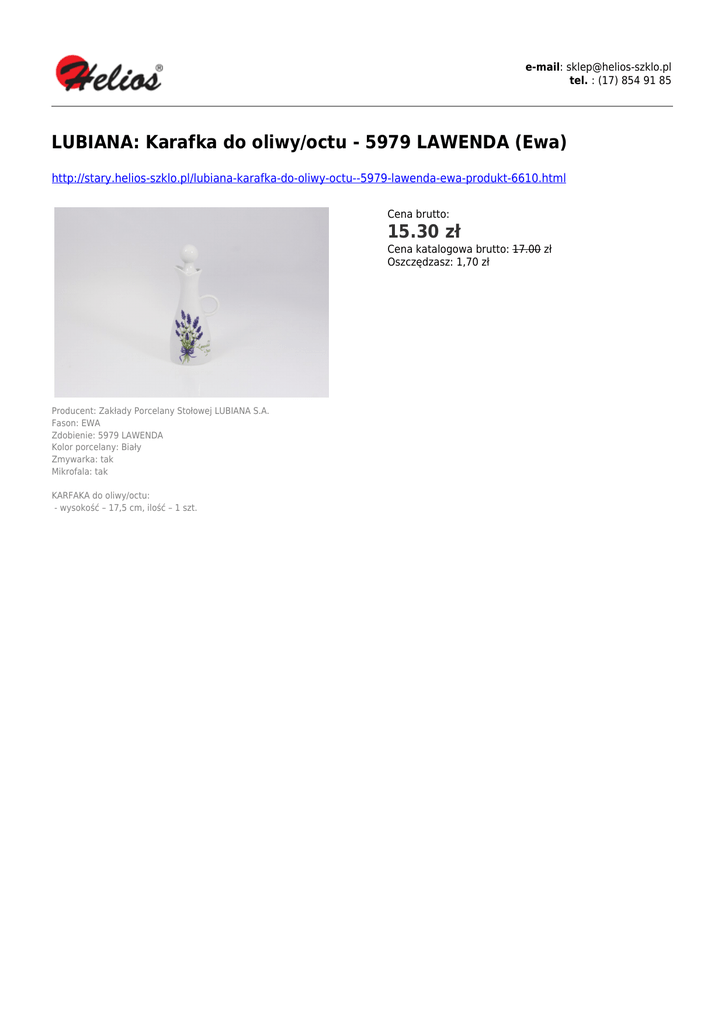 e-mail: [email protected] tel. : (17) 854 91 85 LUBIANA: Karafka do oliwy/octu - 5979 LAWENDA (Ewa) http://stary.helios-szklo.pl/lubiana-karafka-do-oliwy-octu--5979-lawenda-ewa-produkt-6610.html Cena brutto: 15.30 zł Cena katalogowa brutto: 17.00 zł Oszczędzasz: 1,70 zł Producent: Zakłady Porcelany Stołowej LUBIANA S.A. Fason: EWA Zdobienie: 5979 LAWENDA Kolor porcelany: Biały Zmywarka: tak Mikrofala: tak KARFAKA do oliwy/octu: - wysokość – 17,5 cm, ilość – 1 szt.